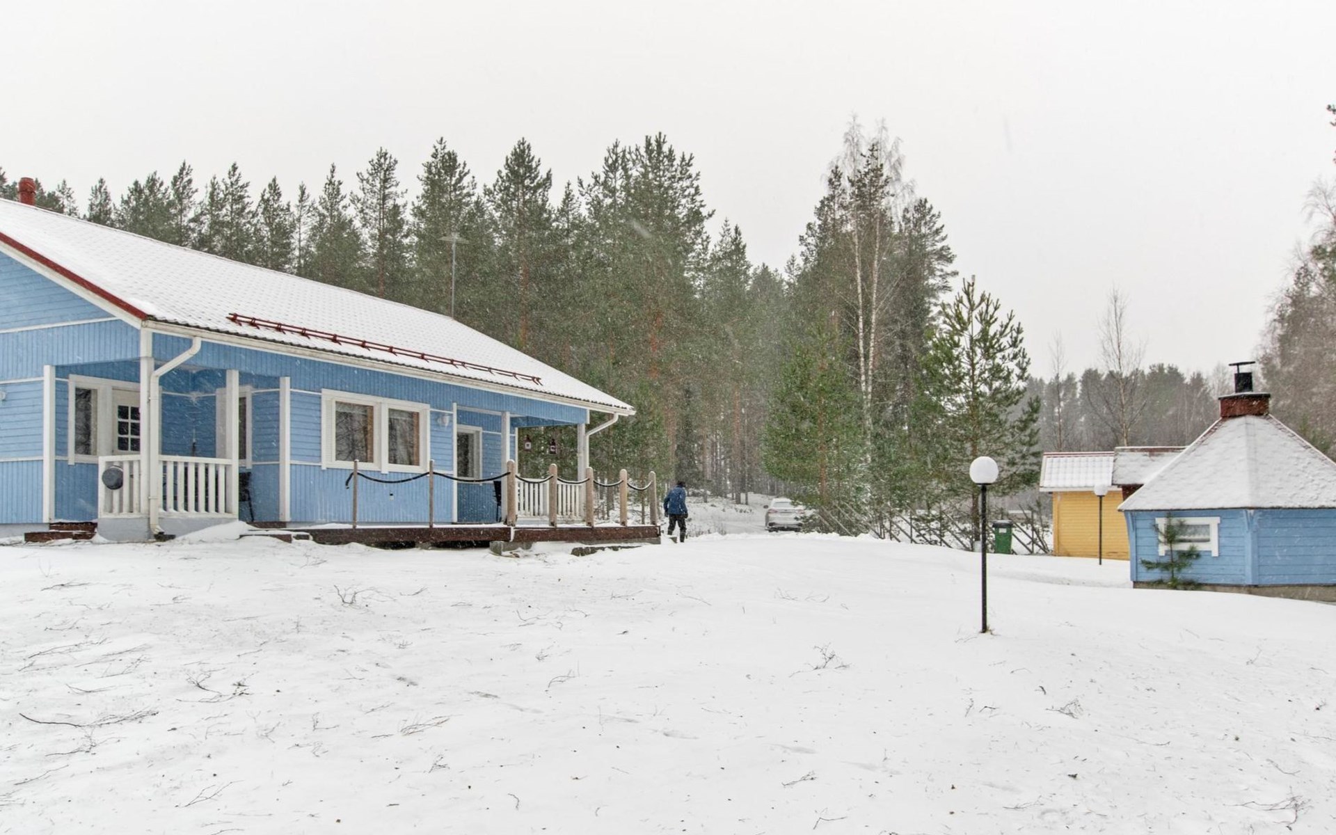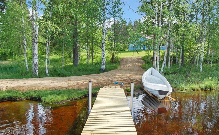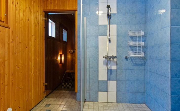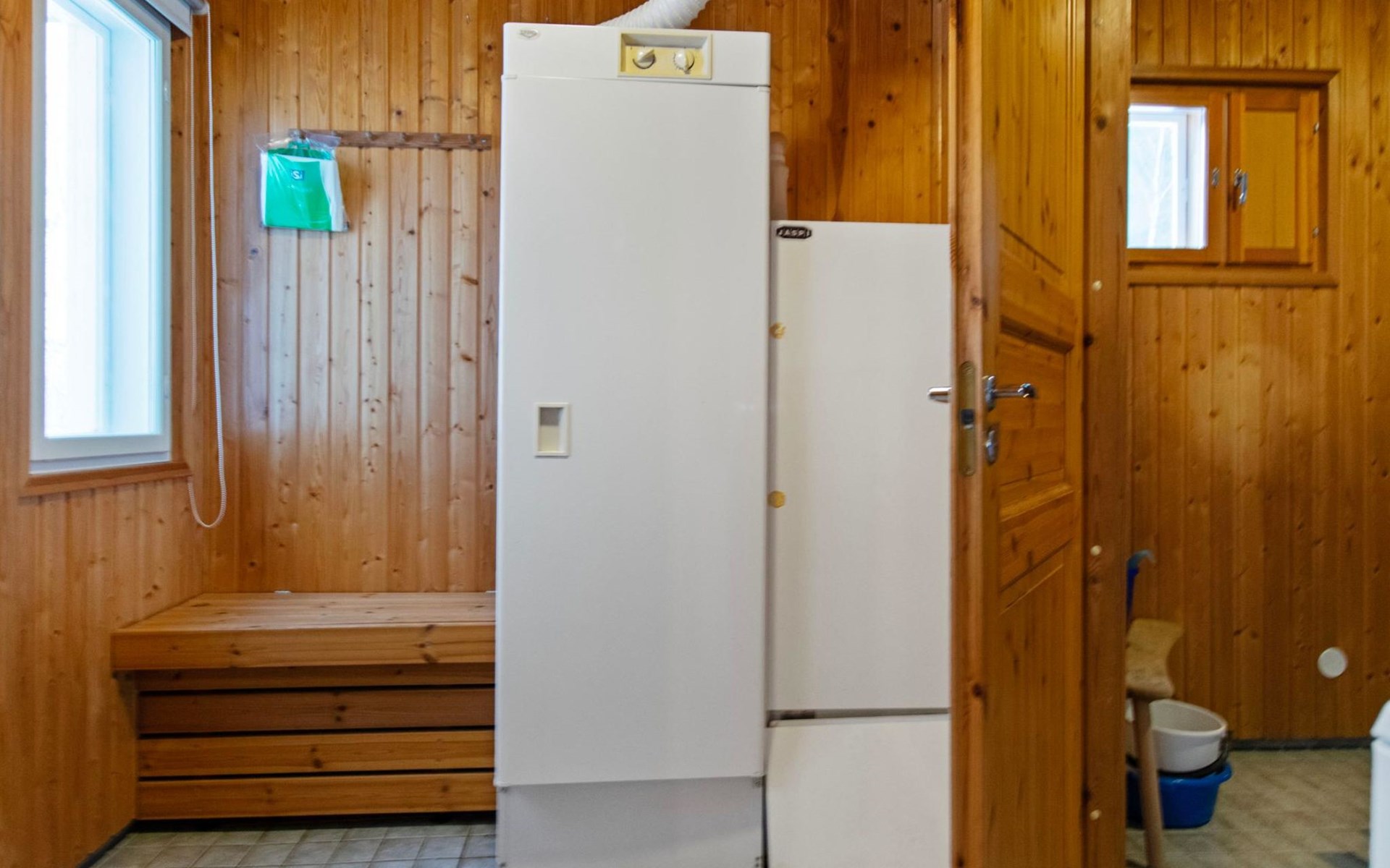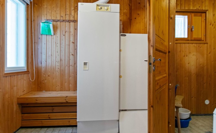 The utility room includes a drying cabinet and a washing machine. The sauna has a wood-burning stove, and the washroom is equipped with a shower. There is also a grill hut in the yard.