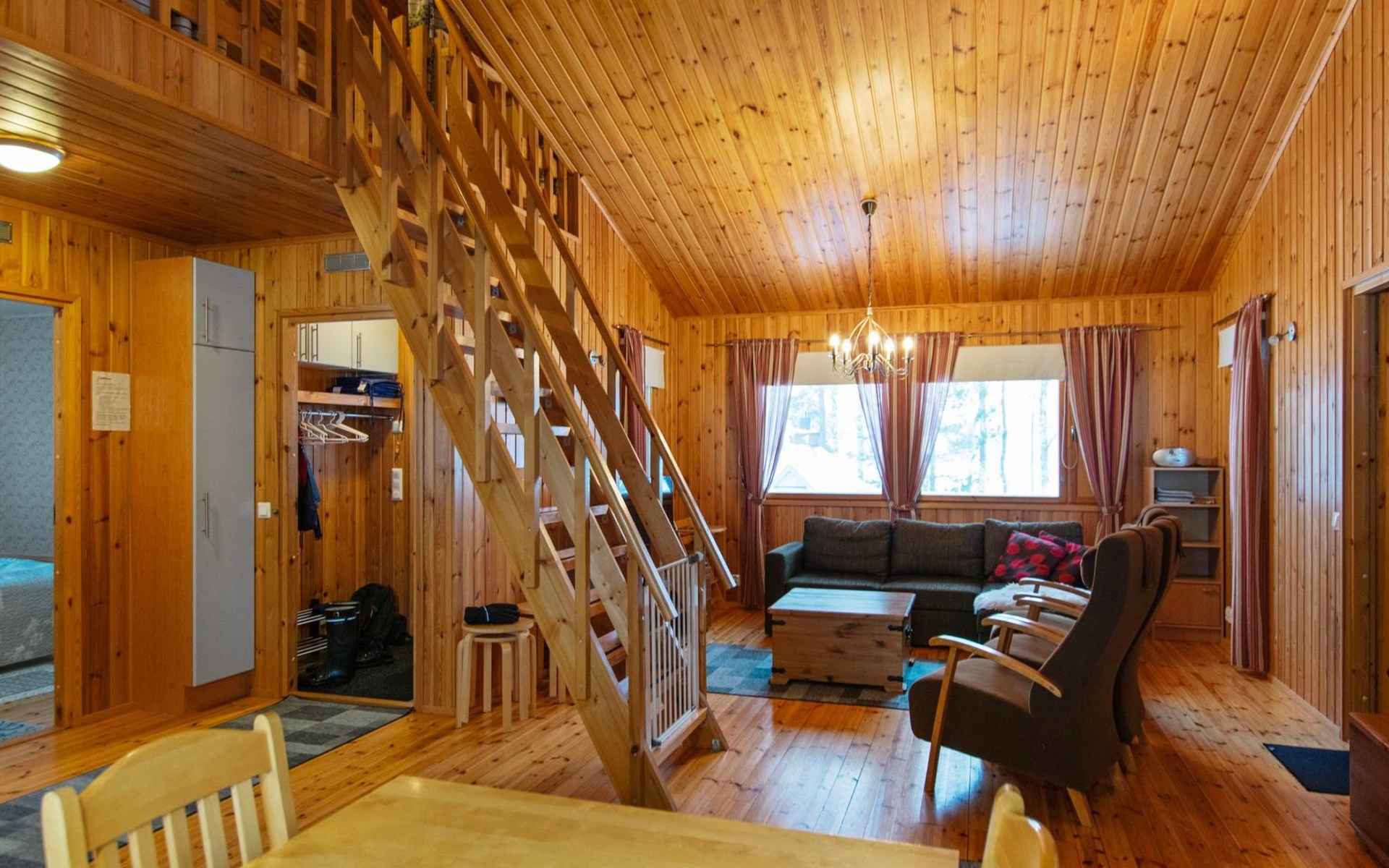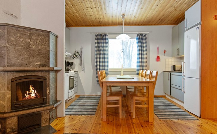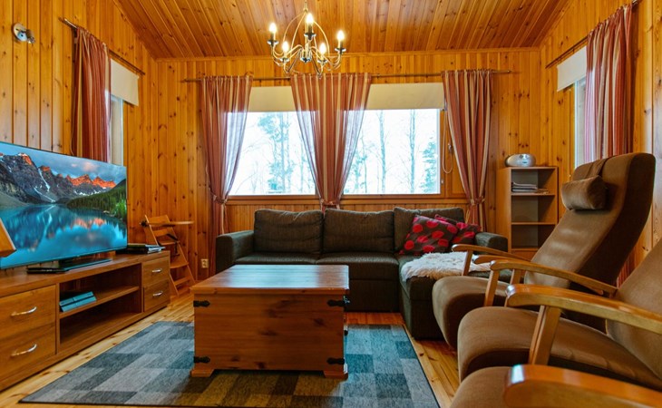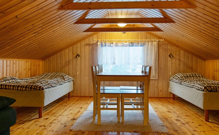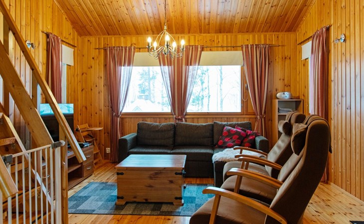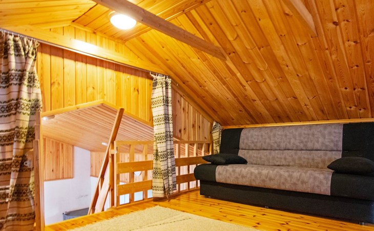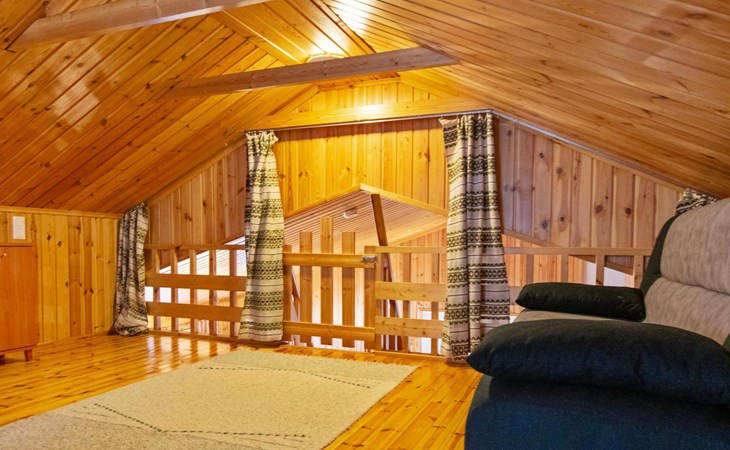 The cabin features a spacious living room/open kitchen area with a dining table for eight, a heat-storing fireplace, a sofa set, and a TV. There are two bedrooms: one with a double bed and the other with two single beds. The loft includes two single beds and a sofa bed that converts into a 120x200 cm bed for one person. Additionally, there is a sofa bed on the ground floor that provides a 140x200 cm sleeping space for two. The maximum capacity of the cabin is eight people, even though there are beds for nine.