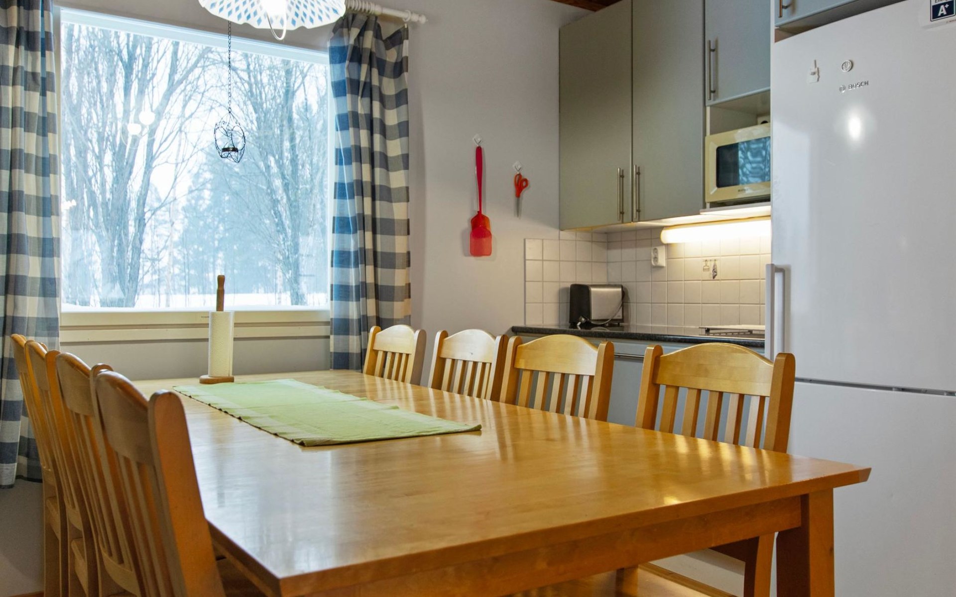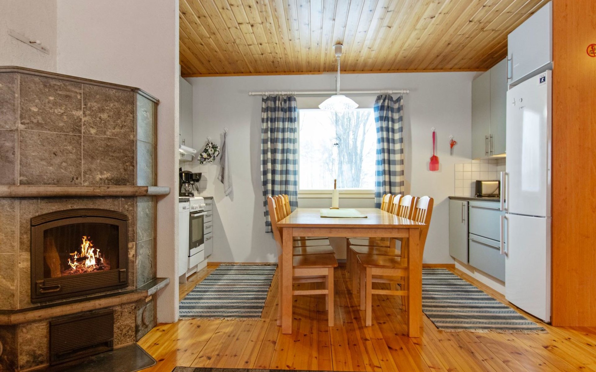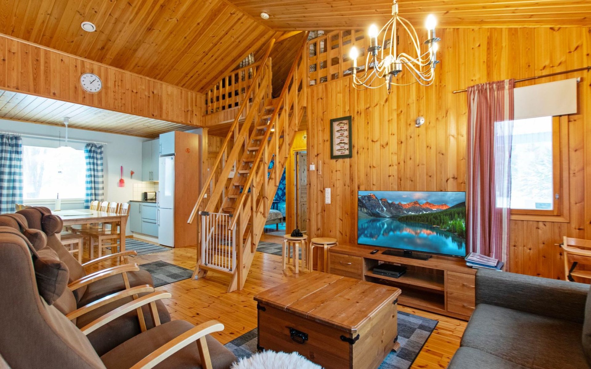 The cabin features a spacious living room/open kitchen area with a dining table for eight, a heat-storing fireplace, a sofa set, and a TV. There are two bedrooms: one with a double bed and the other with two single beds. The loft includes two single beds and a sofa bed that converts into a 120x200 cm bed for one person. Additionally, there is a sofa bed on the ground floor that provides a 140x200 cm sleeping space for two. The maximum capacity of the cabin is eight people, even though there are beds for nine.