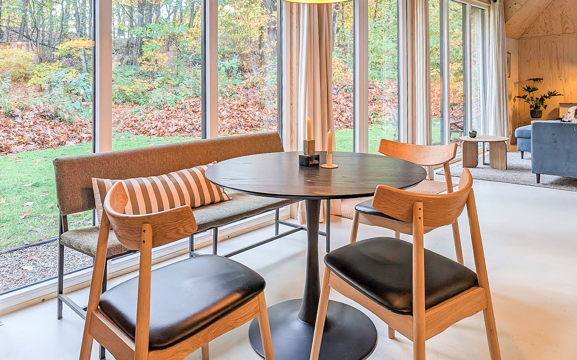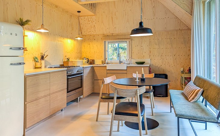 The living room has underfloor heating and is furnished with a seating area and a television with streaming facilities. The bungalow has an an open kitchen with a dining area. The kitchen is equipped with a fridge with freezer compartment, filter coffee machine, oven and dishwasher amongst other things.