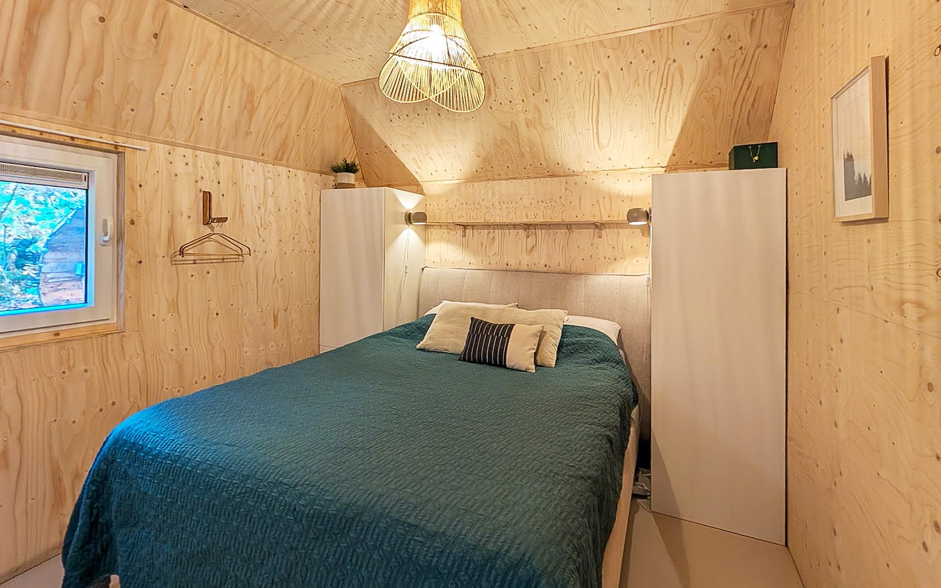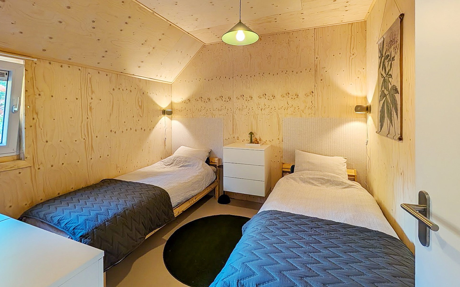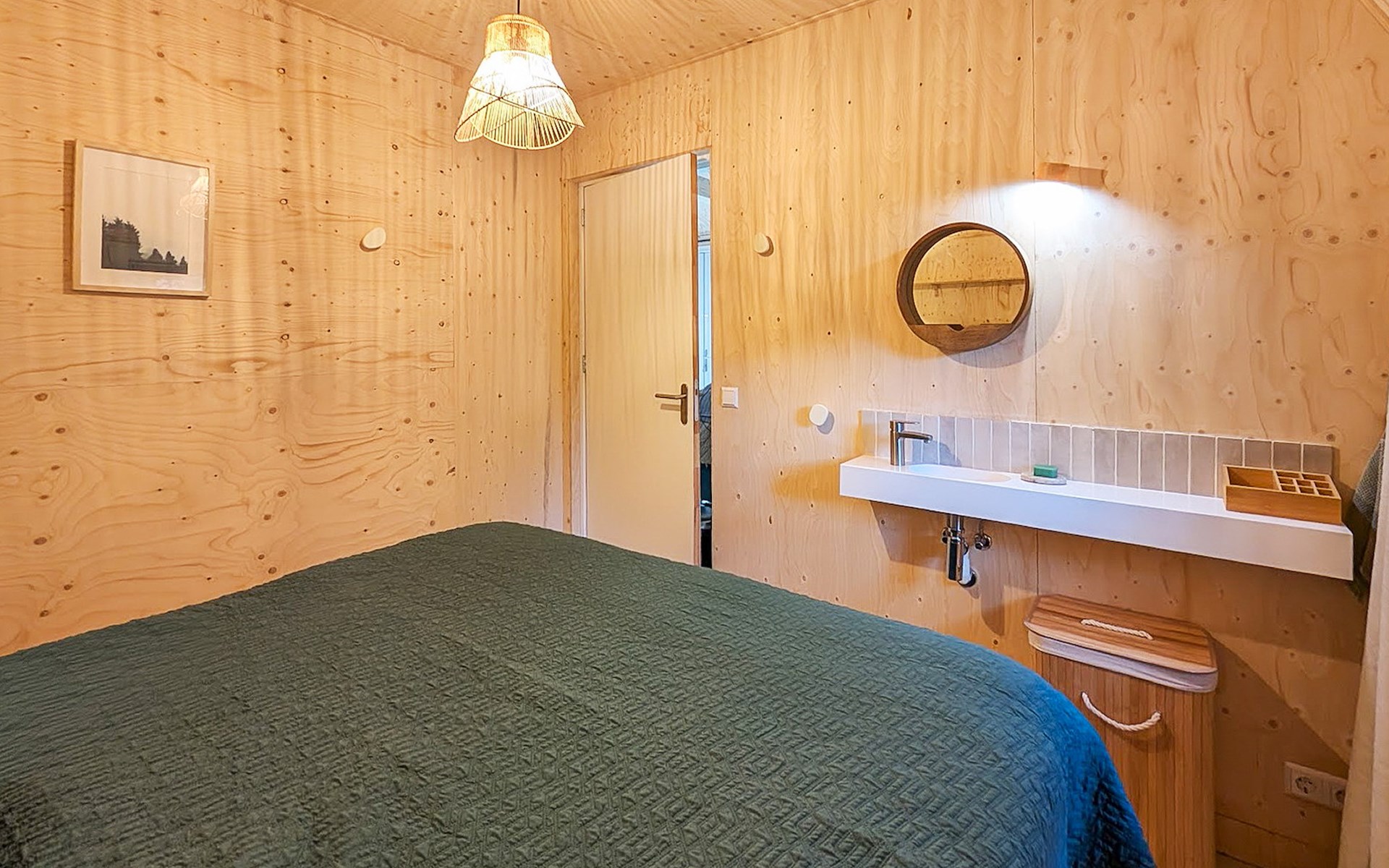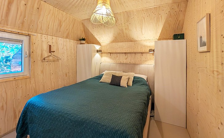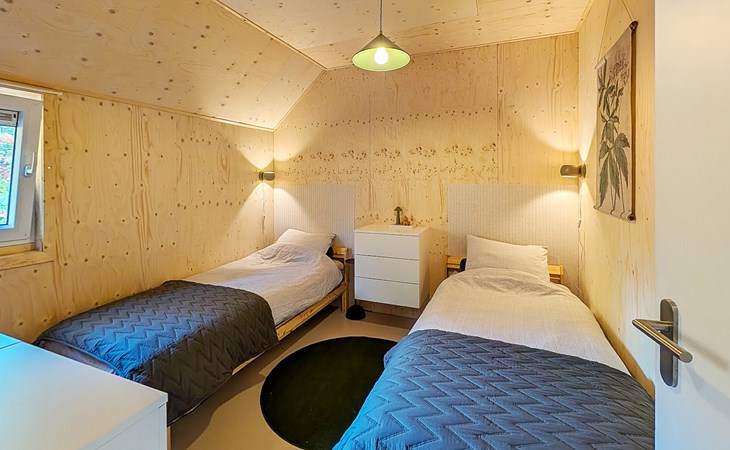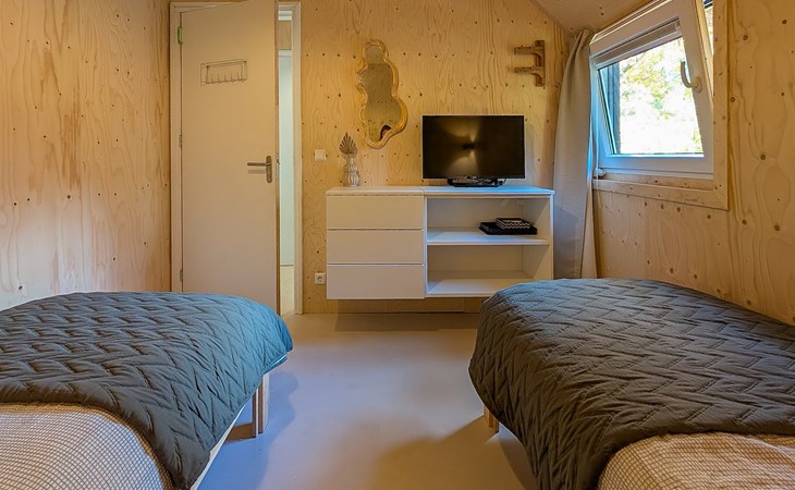 The bungalow has two bedrooms. Both bedrooms are furnished with two single box spring beds. The bathroom has a walk-in shower and a washbasin. The bungalow has a separate toilet.