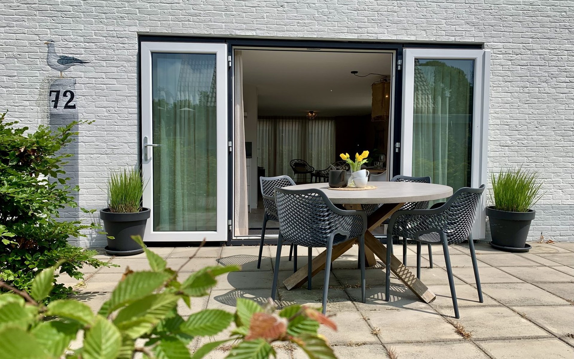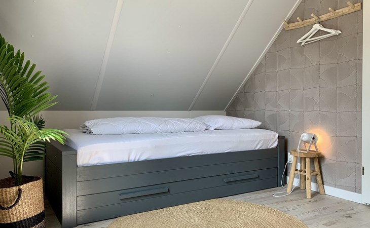 There are two spacious bedrooms. The master bedroom has a double bed, and the children's bedroom has three single beds. A cot and highchair can be booked through Great-Vakantiehuizen.