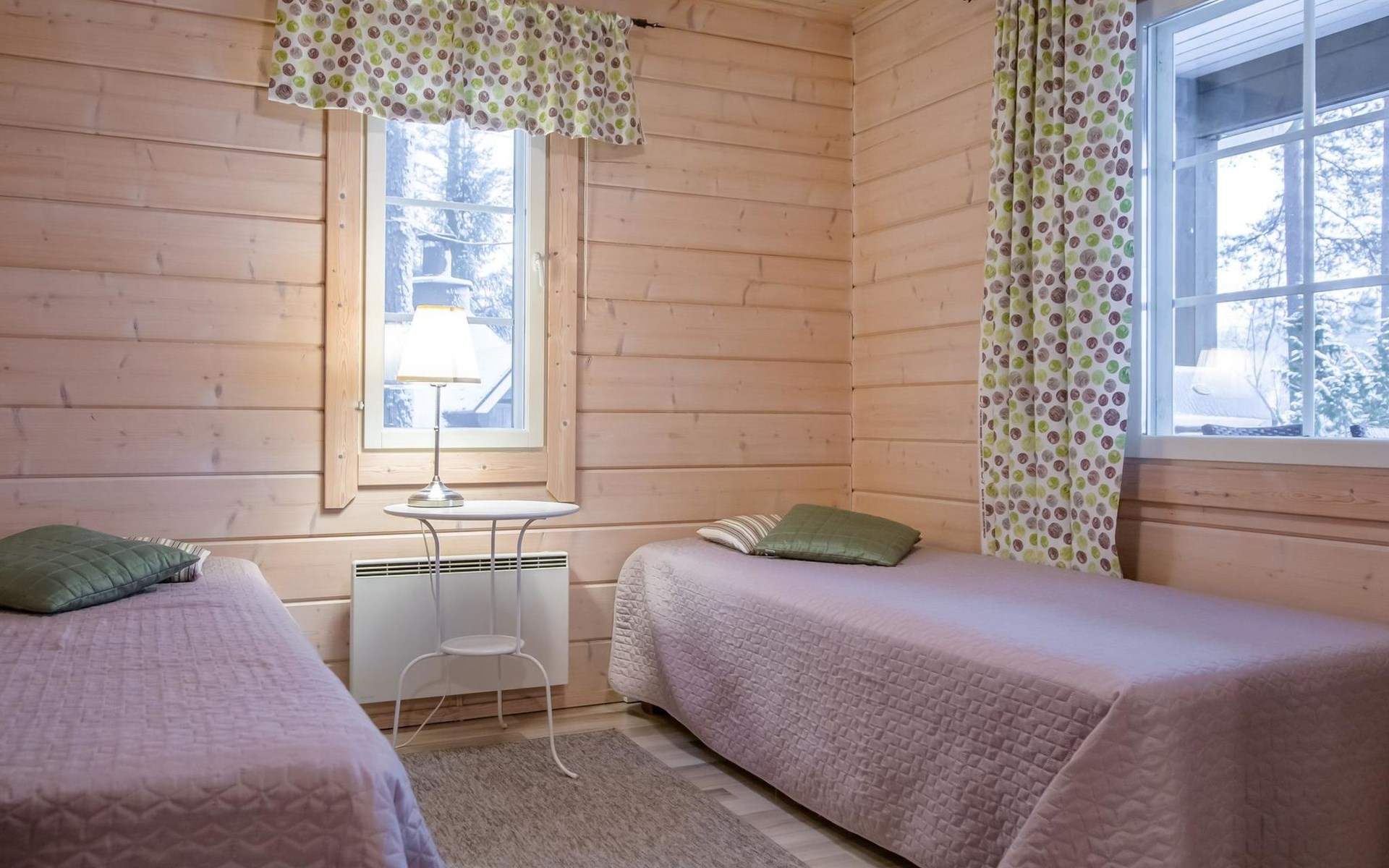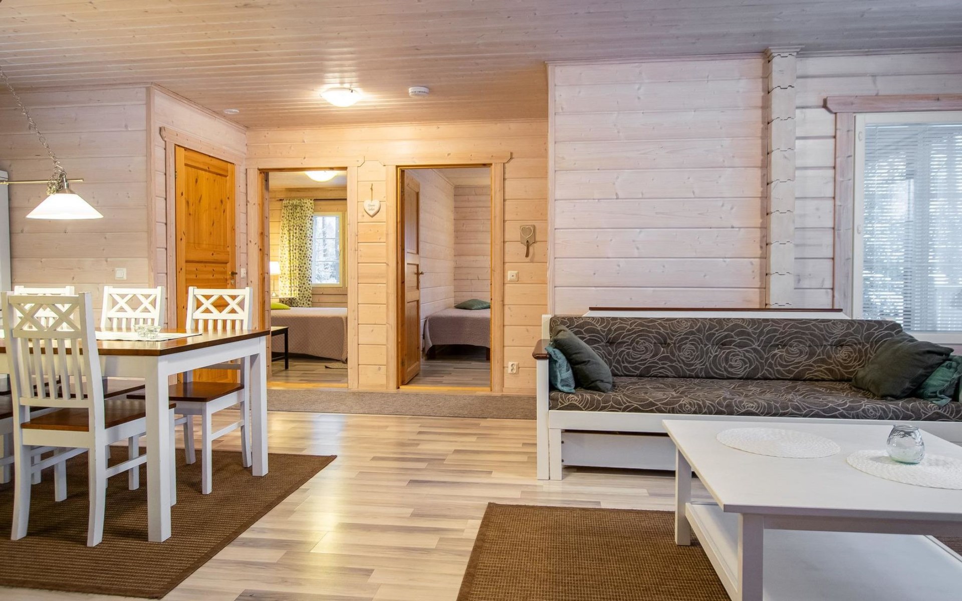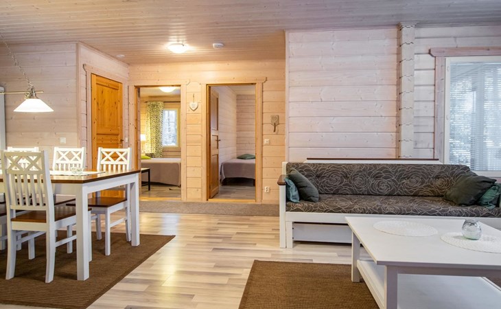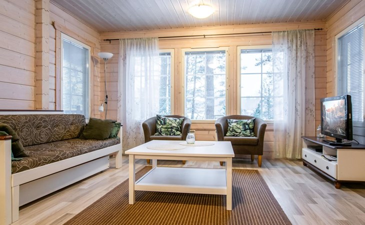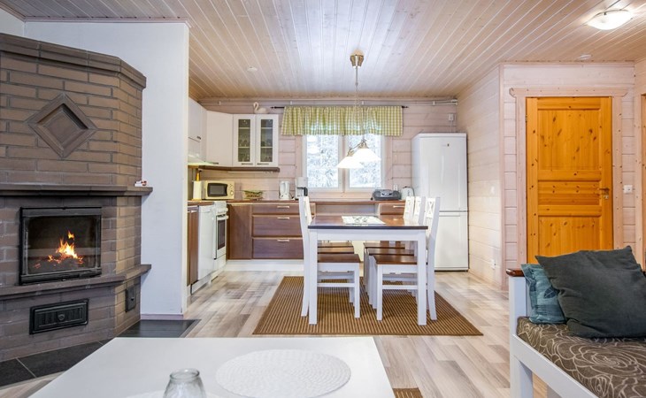 The log cabin (built in 2011) features a cozy open-plan living room and well-equipped kitchen. The living room includes a heat-storing fireplace, a TV, and a sofa set. The kitchen has a spacious dining table. The cabin has two bedrooms, each with two beds. Additionally, the living room has a pull-out sofa bed that converts into a 140 x 190 cm extra bed for two people.