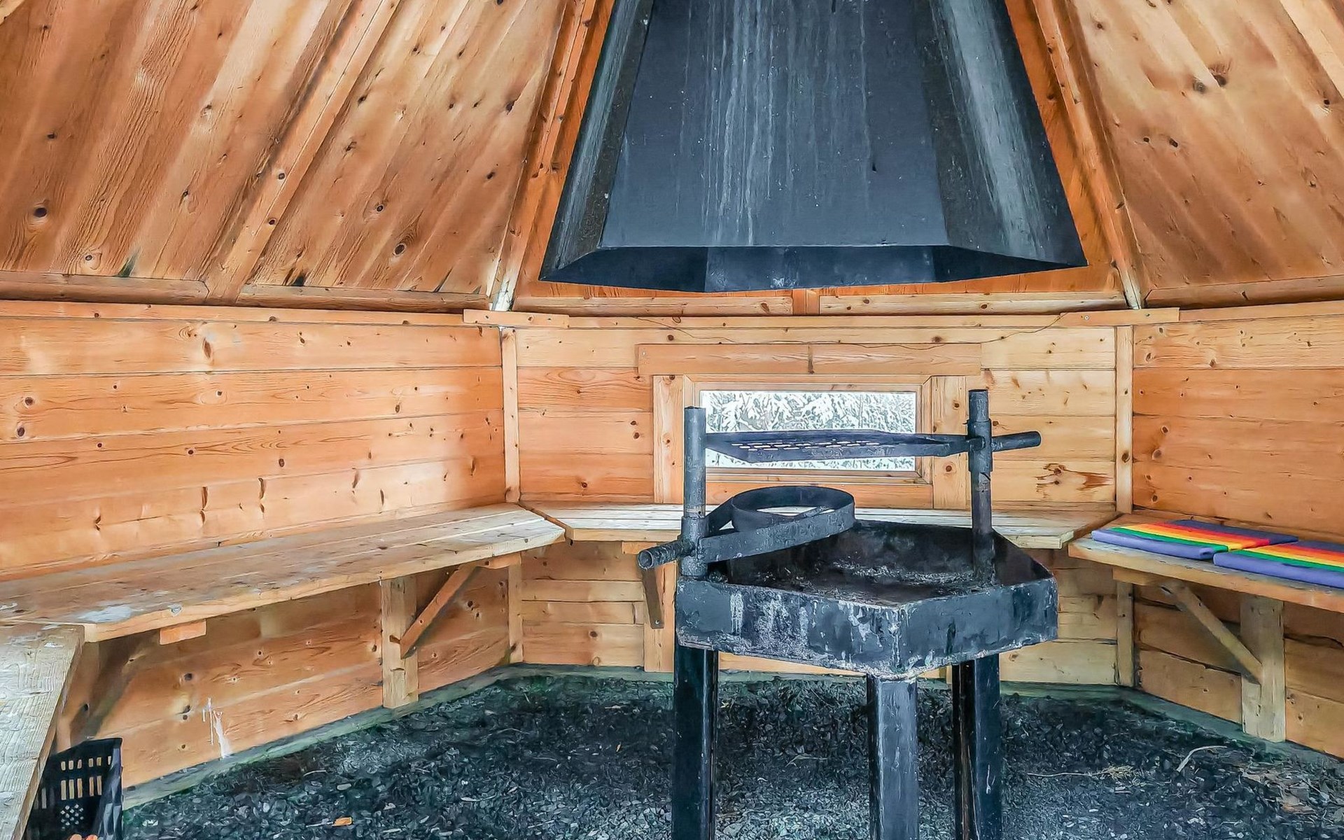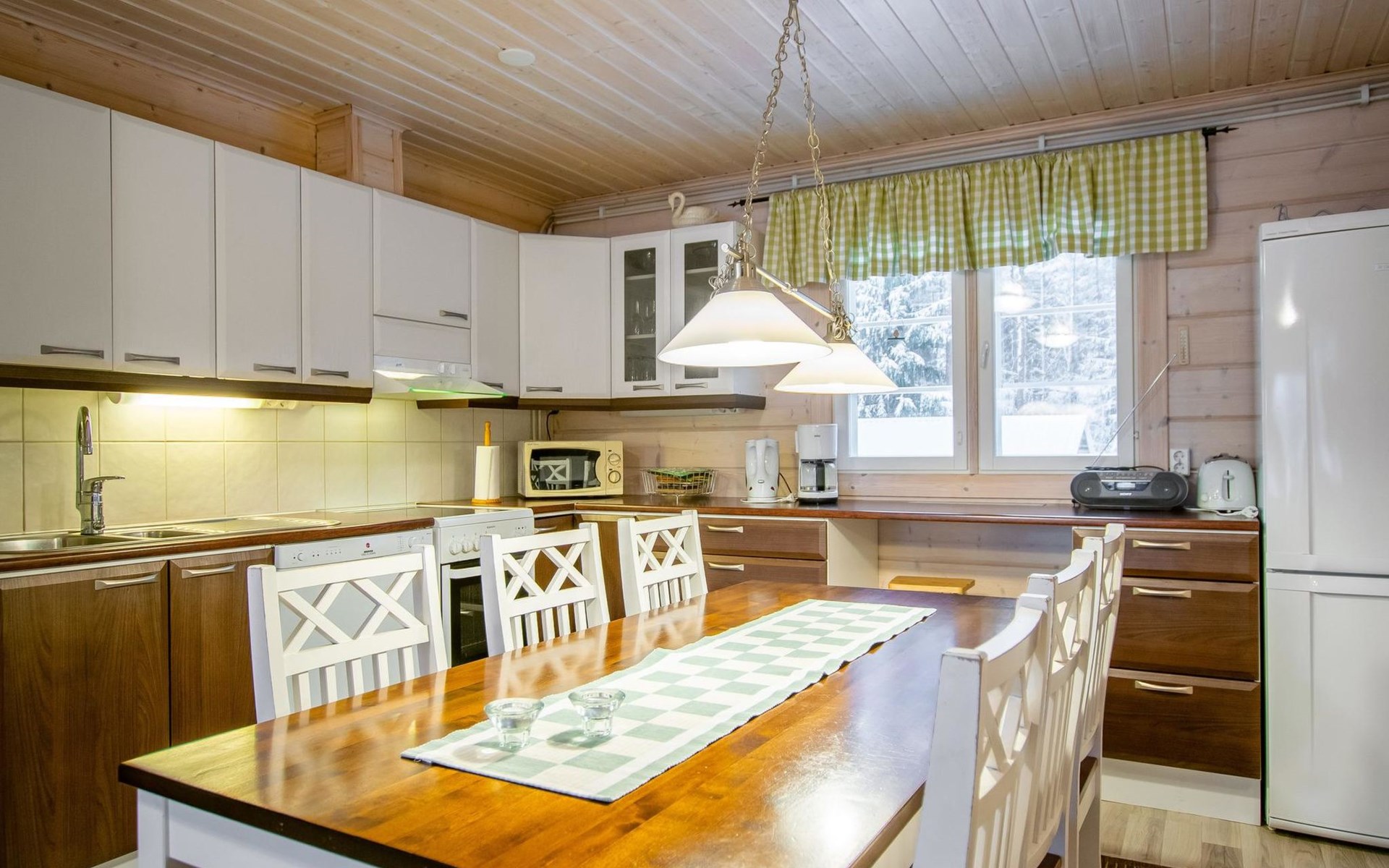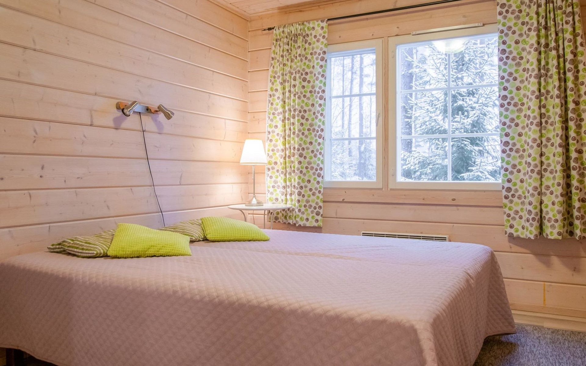 The log cabin (built in 2011) features a cozy open-plan living room and well-equipped kitchen. The living room includes a heat-storing fireplace, a TV, and a sofa set. The kitchen has a spacious dining table. The cabin has two bedrooms, each with two beds. Additionally, the living room has a pull-out sofa bed that converts into a 140 x 190 cm extra bed for two people.