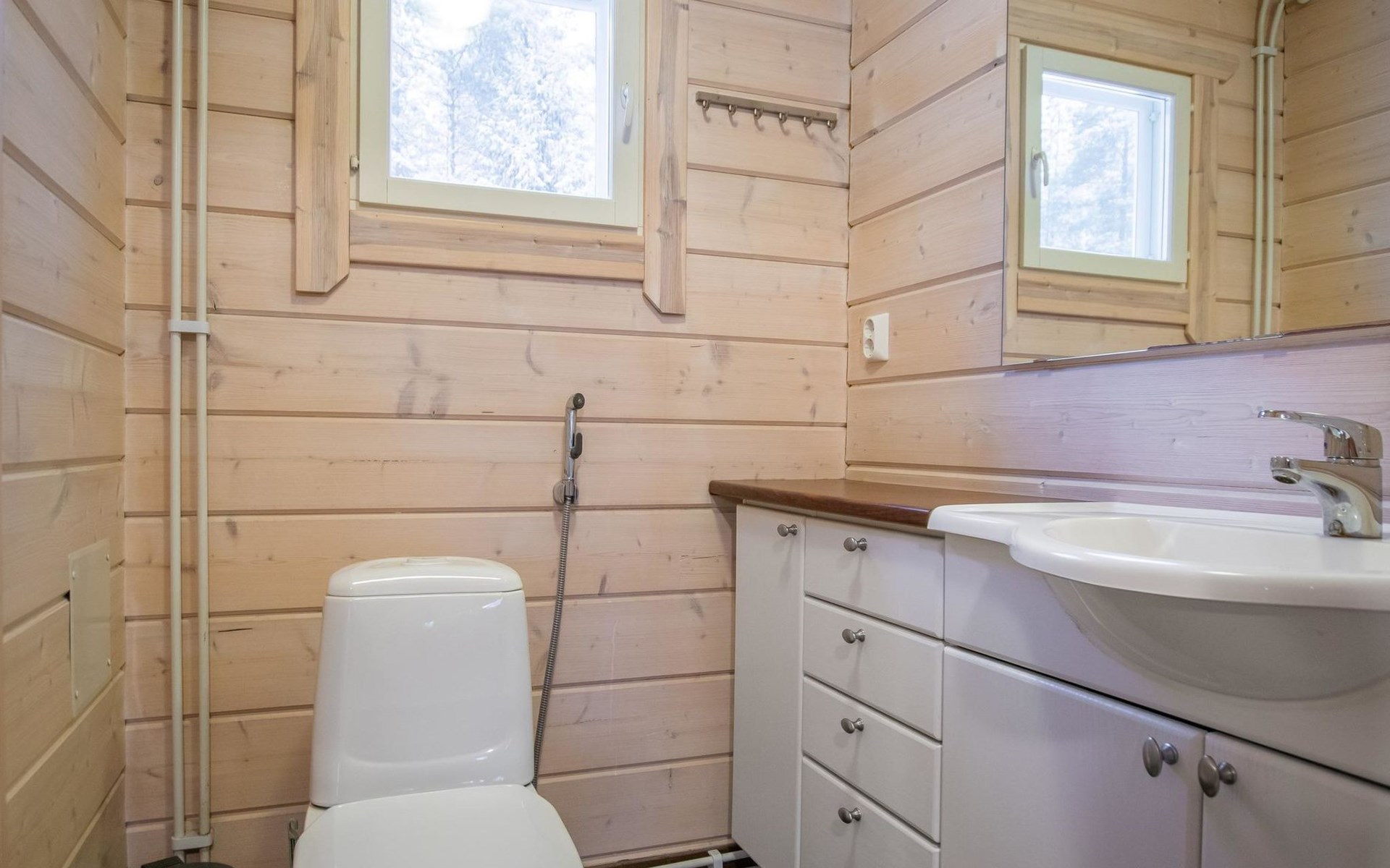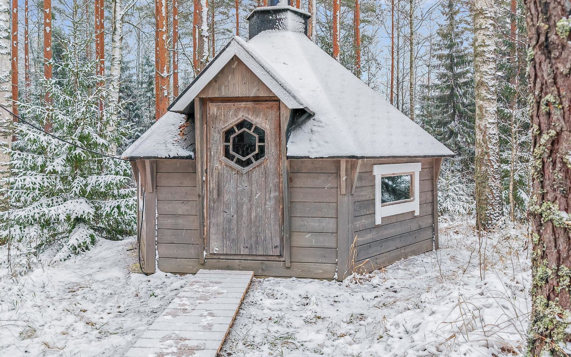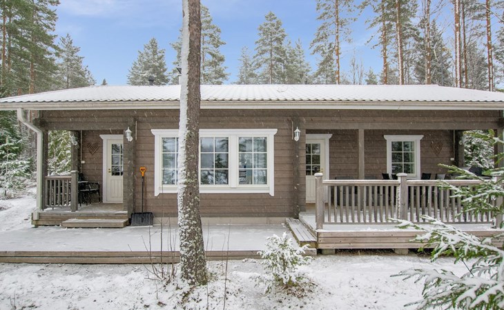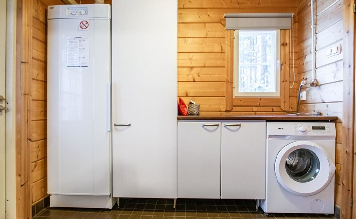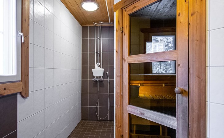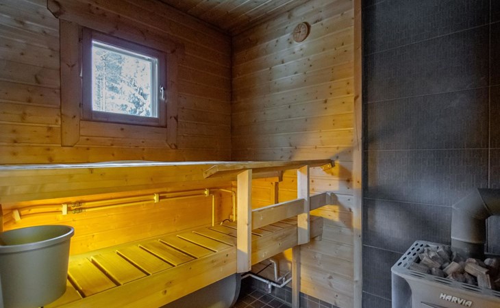 The sauna is equipped with a wood-burning stove, and the washroom has a shower and a separate WC. The cabin is equipped with an air-source heat pump for both cooling and heating.