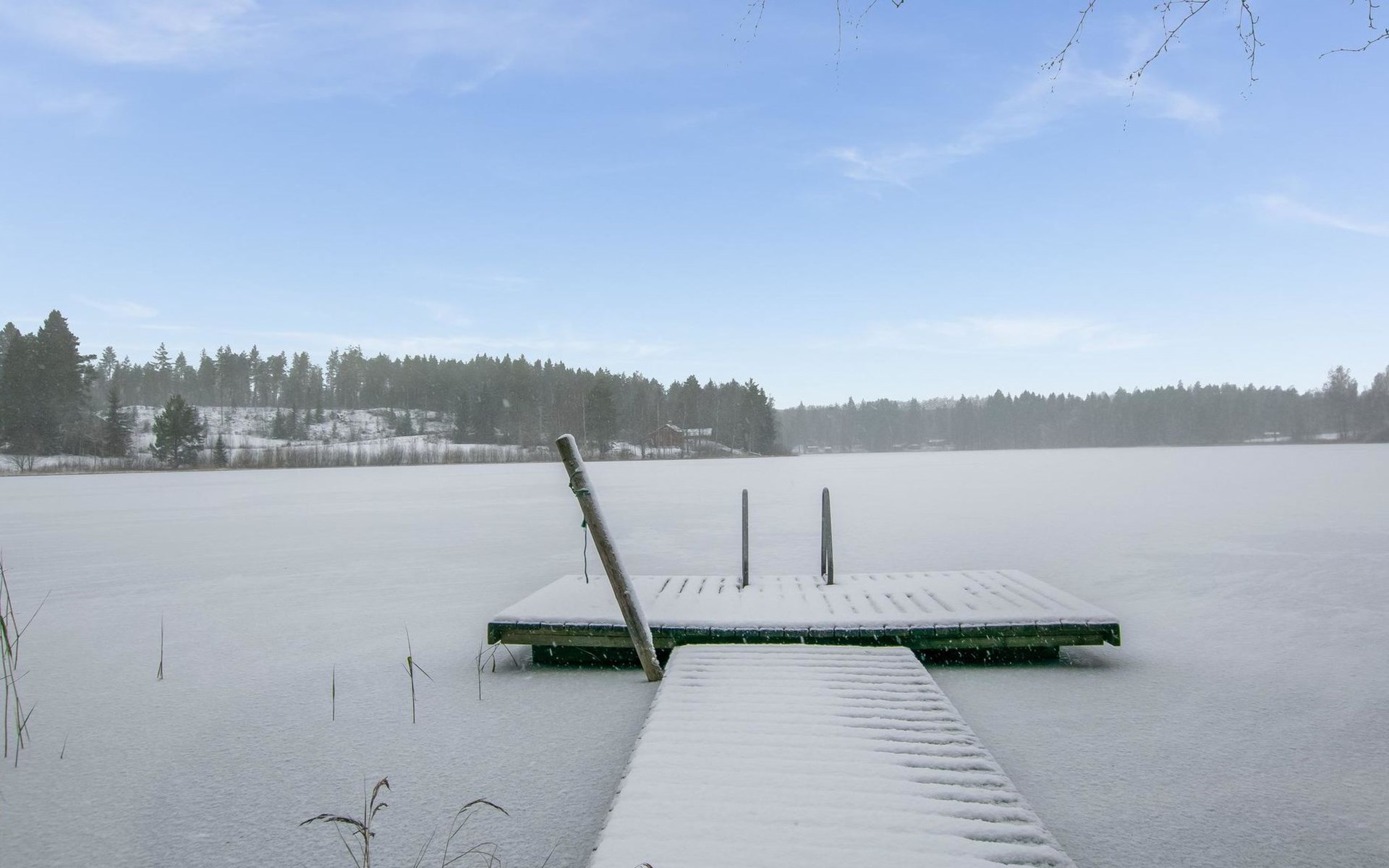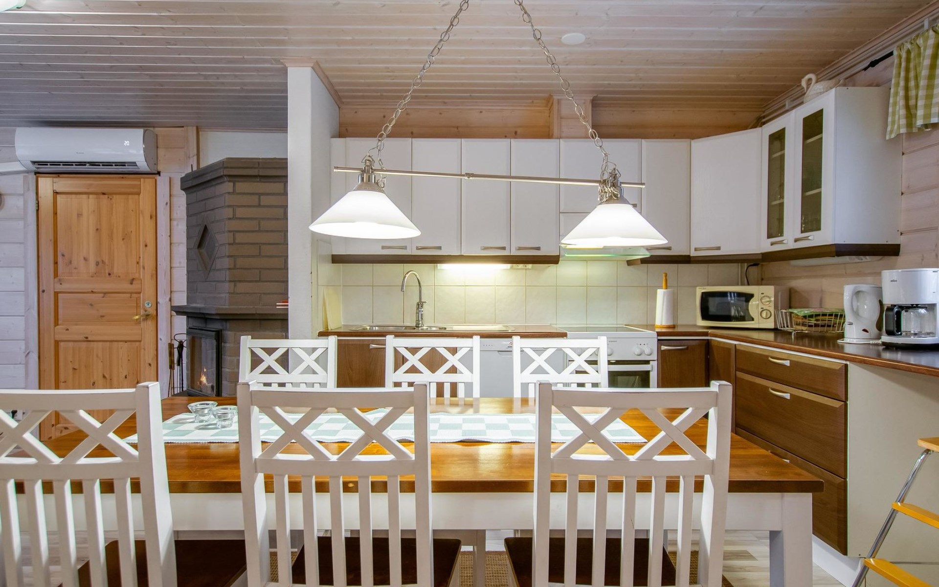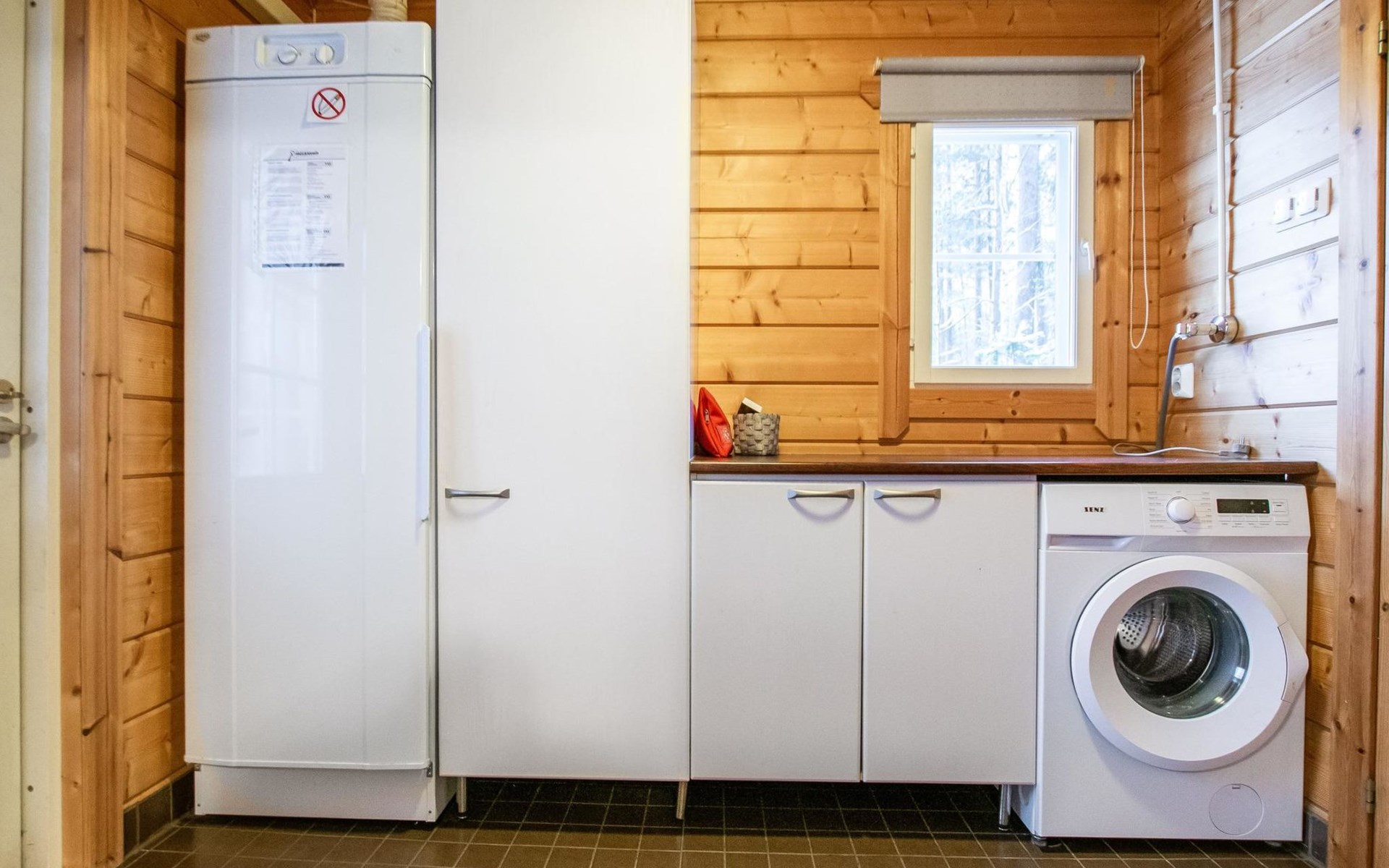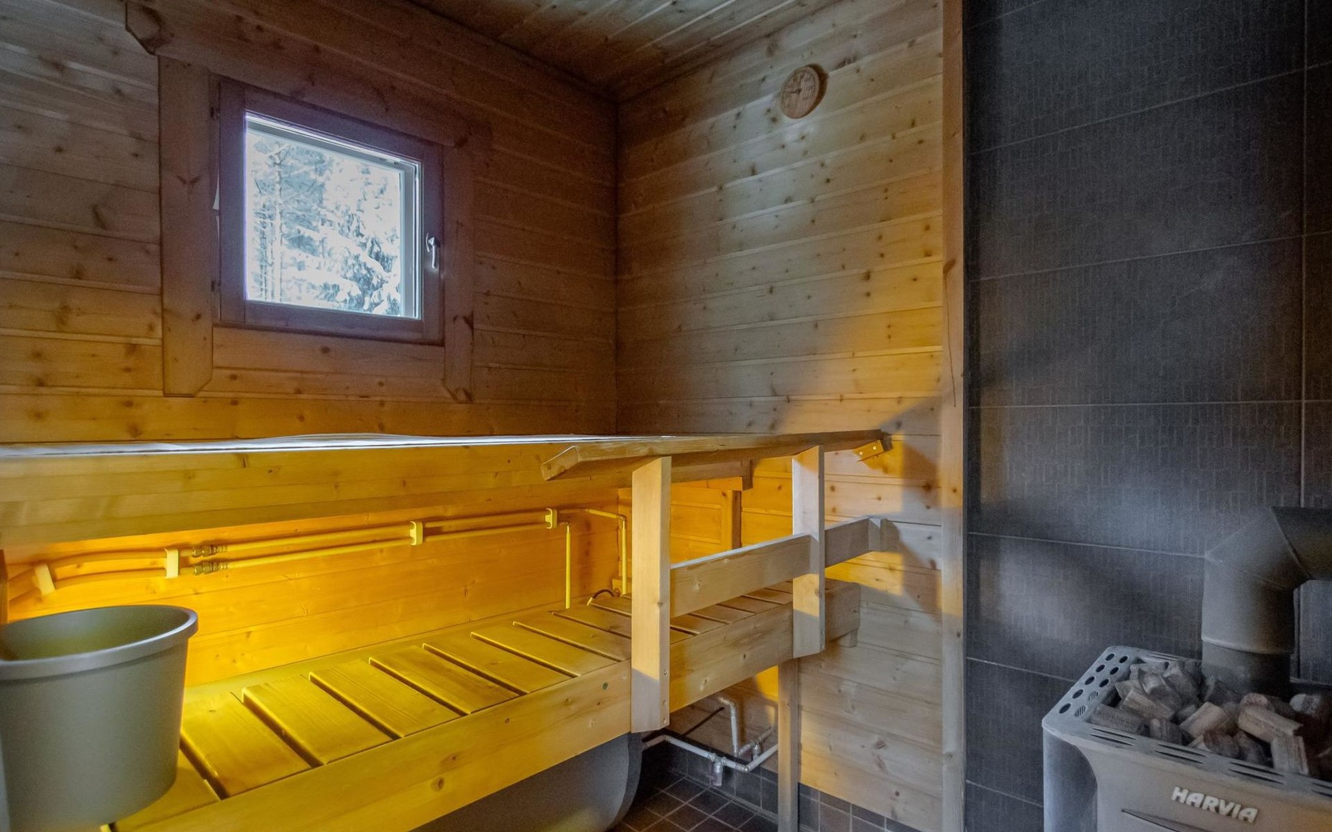 The sauna is equipped with a wood-burning stove, and the washroom has a shower and a separate WC. The cabin is equipped with an air-source heat pump for both cooling and heating.