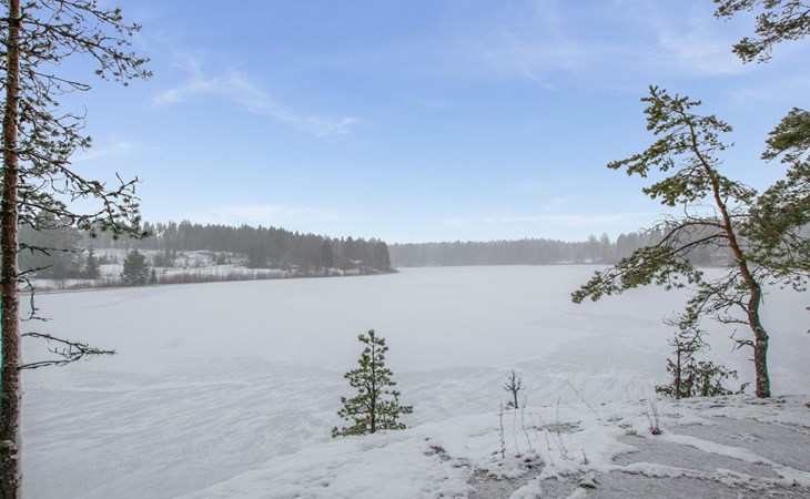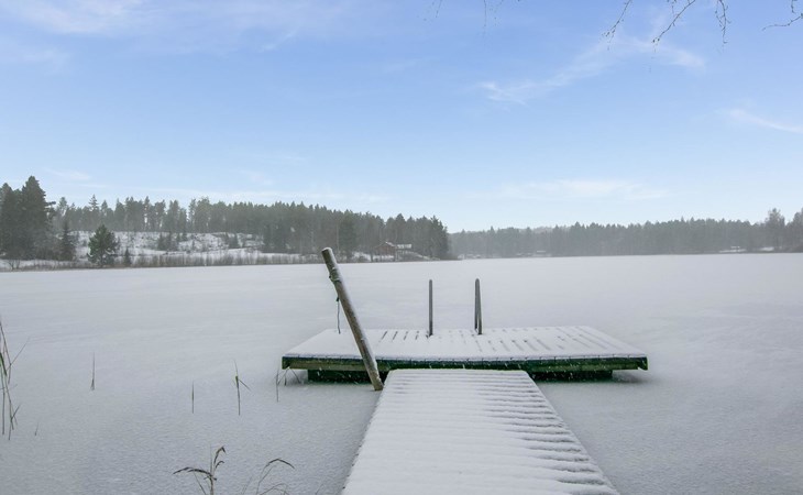 In the yard, there is an atmospheric grill hut. The shoreline is rocky and has a deep bottom. There is a pier and a rowing boat at the shore.