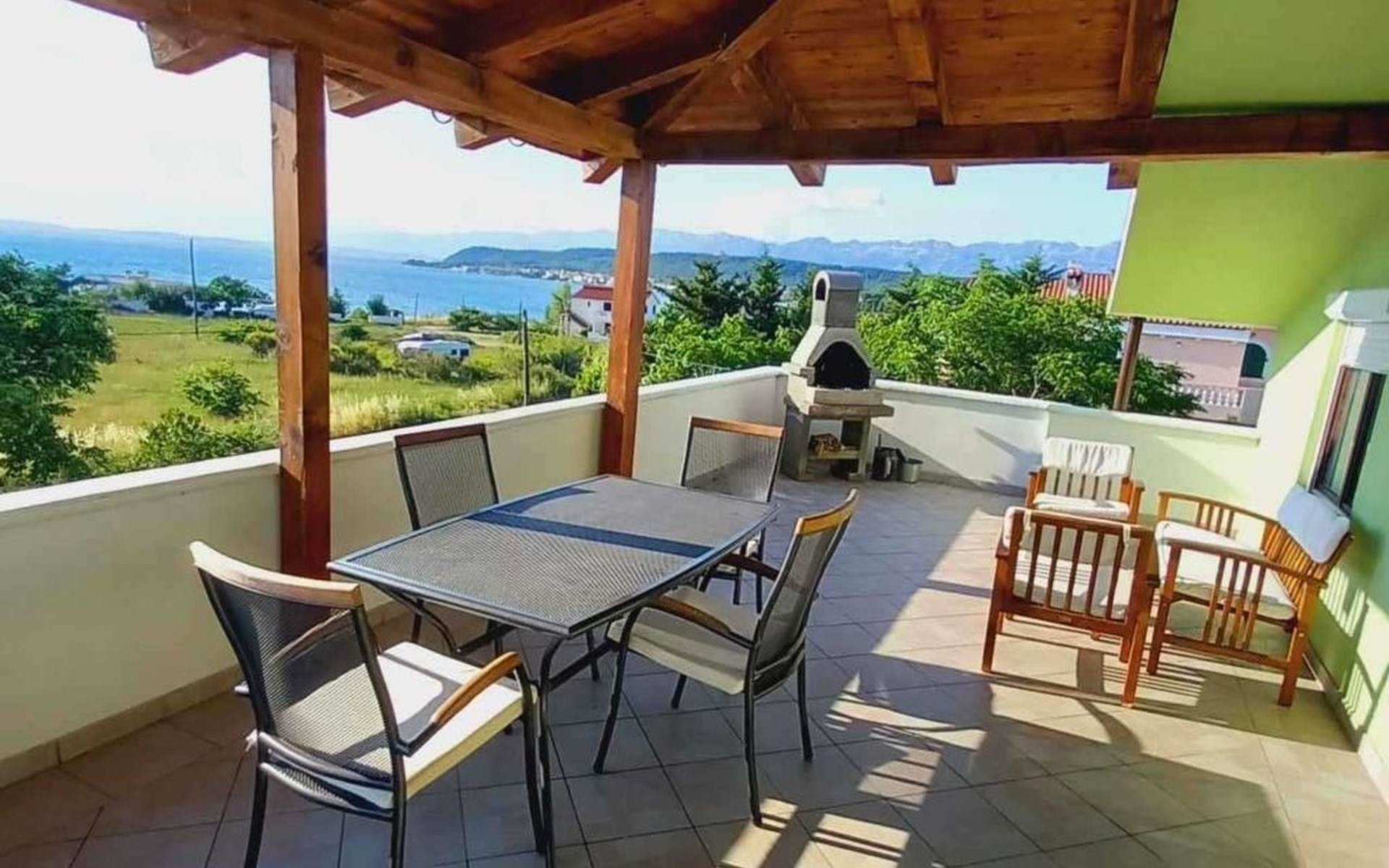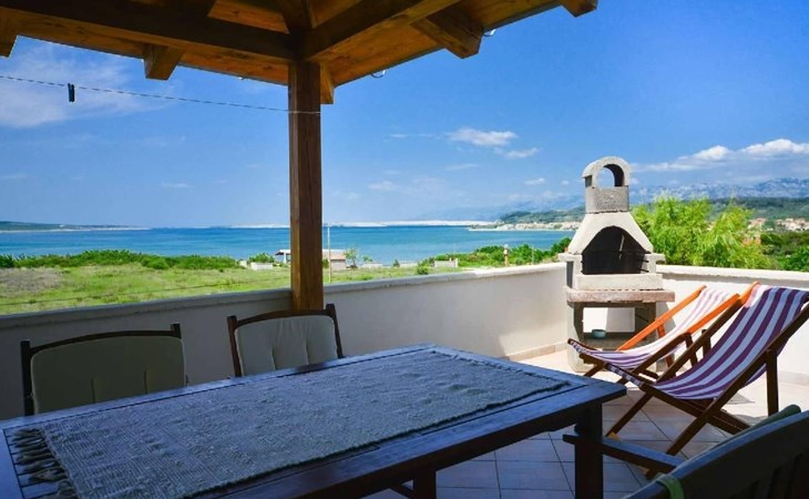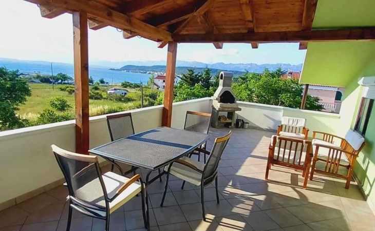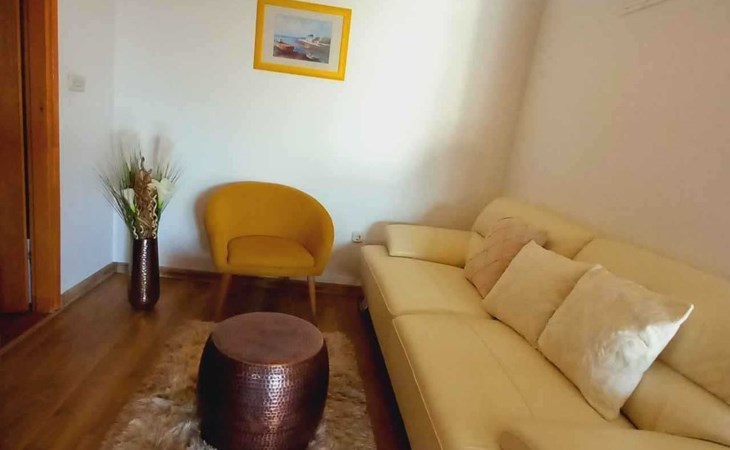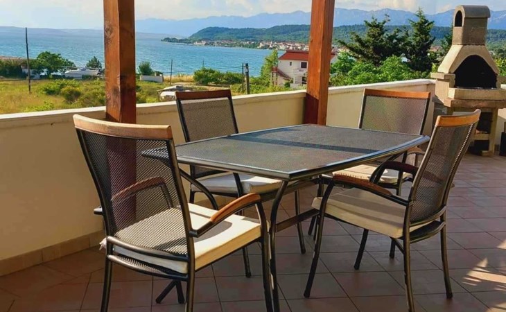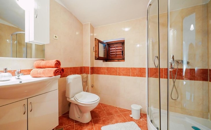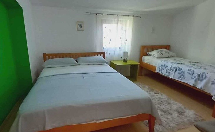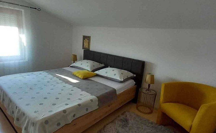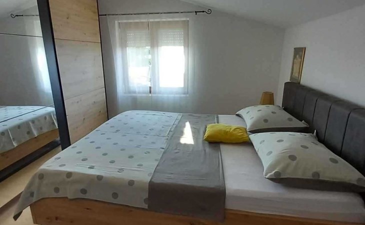This family run apartment is ideal for 4 persons but it can accomodate up to 5 persons. Apartment has two bedrooms: one with double bed (160x2), and the other bedroom with double bed (140x2) and 1 single bed. There's a sofa in the living room, kitchen fully equipped with dishwasher, oven, kettle, coffee machine, microwave, fridge with freezer...Apartment is situated on the first floor, it has spacious terrace (30 sqm) with amazing sea view and own grill. Also, apartment has it's own entry. Pool (33 sqm), separated Whirpool (5 persons), and sunbathing place (with loungers and parasols) are shared with one more apartment. Hosts are also living in the house, and ready to help if needed.