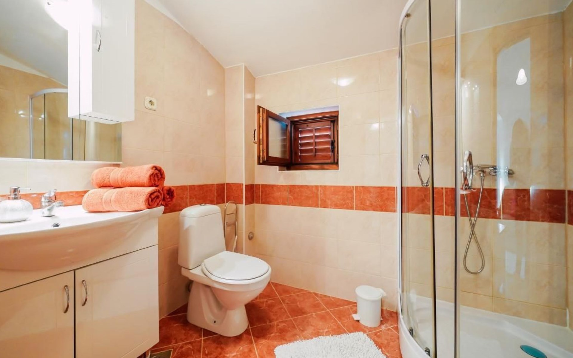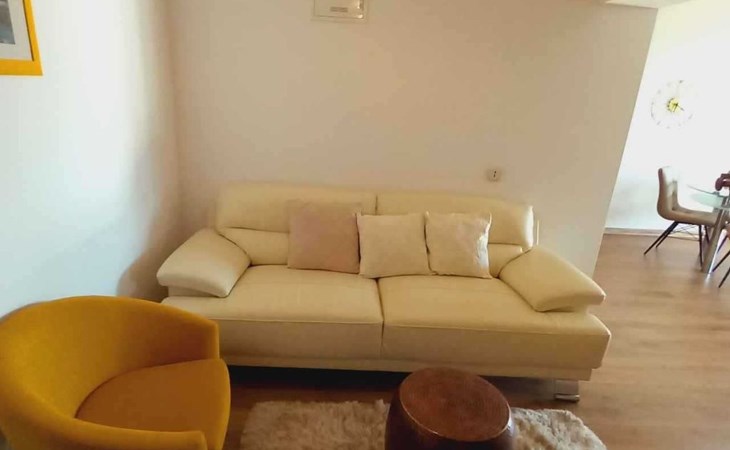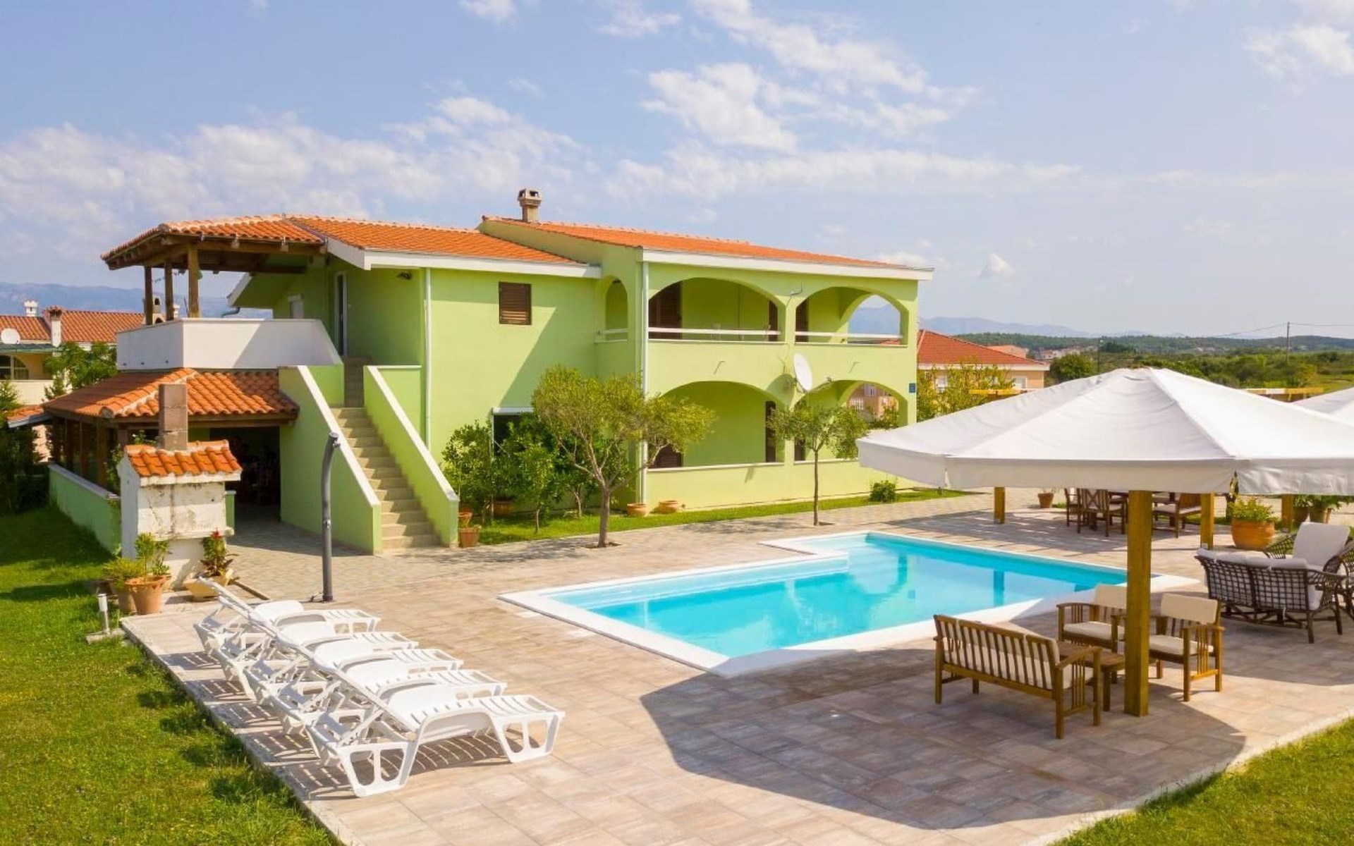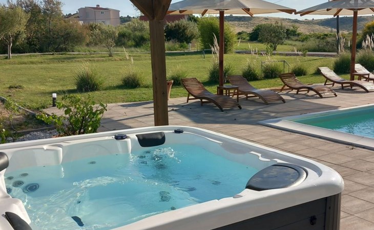 This family run apartment is ideal for 4 persons but it can accomodate up to 5 persons. Apartment has two bedrooms: one with double bed (160x2), and the other bedroom with double bed (140x2) and 1 single bed. There's a sofa in the living room, kitchen fully equipped with dishwasher, oven, kettle, coffee machine, microwave, fridge with freezer...Apartment is situated on the first floor, it has spacious terrace (30 sqm) with amazing sea view and own grill. Also, apartment has it's own entry. Pool (33 sqm), separated Whirpool (5 persons), and sunbathing place (with loungers and parasols) are shared with one more apartment. Hosts are also living in the house, and ready to help if needed.