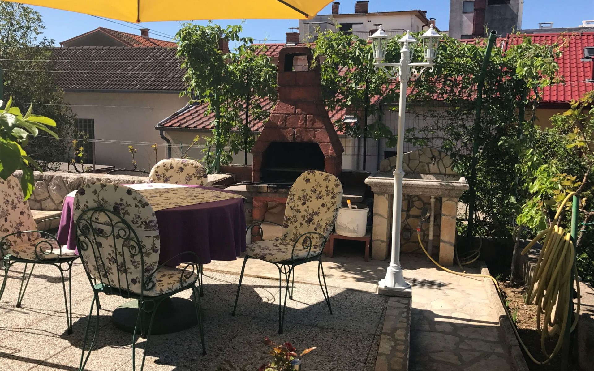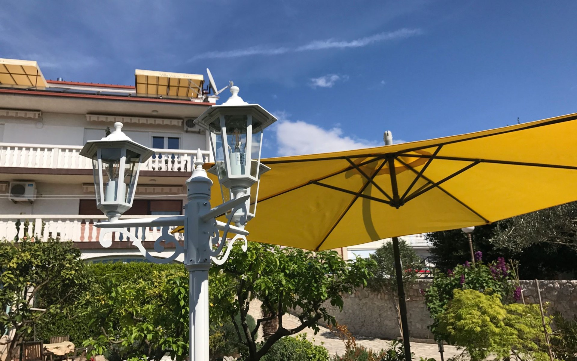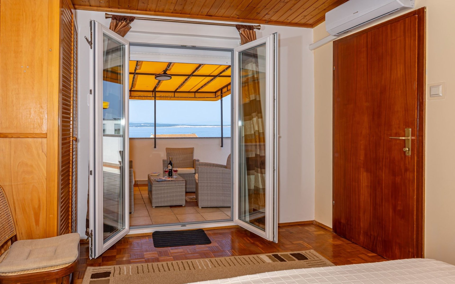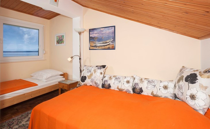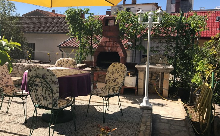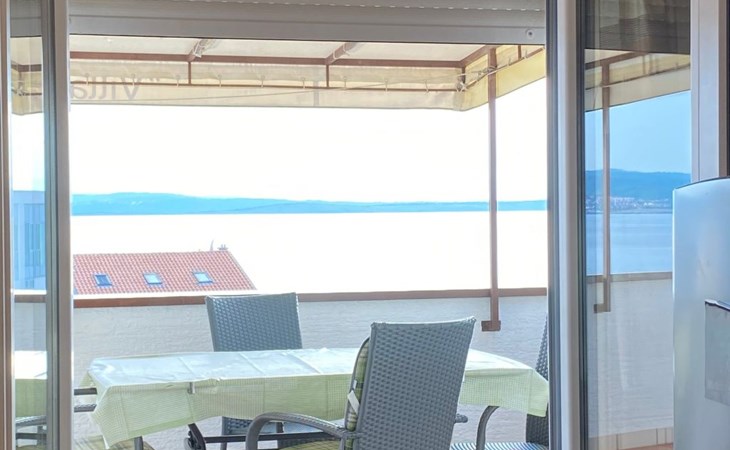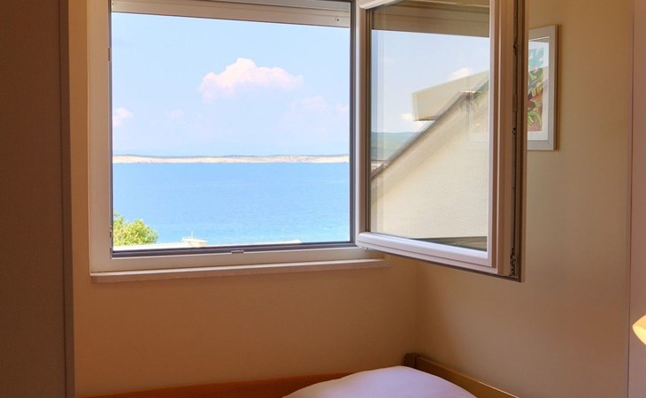 Step outside to the 36m2 furnished terrace where awe-inspiring views over the island of Krk beckon. With two awnings to shield you from the summer sun, the terrace offers a serene spot to unwind. This top-floor retreat, boasting a private entrance and air conditioning throughout, features a cozy sitting area perfect for lounging and an additional breakfast nook overlooking the sea. Sat TV, bedding, towels, kitchen equipment including a microwave and dishwasher, and a “safe kit” with protective gear ensure a well-appointed outdoor living space. A private, video-monitored parking space within the villa grounds, and the option to use the barbecue in the garden upon request, adds to the outdoor amenities.