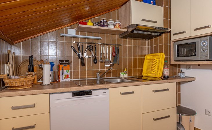 Inside, the 90m2 apartment on the second floor offers a haven of comfort and convenience under the roof. A fully-equipped kitchen awaits, complete with dishwasher, fridge, microwave, and filter coffee machine, alongside all essential kitchen utensils. The dining corner sets the stage for memorable meals, while the living room provides a cozy gathering space with satellite TV, a sofa bed for two, and an additional single bed. The separate bedroom, featuring a king-size bed, complements a setup ideal for three to four guests. A shower room with bidet, washbasin, hairdryer, washing machine, and WC, along with two air conditioning units, internet access, and a safe, ensure a stay filled with ease and comfort.