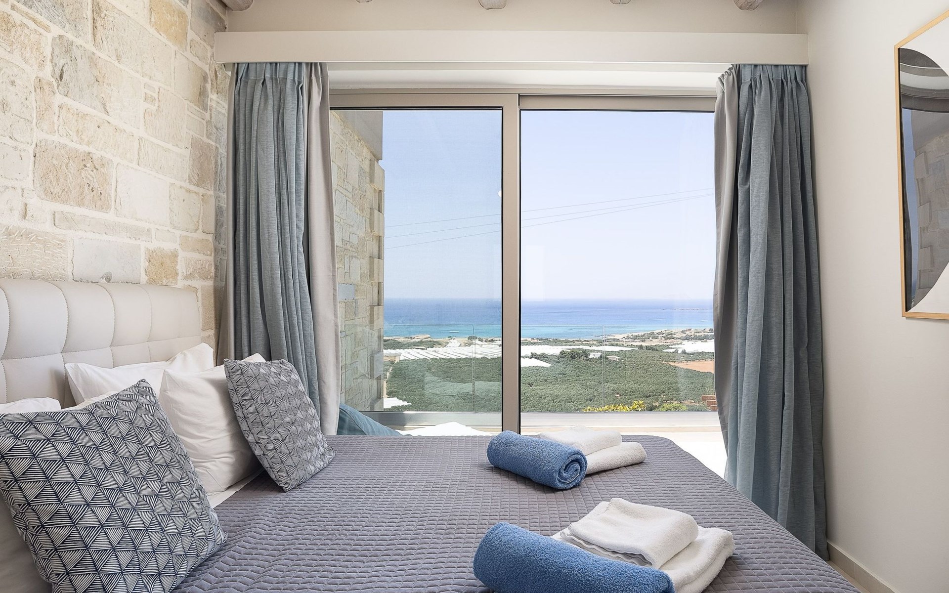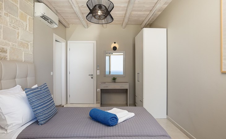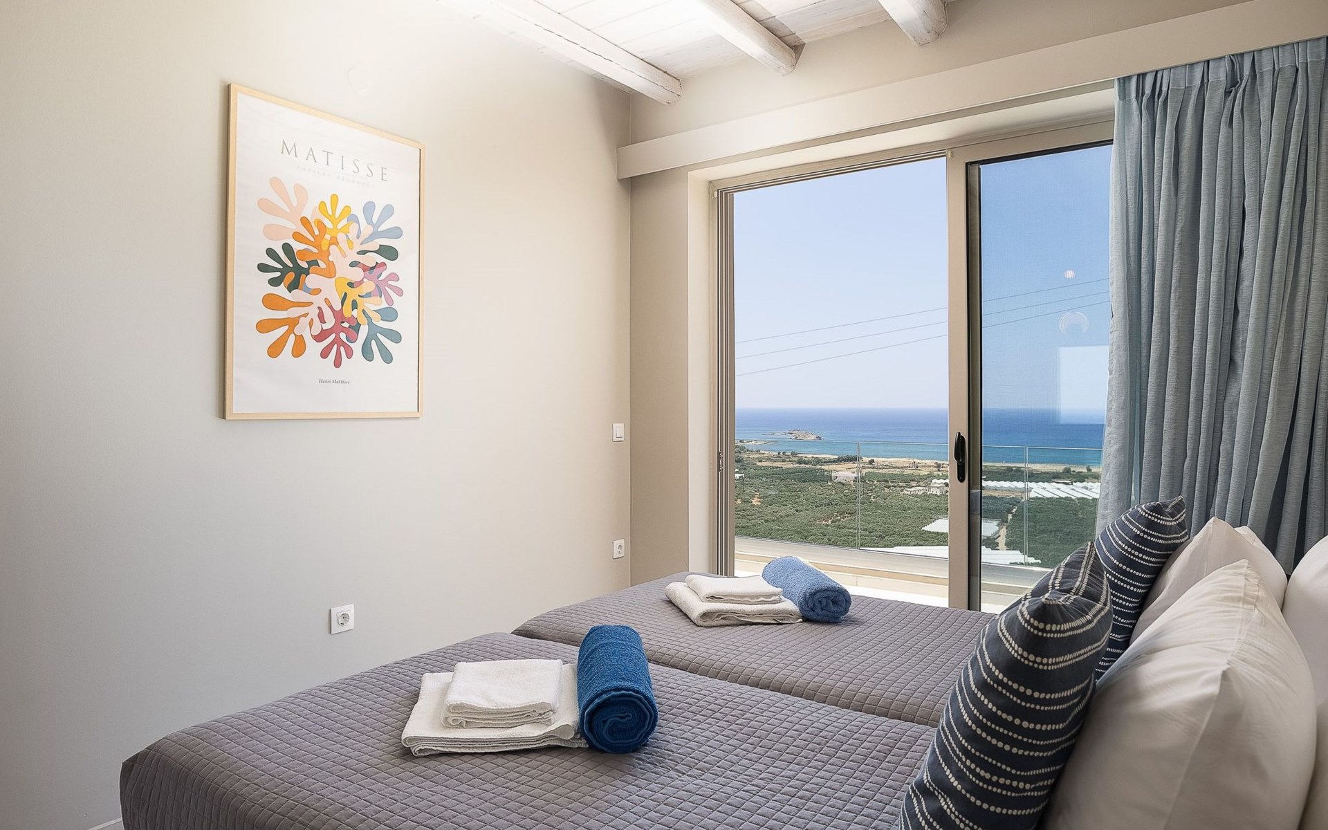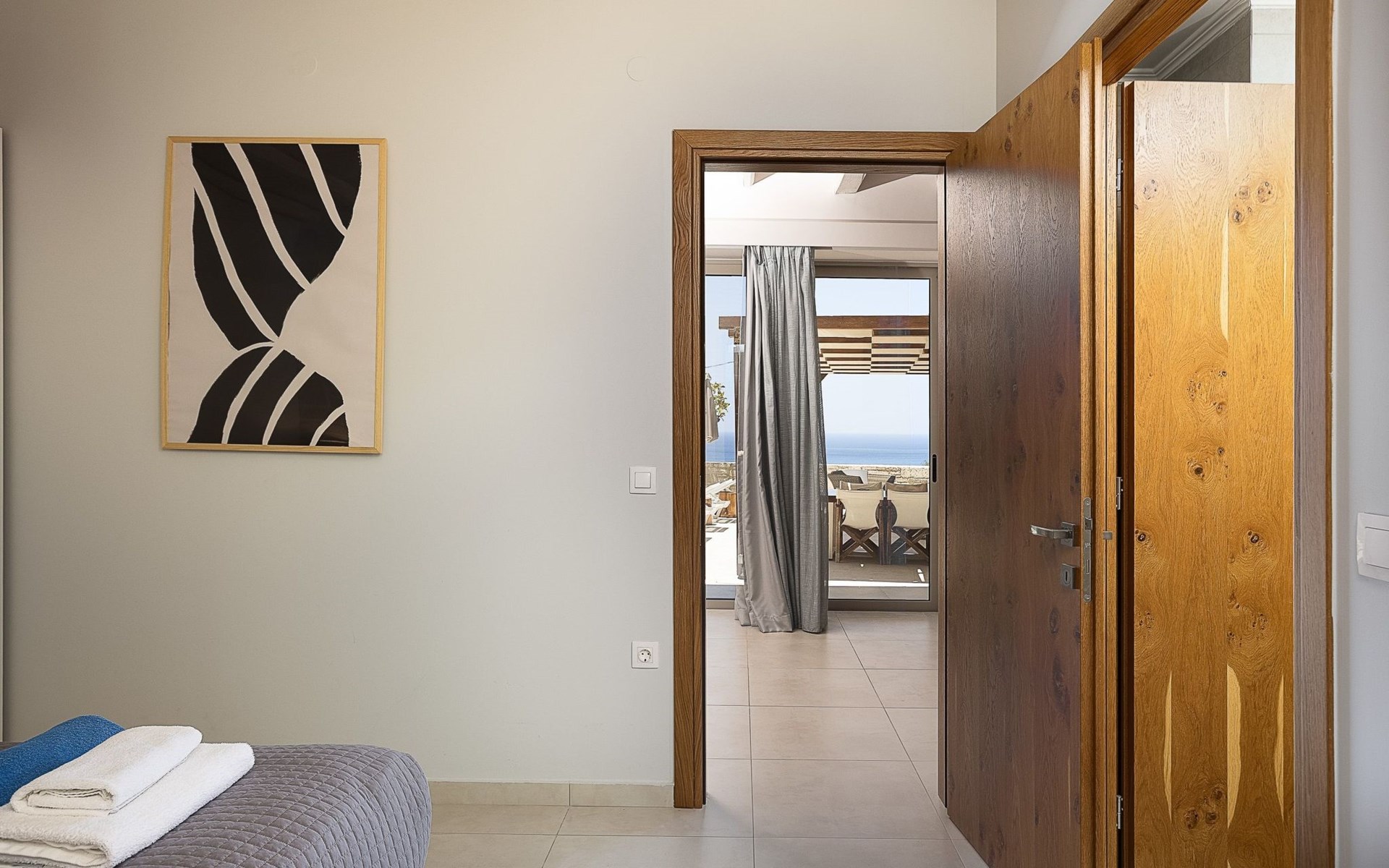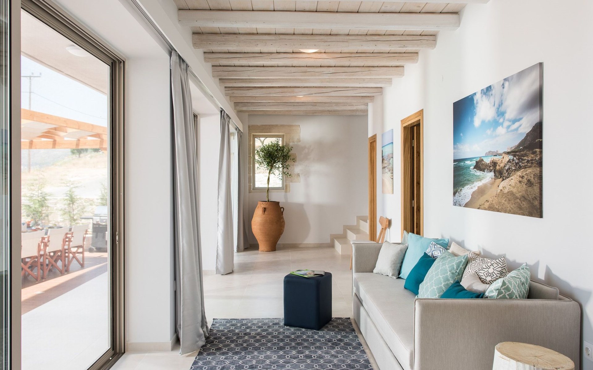 Step inside Villa Elpida, finding a stylish interior that matches the enchanting surrounding of the area. Minimal yet ultimately comfortable, the main living room features large windows gazing at outstanding views of the natural landscape and the Mediterranean Sea. The kitchen is equipped with modern electrical appliances. Five spacious bedrooms with ensuite bathrooms are comfortably dominated by the two floors offering moments of serenity and privacy for all its guests. One bedroom with a double size bed is located on the ground floor with an ensuite bathroom with a shower. The rest bedrooms are located on the first floor two with double-size beds and two with twin-size beds with ensuite bathrooms and a balcony with a sea view.