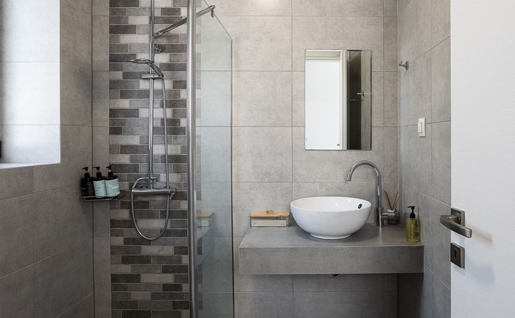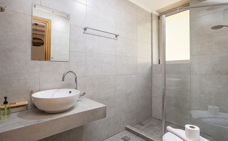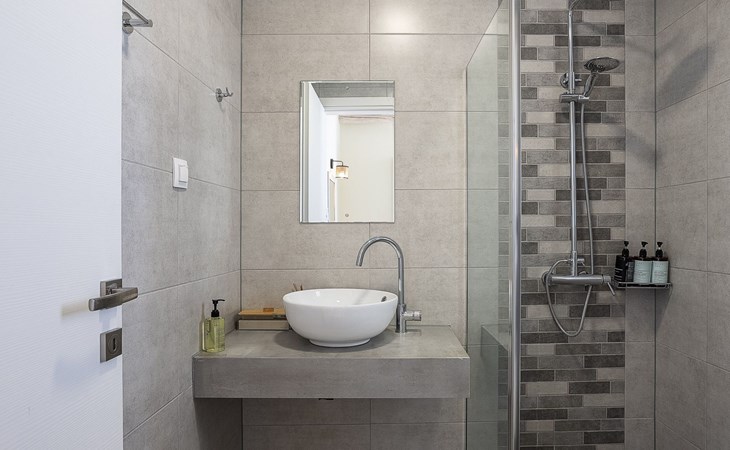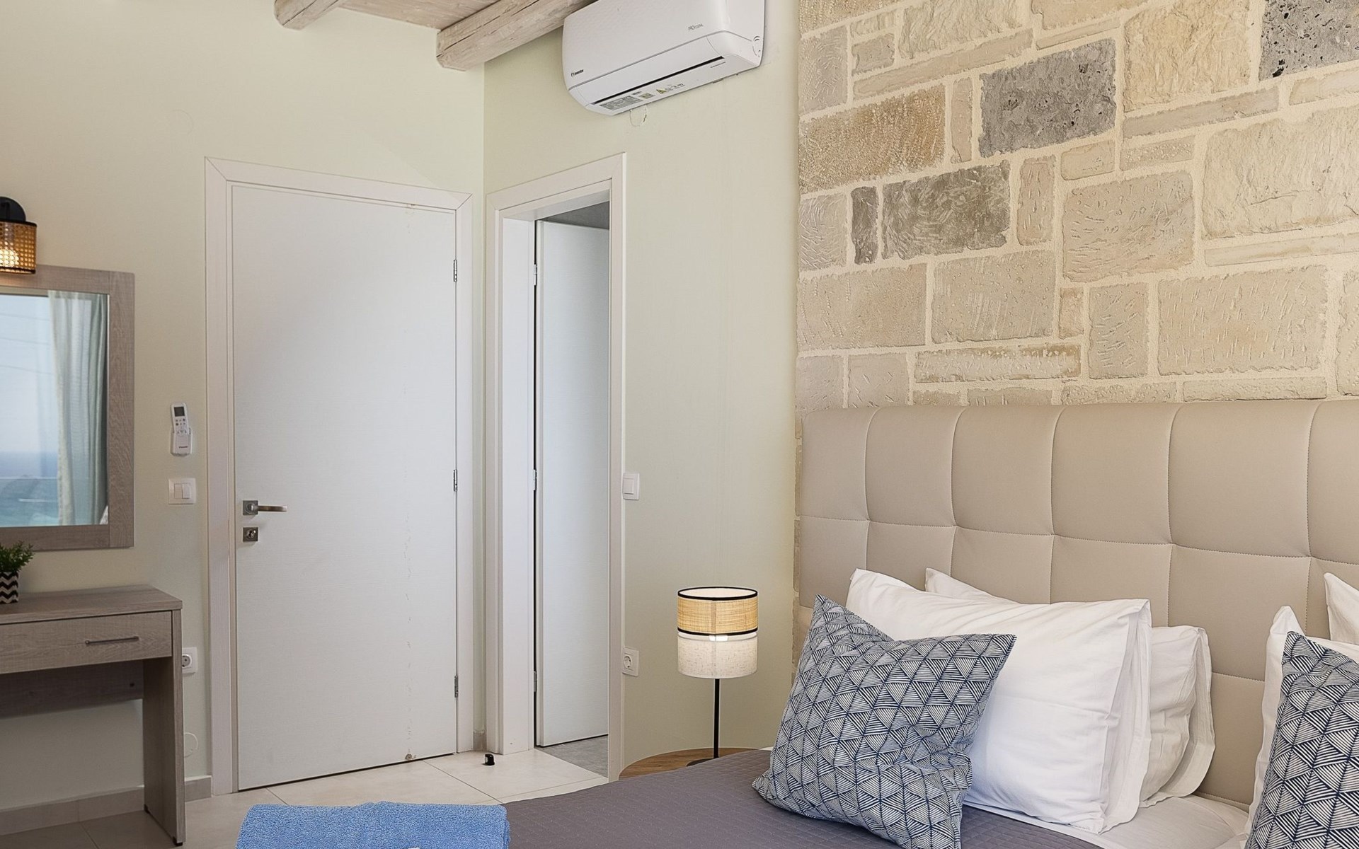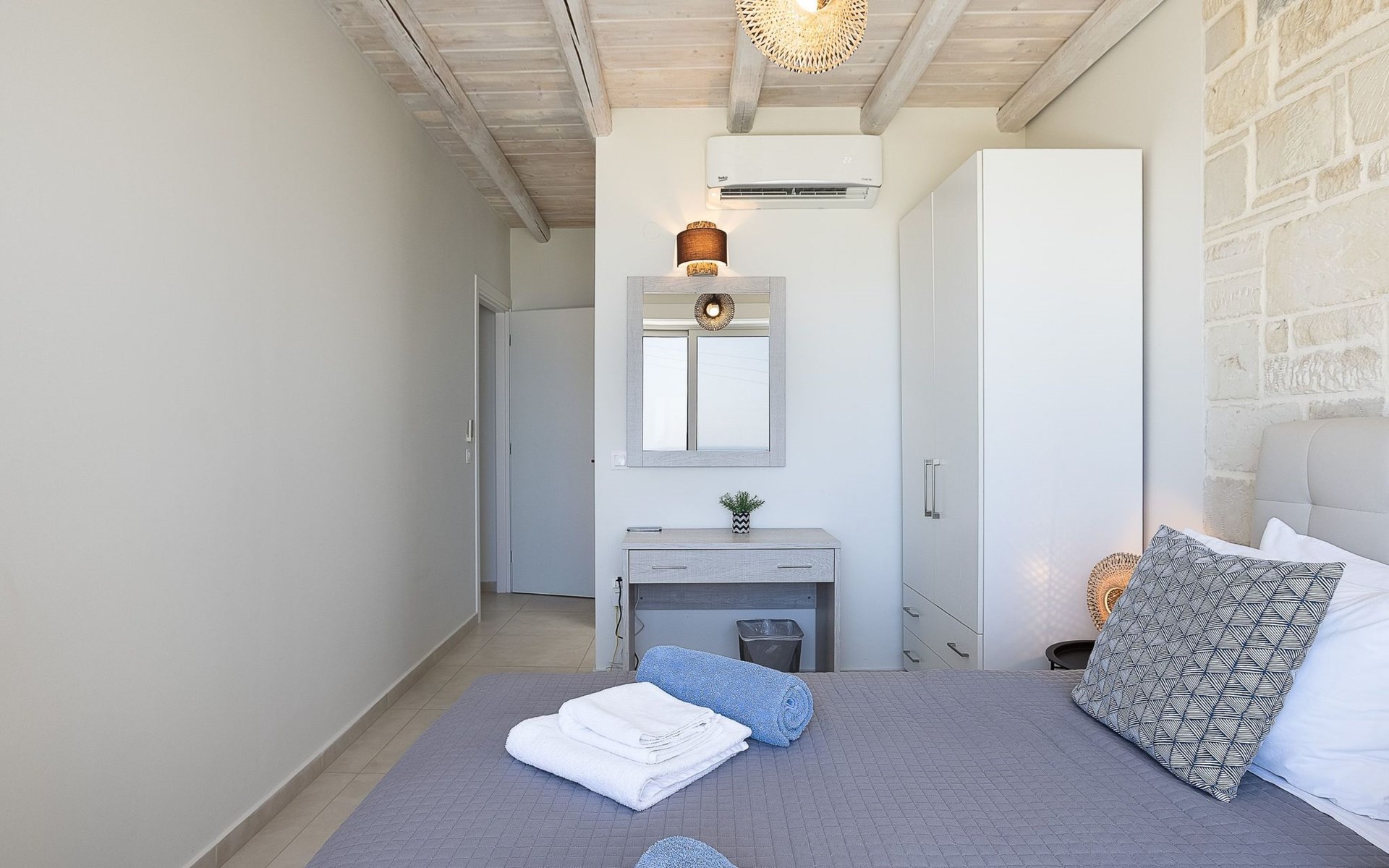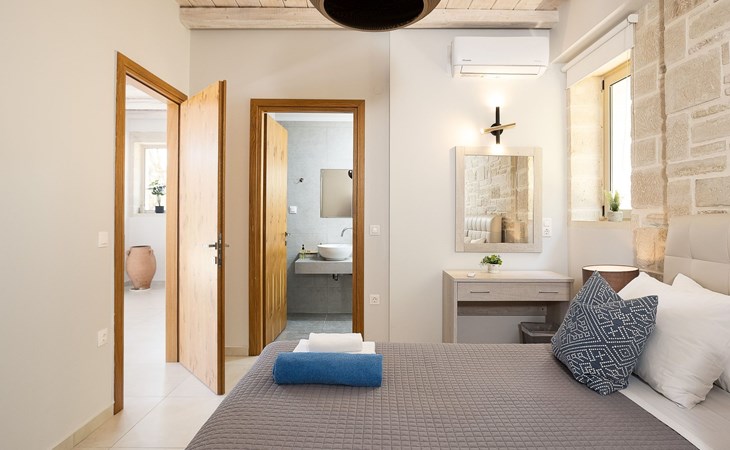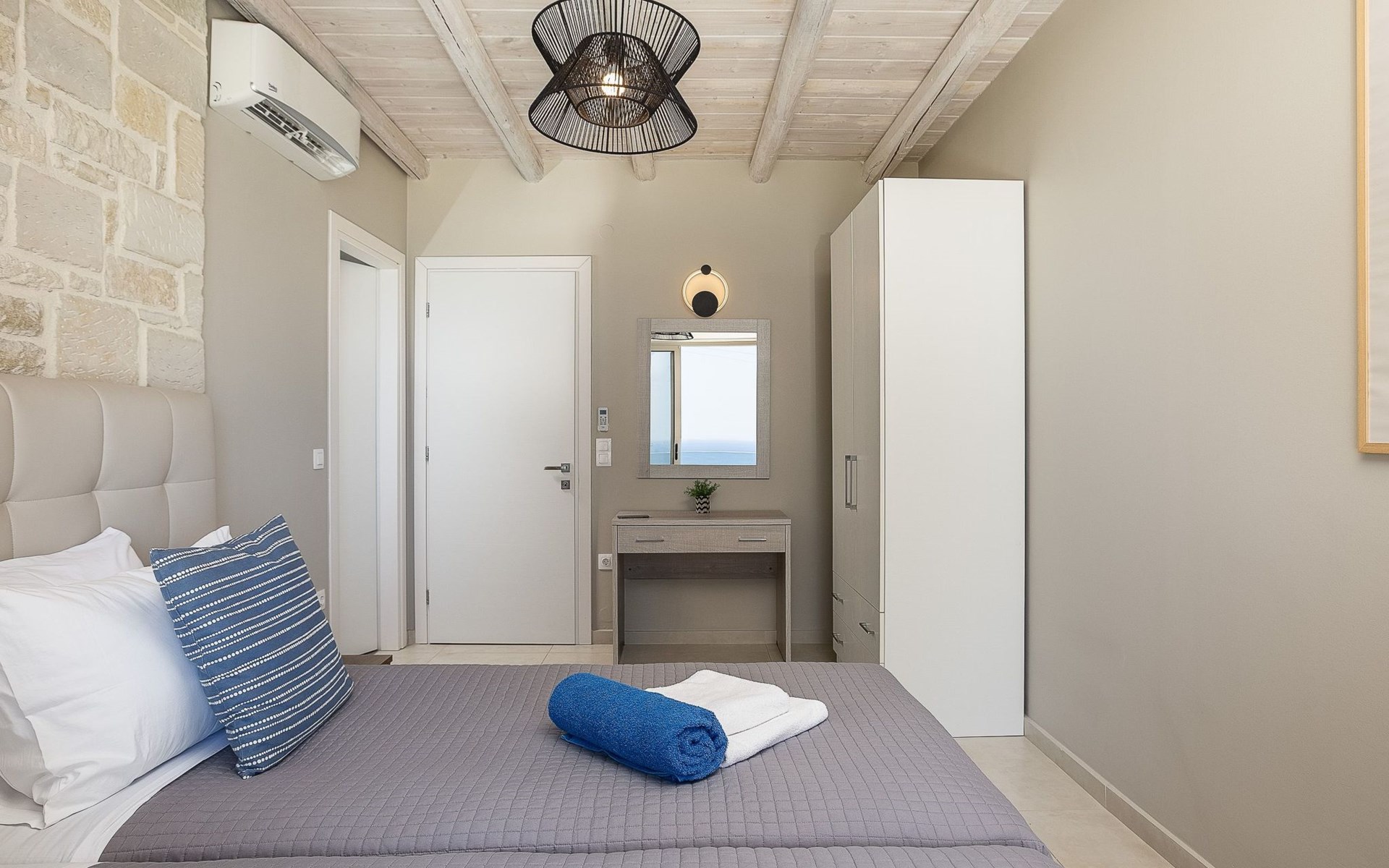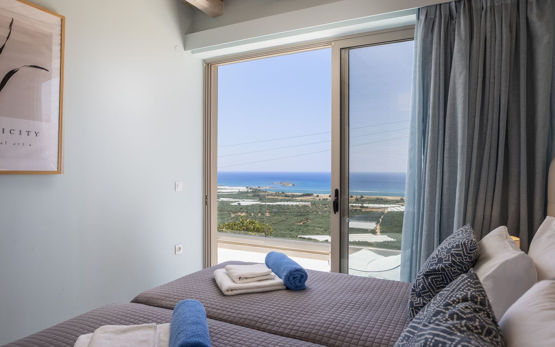 Step inside Villa Elpida, finding a stylish interior that matches the enchanting surrounding of the area. Minimal yet ultimately comfortable, the main living room features large windows gazing at outstanding views of the natural landscape and the Mediterranean Sea. The kitchen is equipped with modern electrical appliances. Five spacious bedrooms with ensuite bathrooms are comfortably dominated by the two floors offering moments of serenity and privacy for all its guests. One bedroom with a double size bed is located on the ground floor with an ensuite bathroom with a shower. The rest bedrooms are located on the first floor two with double-size beds and two with twin-size beds with ensuite bathrooms and a balcony with a sea view.