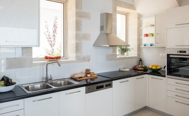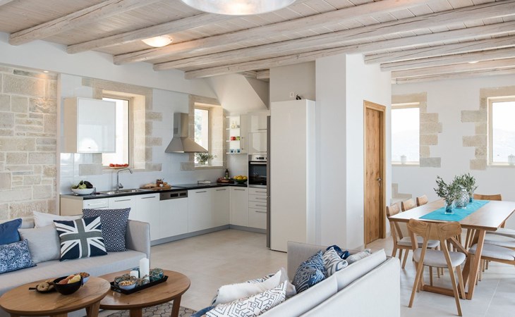 Open plan fully equipped kitchen with a dining area for 8 guests and modern appliances