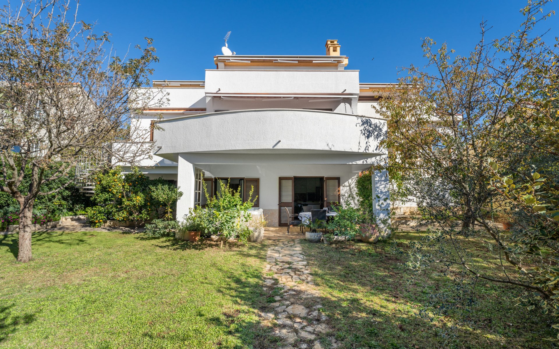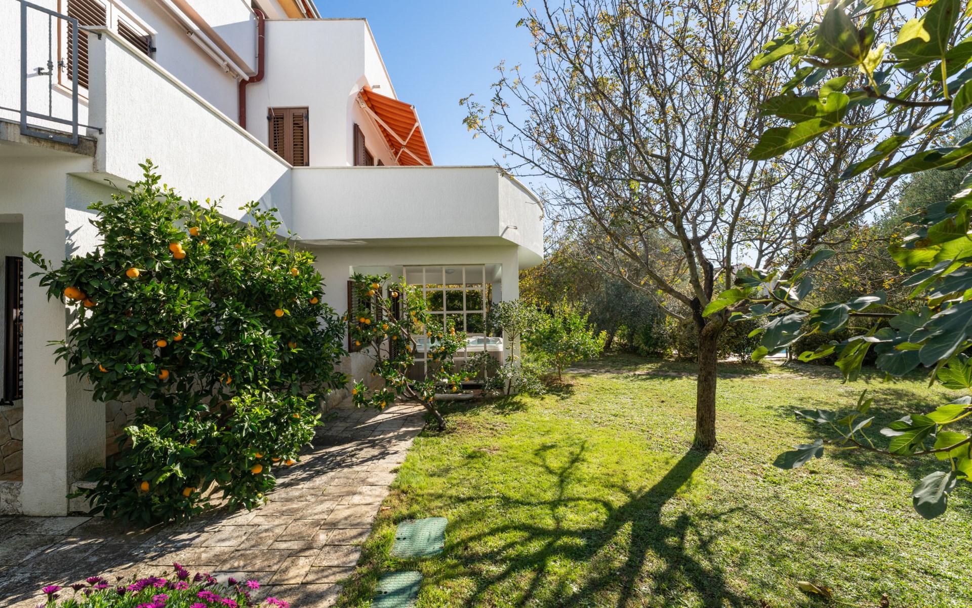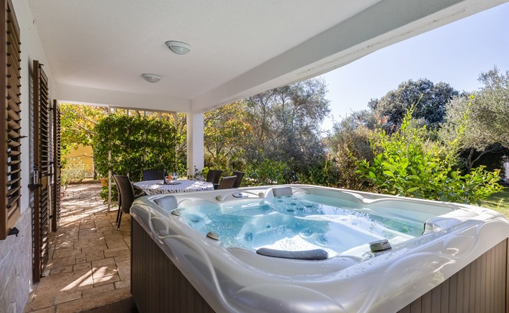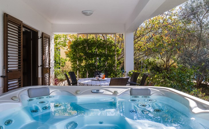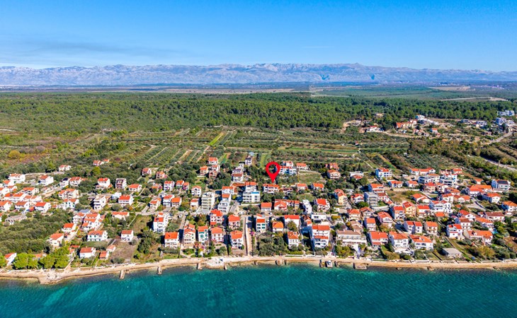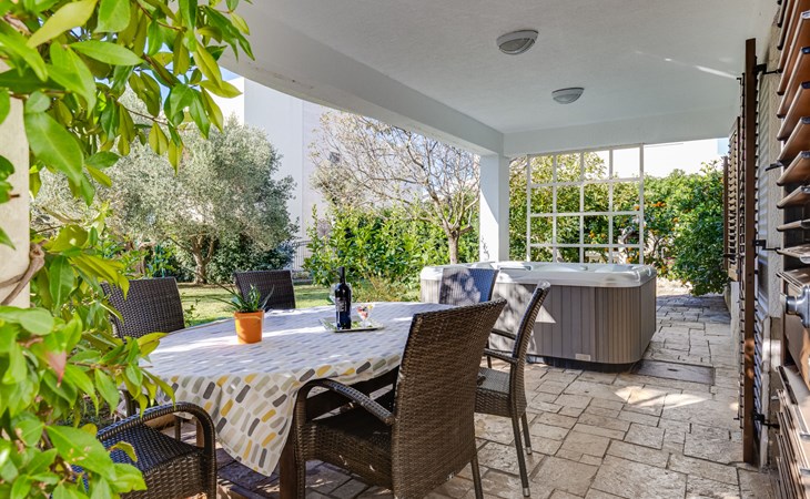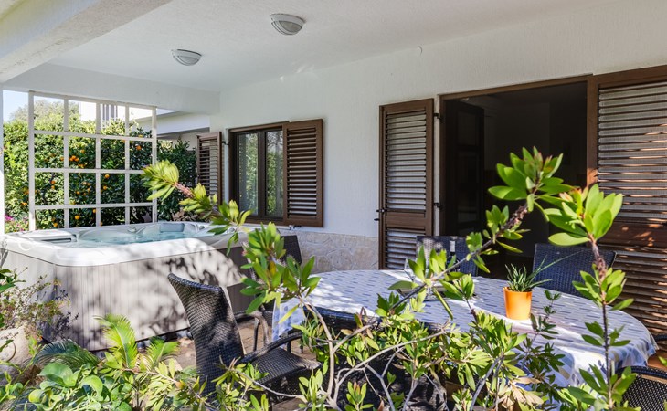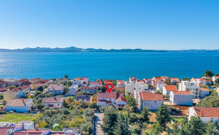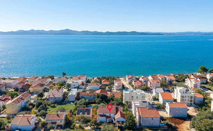 Beautiful, cosy 3-family house "Anica". In the district of Diklo, 6 km from the centre of Zadar, outside the resort, in a quiet, sunny, elevated position in the residential district, 150 m from the sea, 150 m from the beach, in the countryside, south facing position. For shared use: property 300 m2 (fenced), garden with lawn and trees. Private: hot tub, parking at the house on the premises. Shop 400 m, restaurant 450 m, bus stop 400 m, rocky beach 300 m, public bathing area 2.5 km, concrete beach 150 m. Tennis, sports centre 400 m.