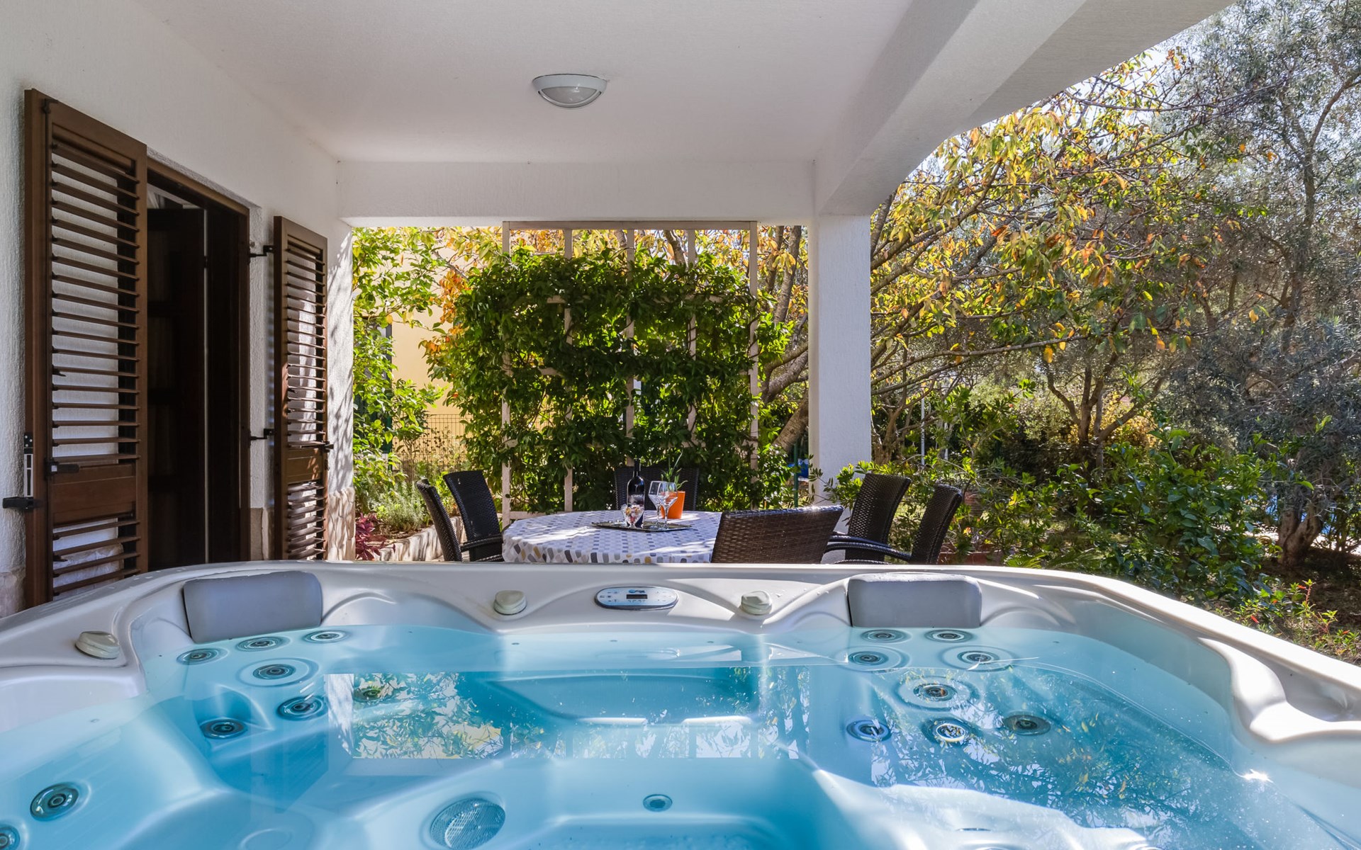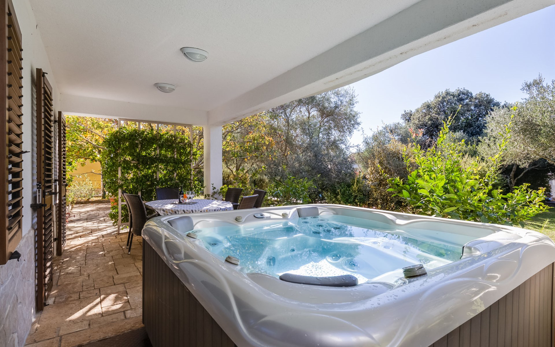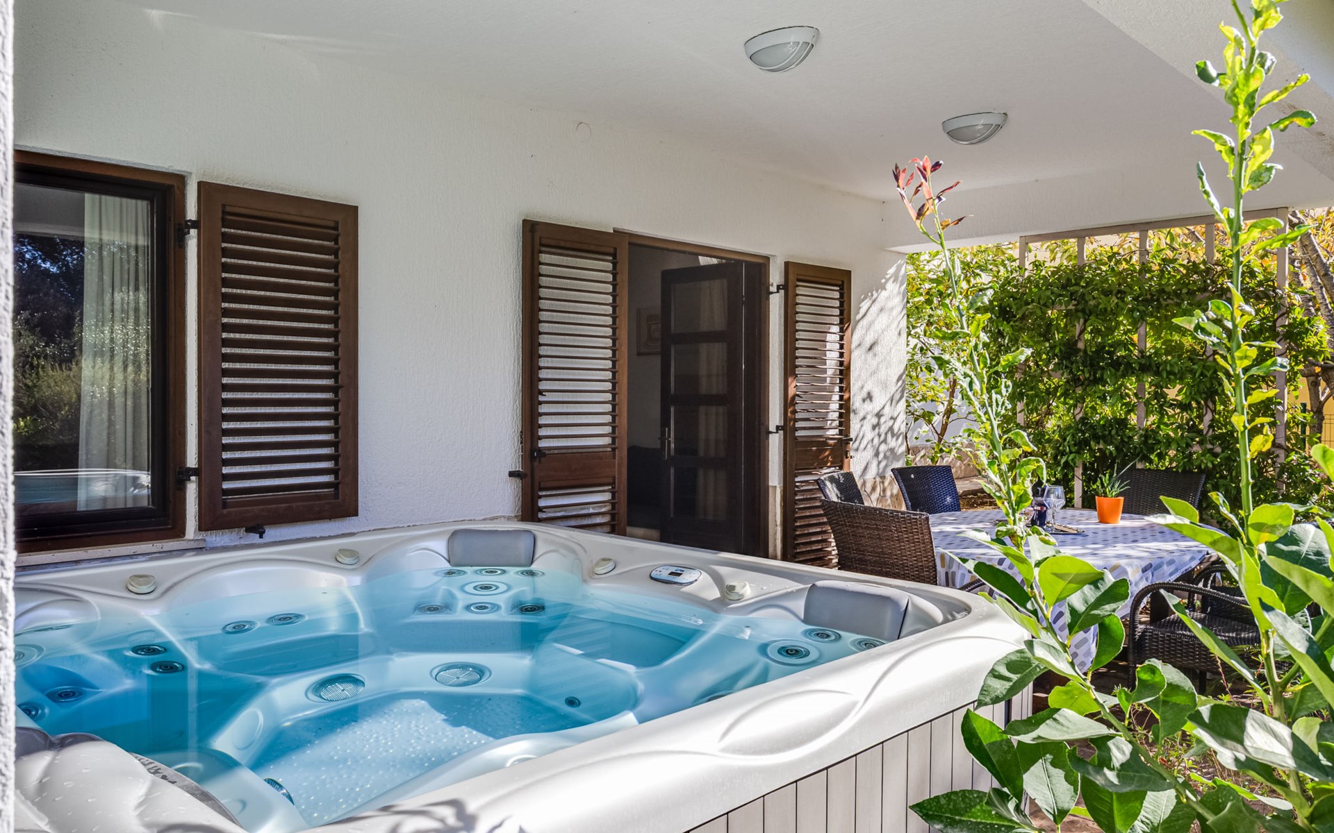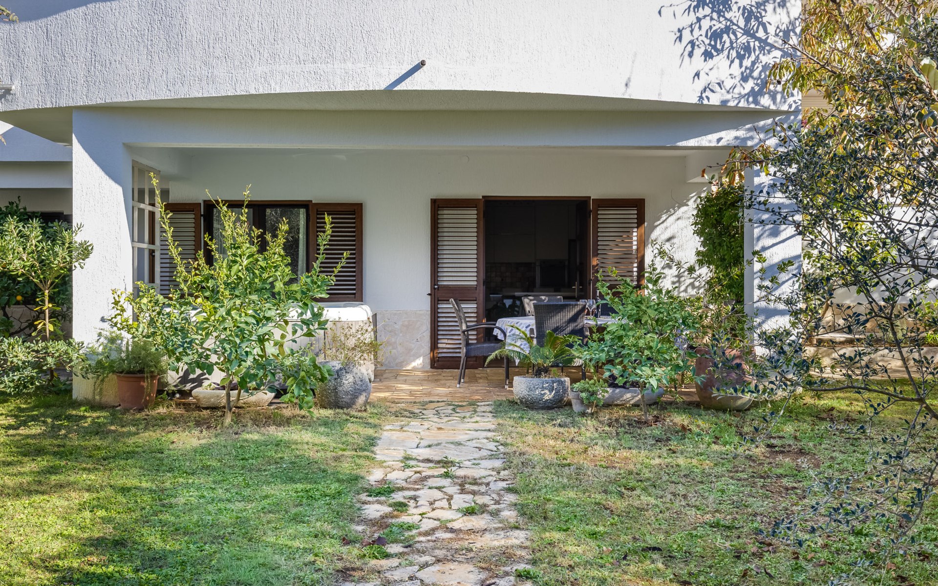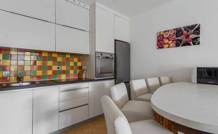 Beautiful, cosy 3-family house "Anica". In the district of Diklo, 6 km from the centre of Zadar, outside the resort, in a quiet, sunny, elevated position in the residential district, 150 m from the sea, 150 m from the beach, in the countryside, south facing position. For shared use: property 300 m2 (fenced), garden with lawn and trees. Private: hot tub, parking at the house on the premises. Shop 400 m, restaurant 450 m, bus stop 400 m, rocky beach 300 m, public bathing area 2.5 km, concrete beach 150 m. Tennis, sports centre 400 m.