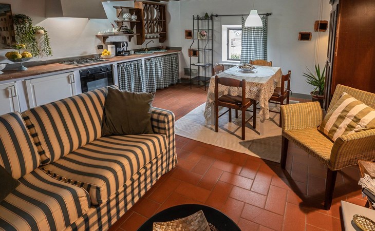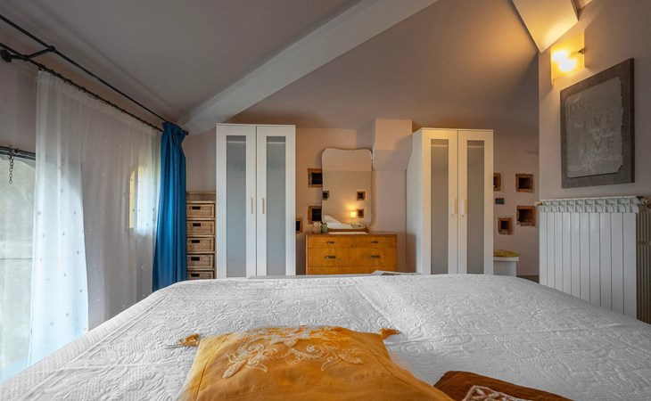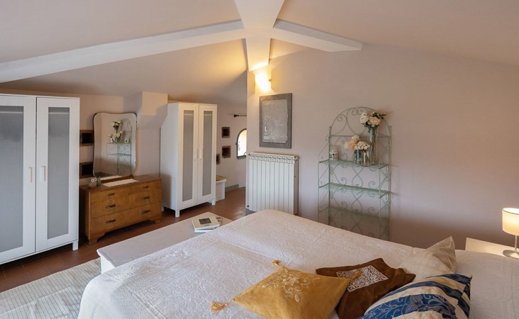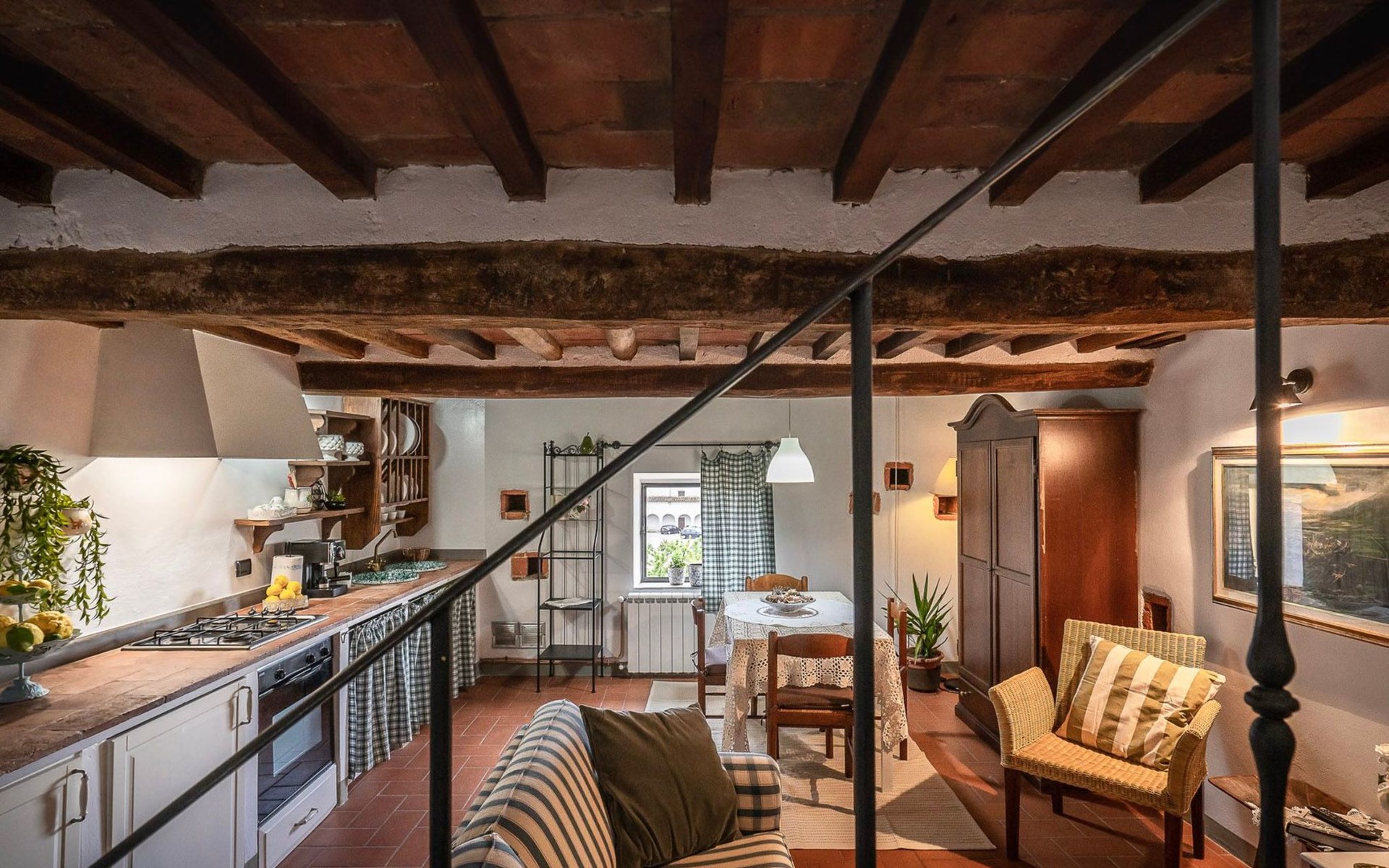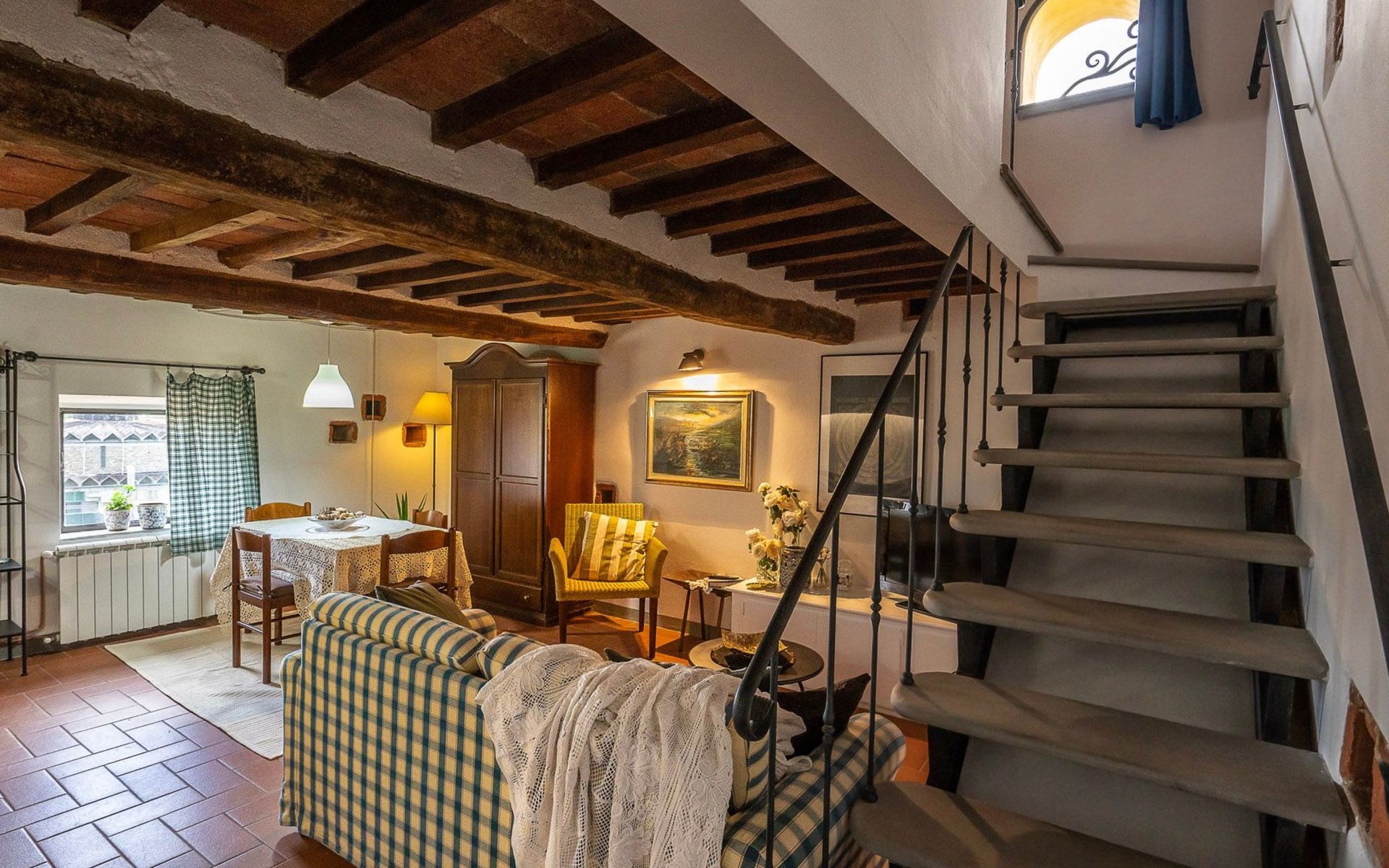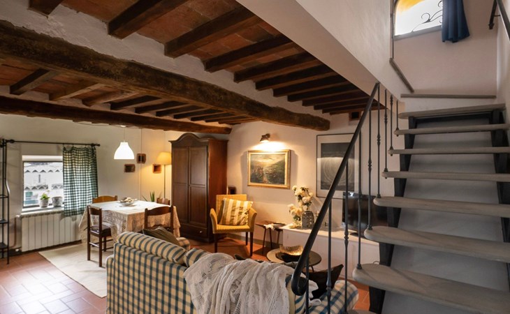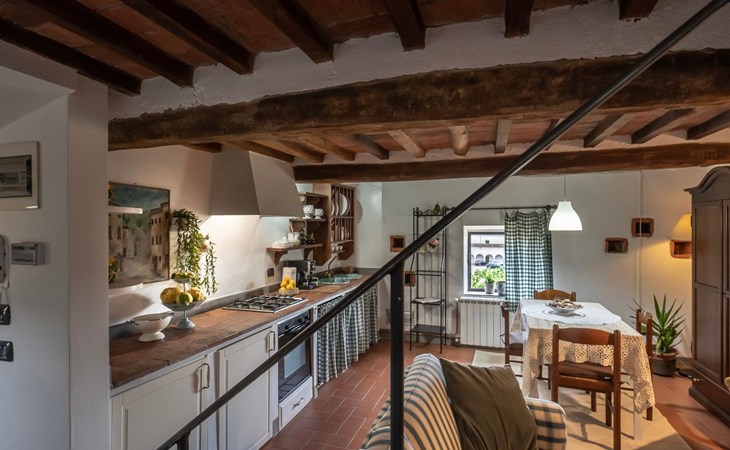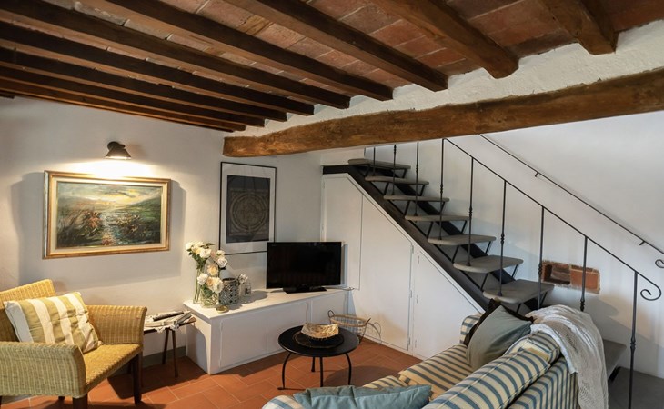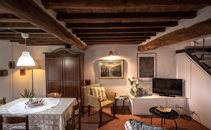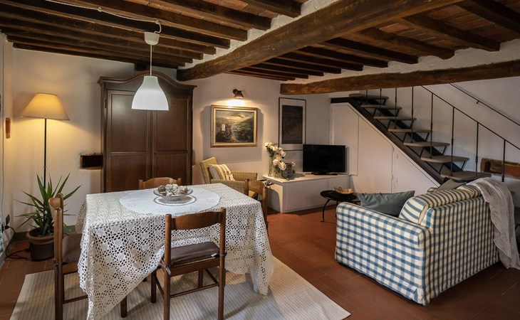 The living area consists of a kitchen, dining table and relaxation area. Going upstairs you will find the sleeping area with double bedroom and bathroom. La Colombaia apt has heating, air conditioning (for the sleeping area) and private parking inside.
