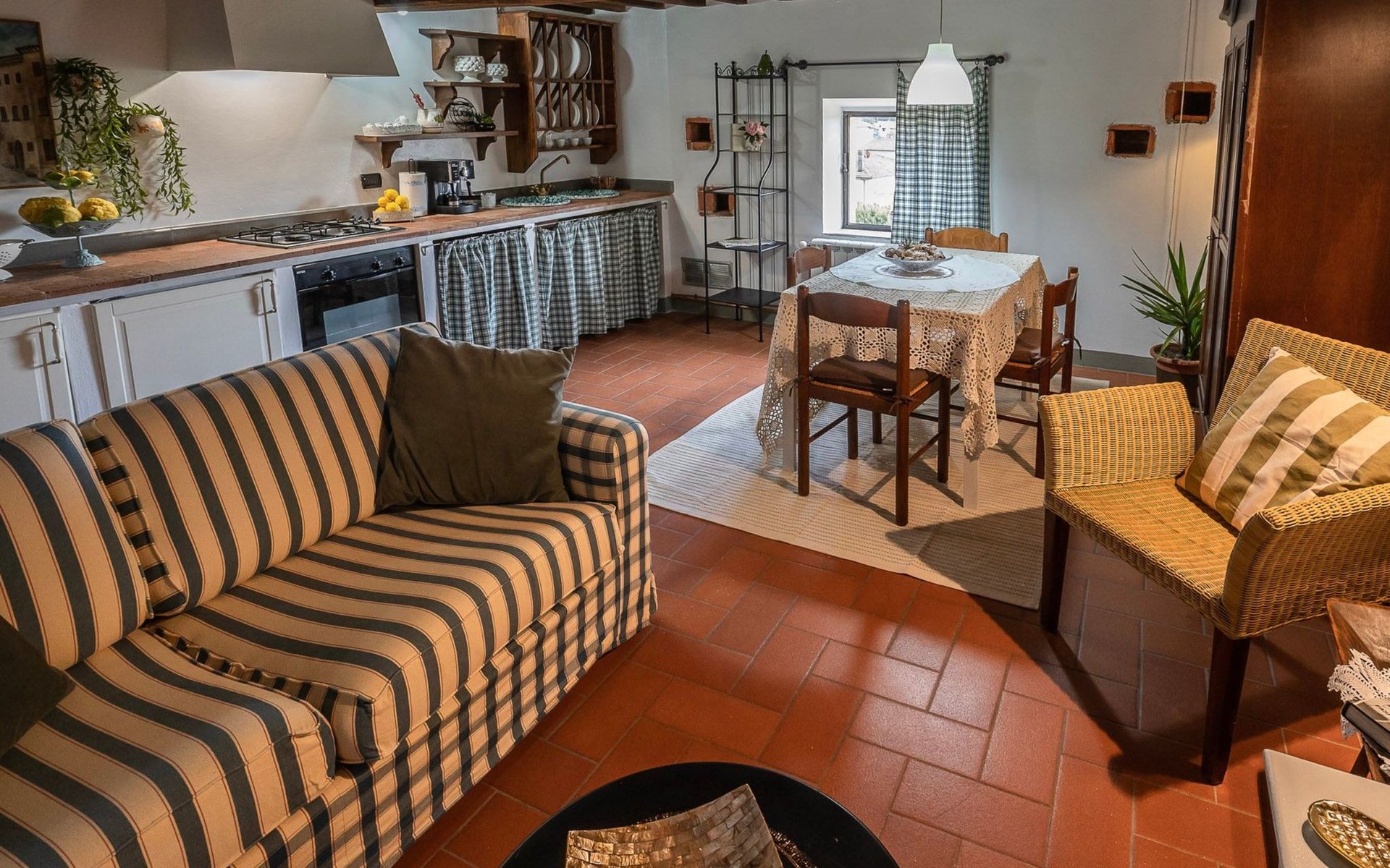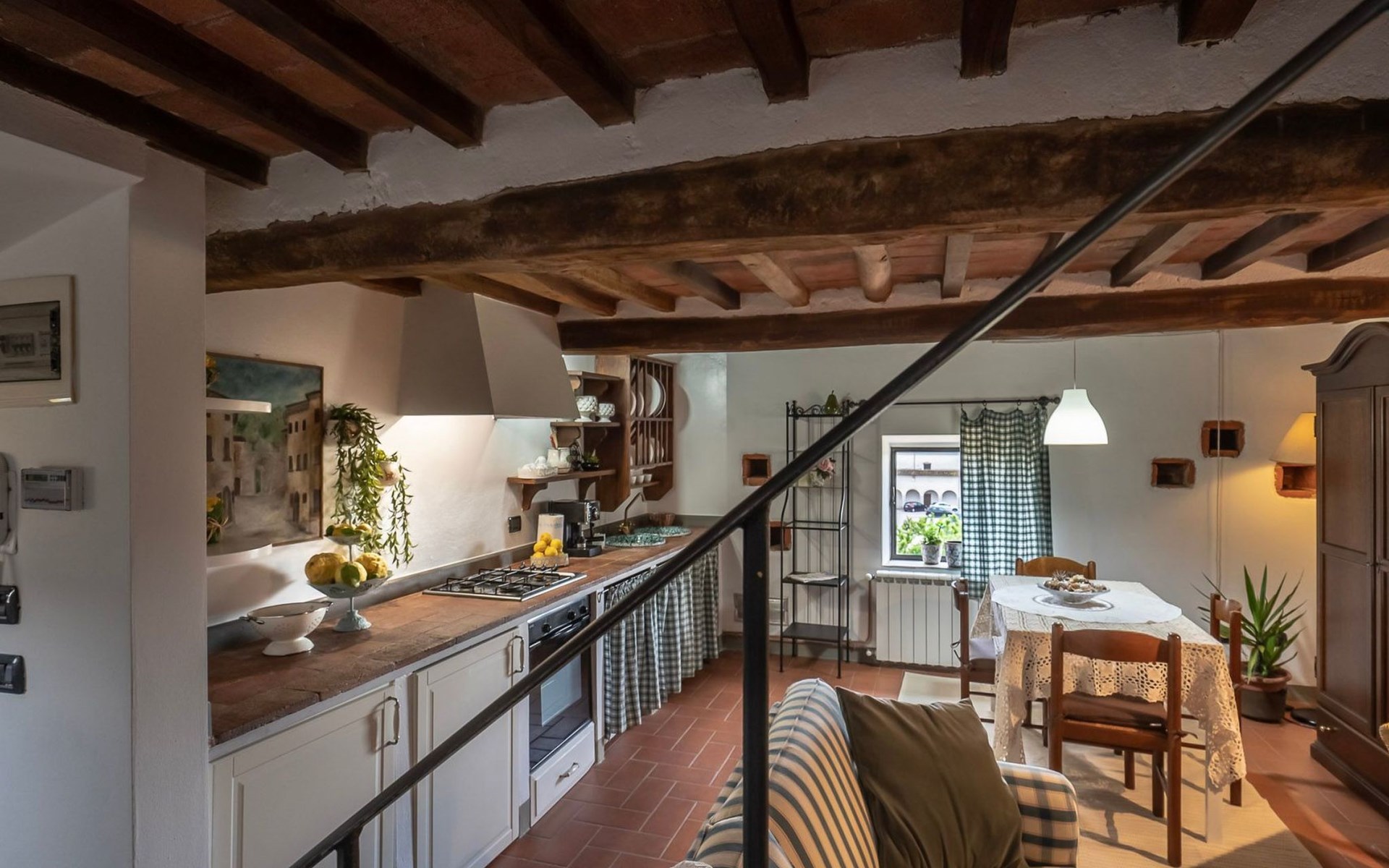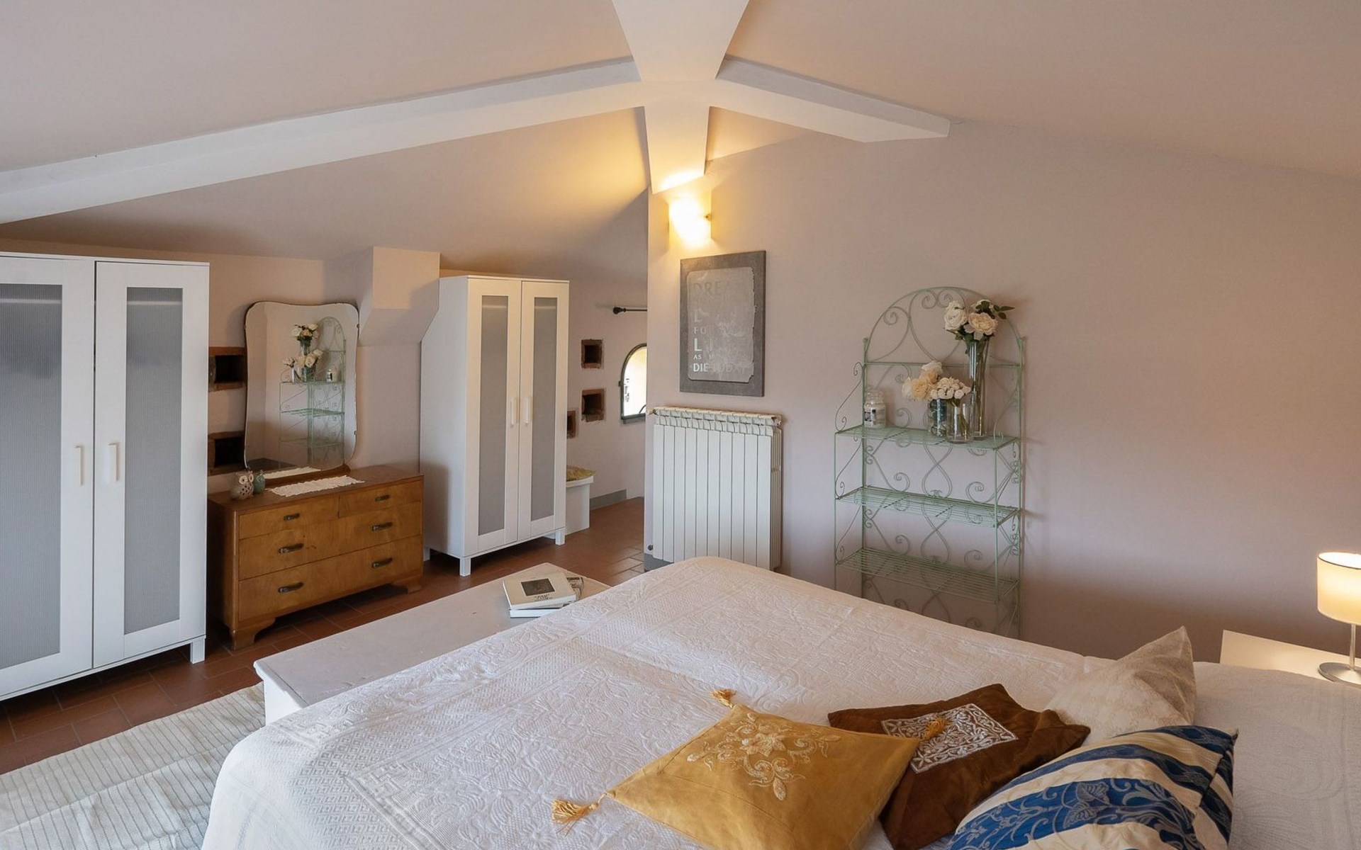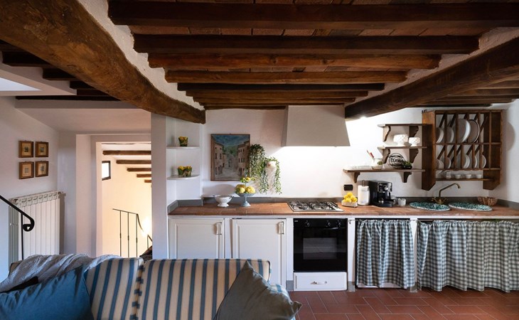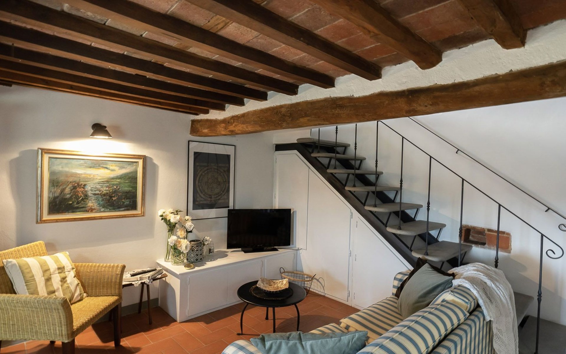 The living area consists of a kitchen, dining table and relaxation area. Going upstairs you will find the sleeping area with double bedroom and bathroom. La Colombaia apt has heating, air conditioning (for the sleeping area) and private parking inside.