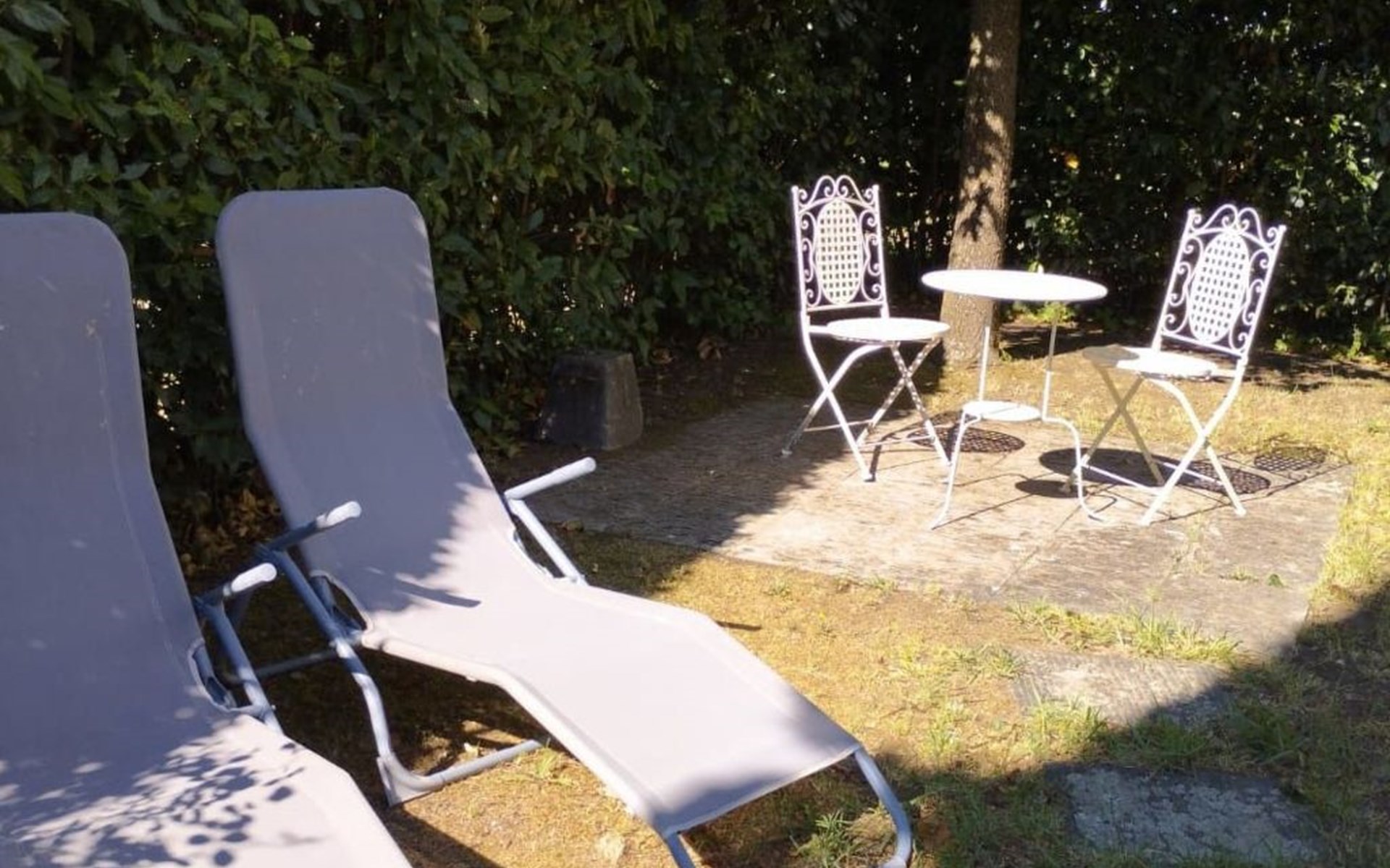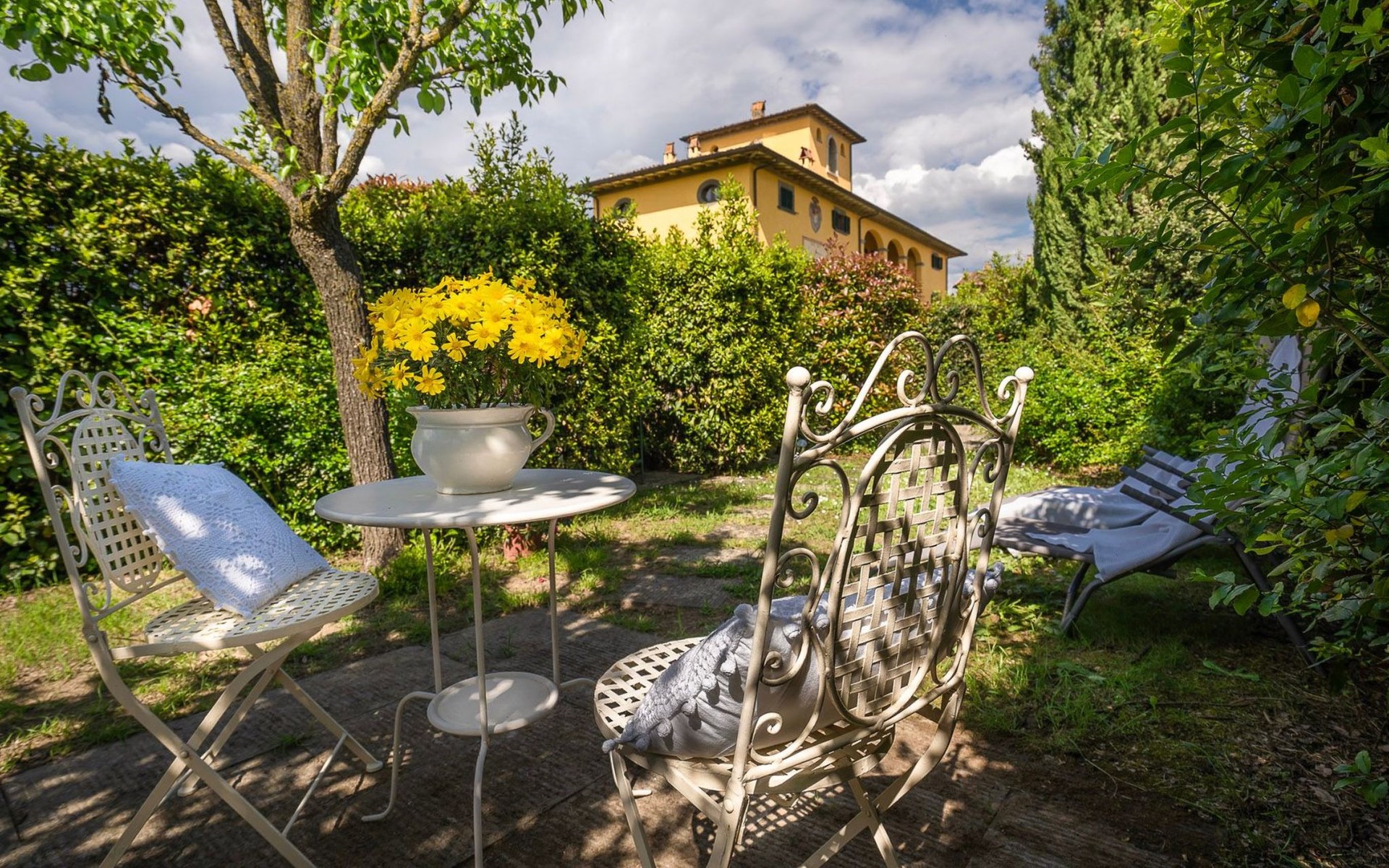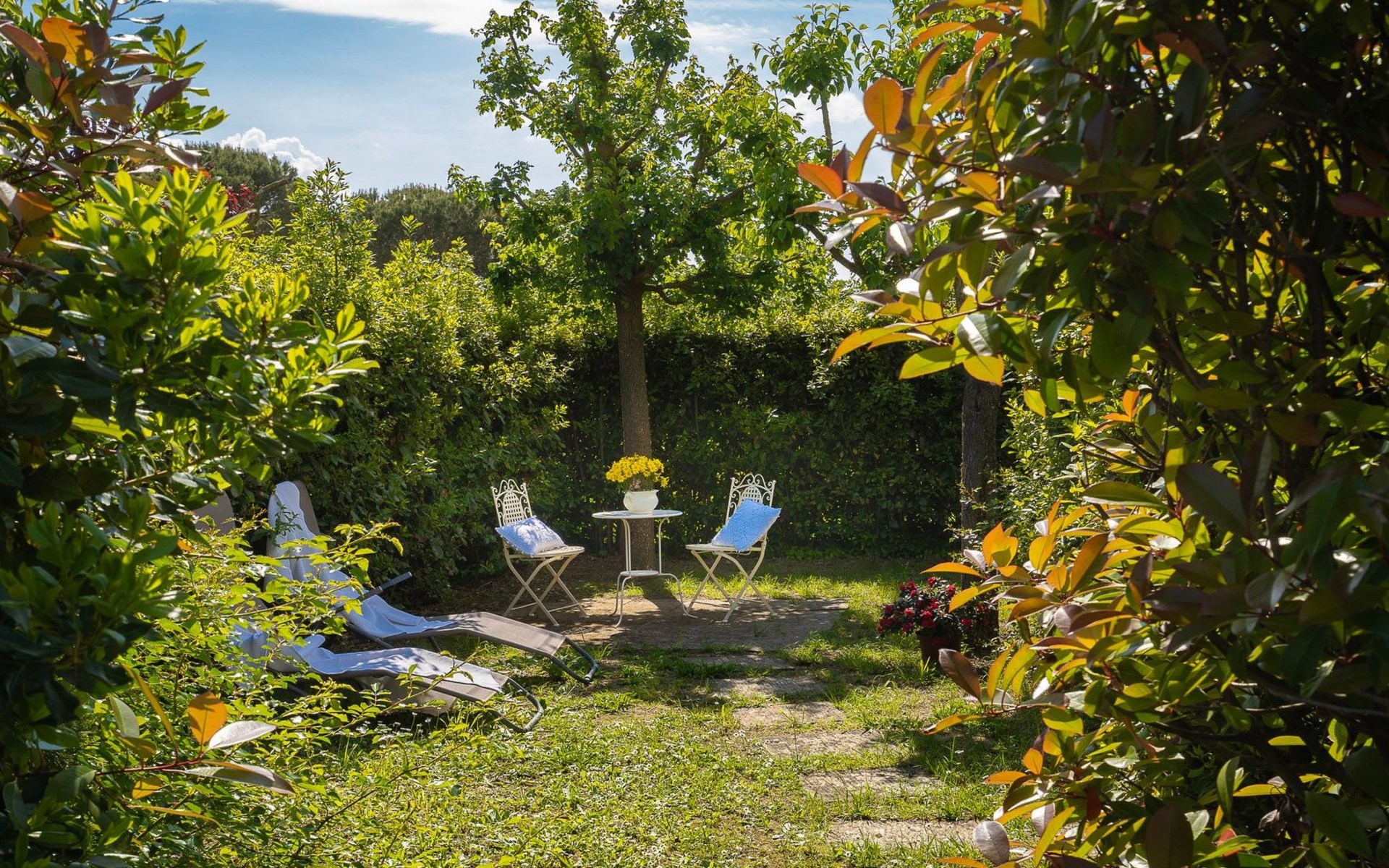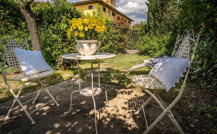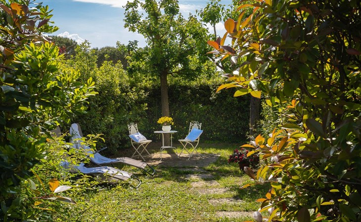 In the garden of the villa each flat has its own private and reserved area, divided by high hedges. The one in the Colombaia apt is furnished with white iron seats and two comfortable deckchairs.