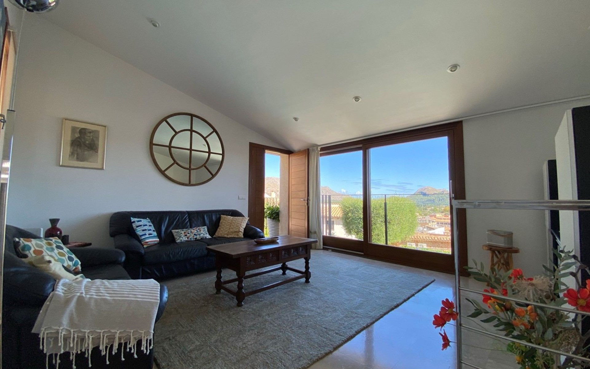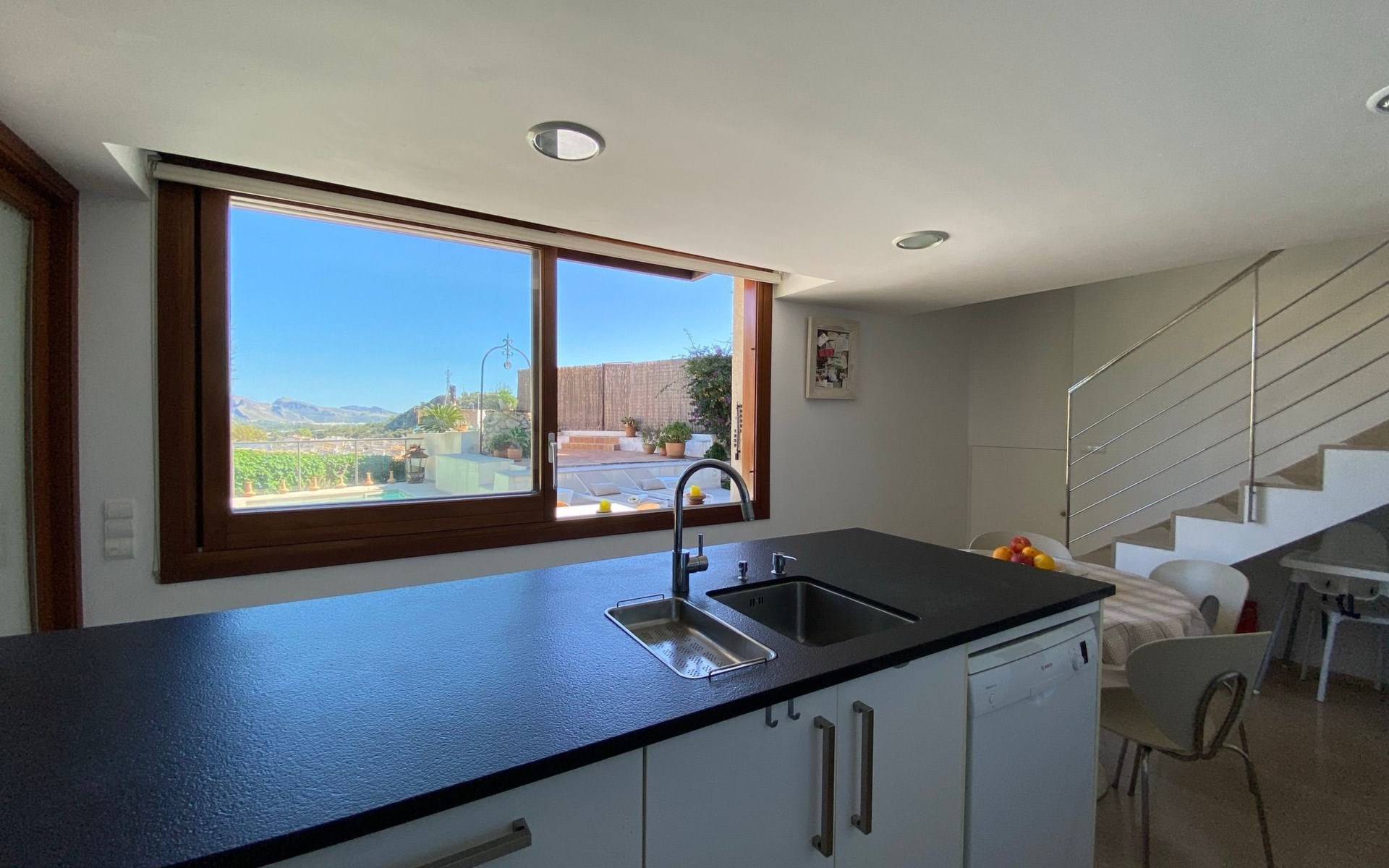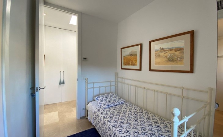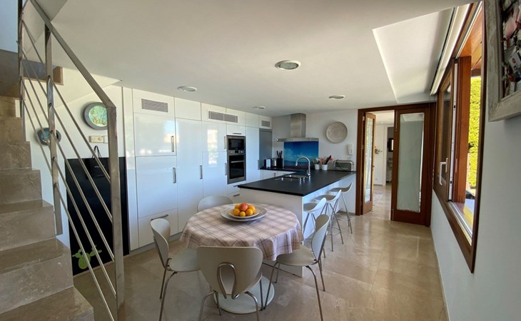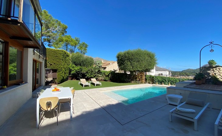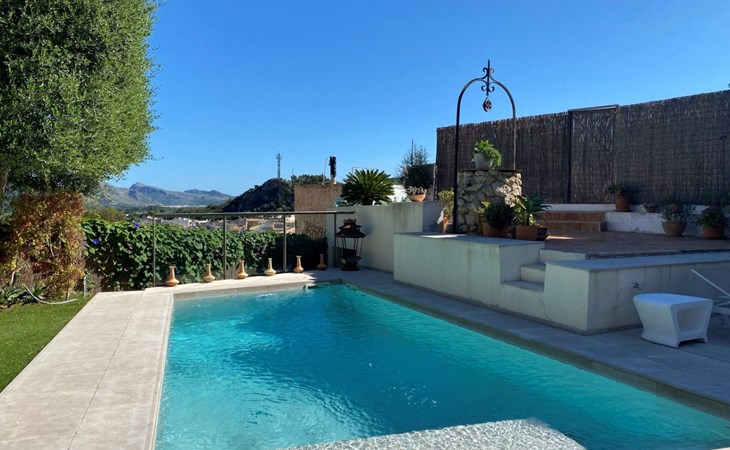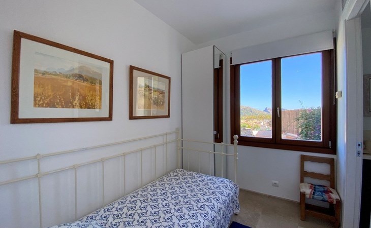 New house located at the top of Pollensa, with views to the bay of Pollensa and Alcudia. Fully equipped with quality furnishings for exquisite comfort during your stay on the island. The house has two levels, equipped with air conditioning in all rooms, living room with comfortable sofas and satellite TV, DVD player, radio and CD player. Fully equipped kitchen with high quality appliances, induction cooker, multipurpose microwave, oven, fridge/freezer. Master bedroom with king size bed. One single bedroom, plus a sofa bed that sleeps 1 or two people. A cot is also available if required.