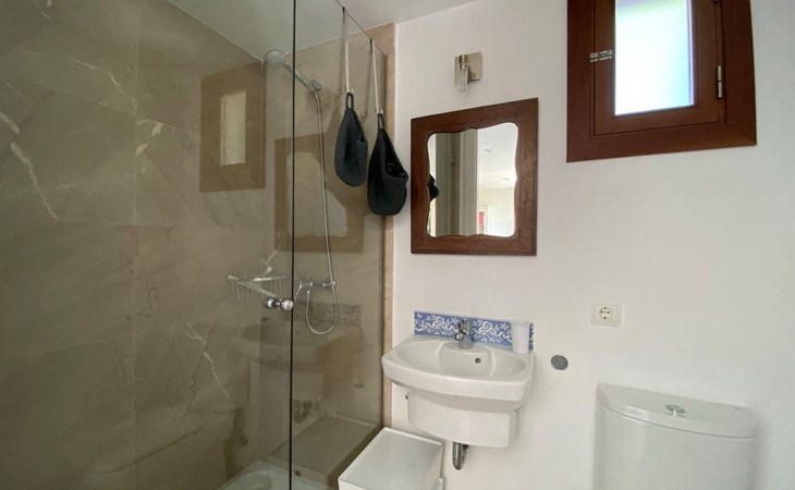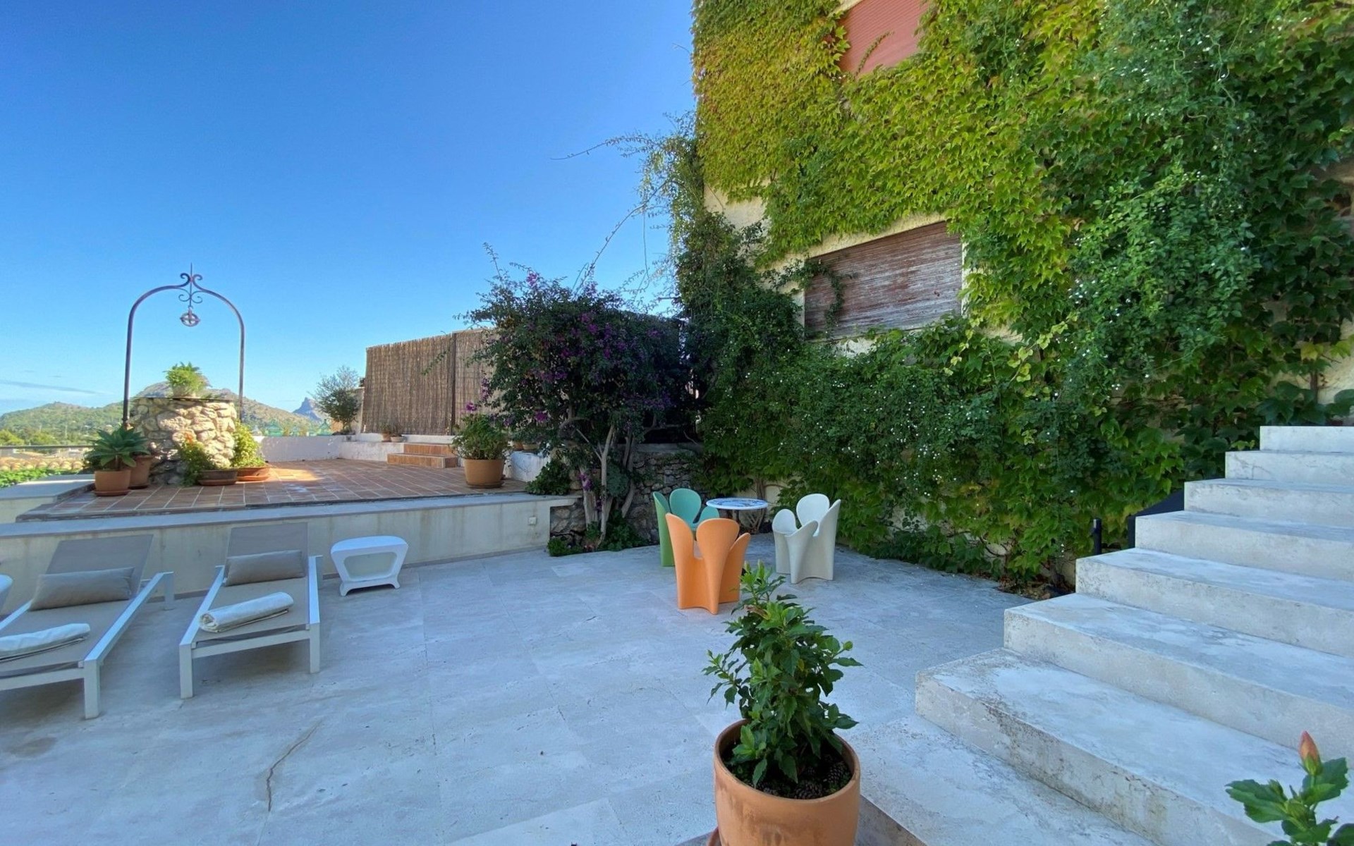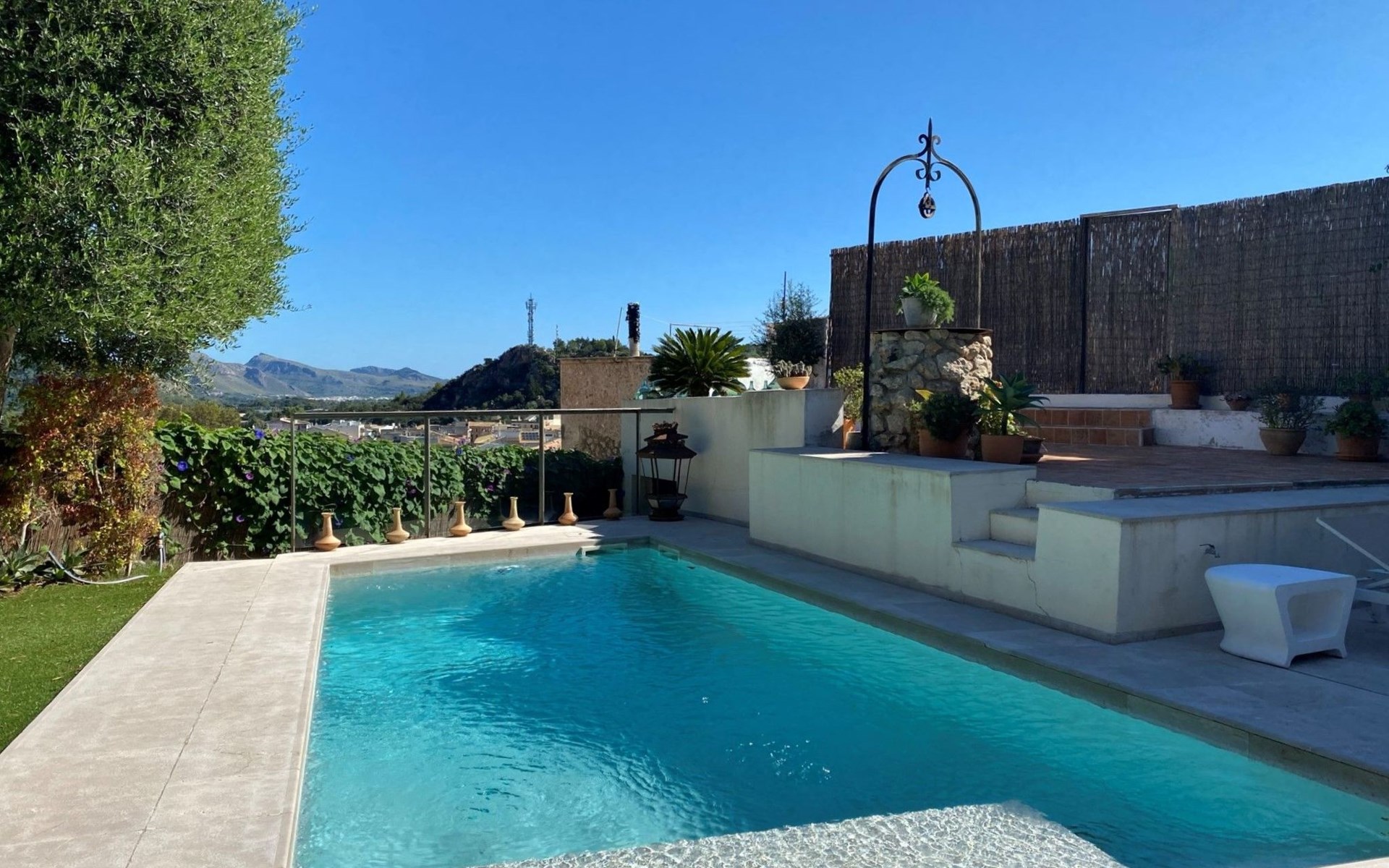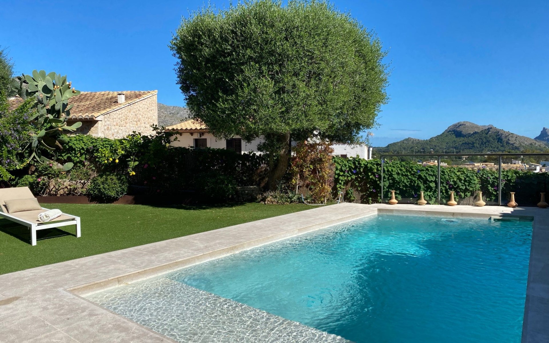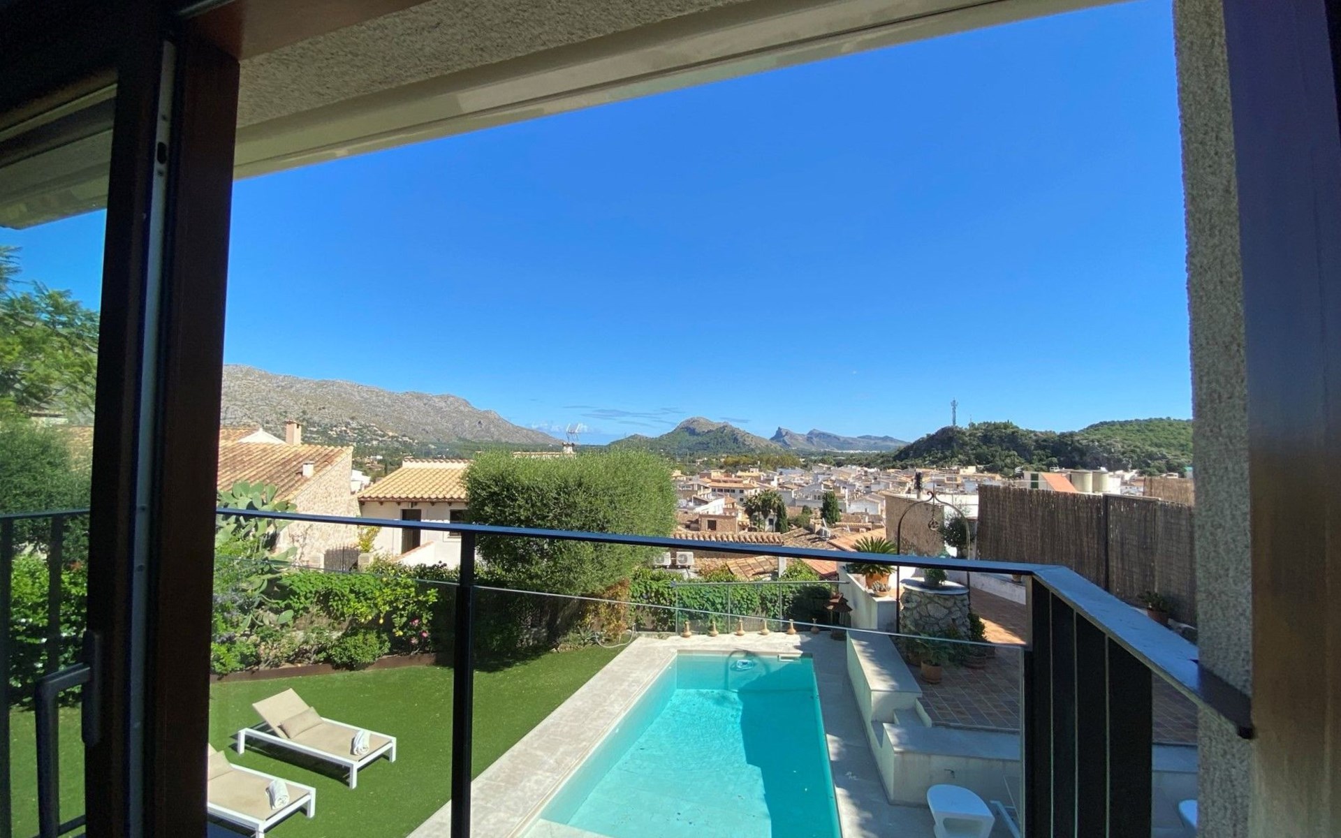 New house located at the top of Pollensa, with views to the bay of Pollensa and Alcudia. Fully equipped with quality furnishings for exquisite comfort during your stay on the island. The house has two levels, equipped with air conditioning in all rooms, living room with comfortable sofas and satellite TV, DVD player, radio and CD player. Fully equipped kitchen with high quality appliances, induction cooker, multipurpose microwave, oven, fridge/freezer. Master bedroom with king size bed. One single bedroom, plus a sofa bed that sleeps 1 or two people. A cot is also available if required.