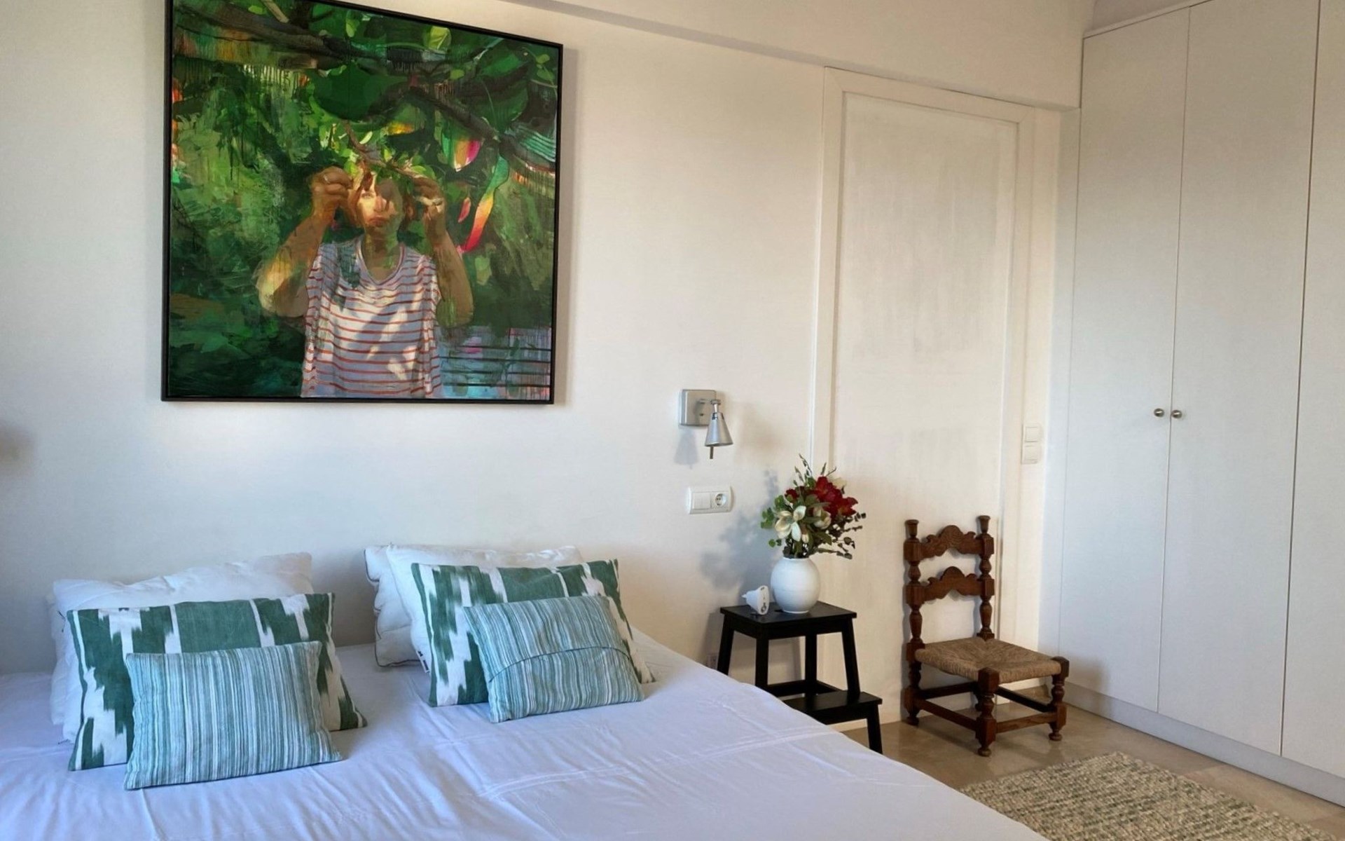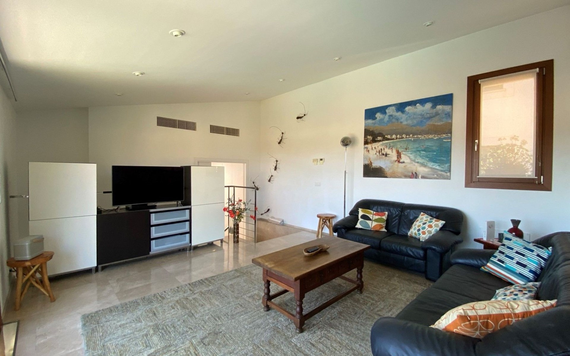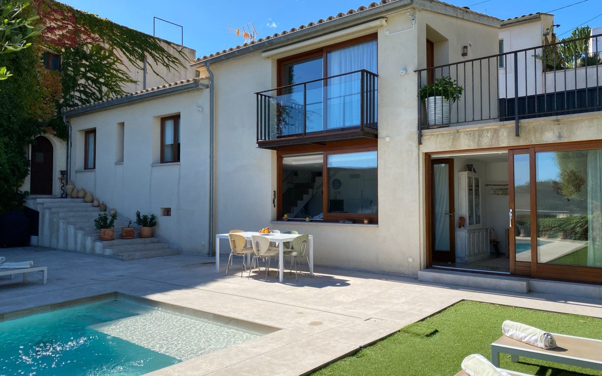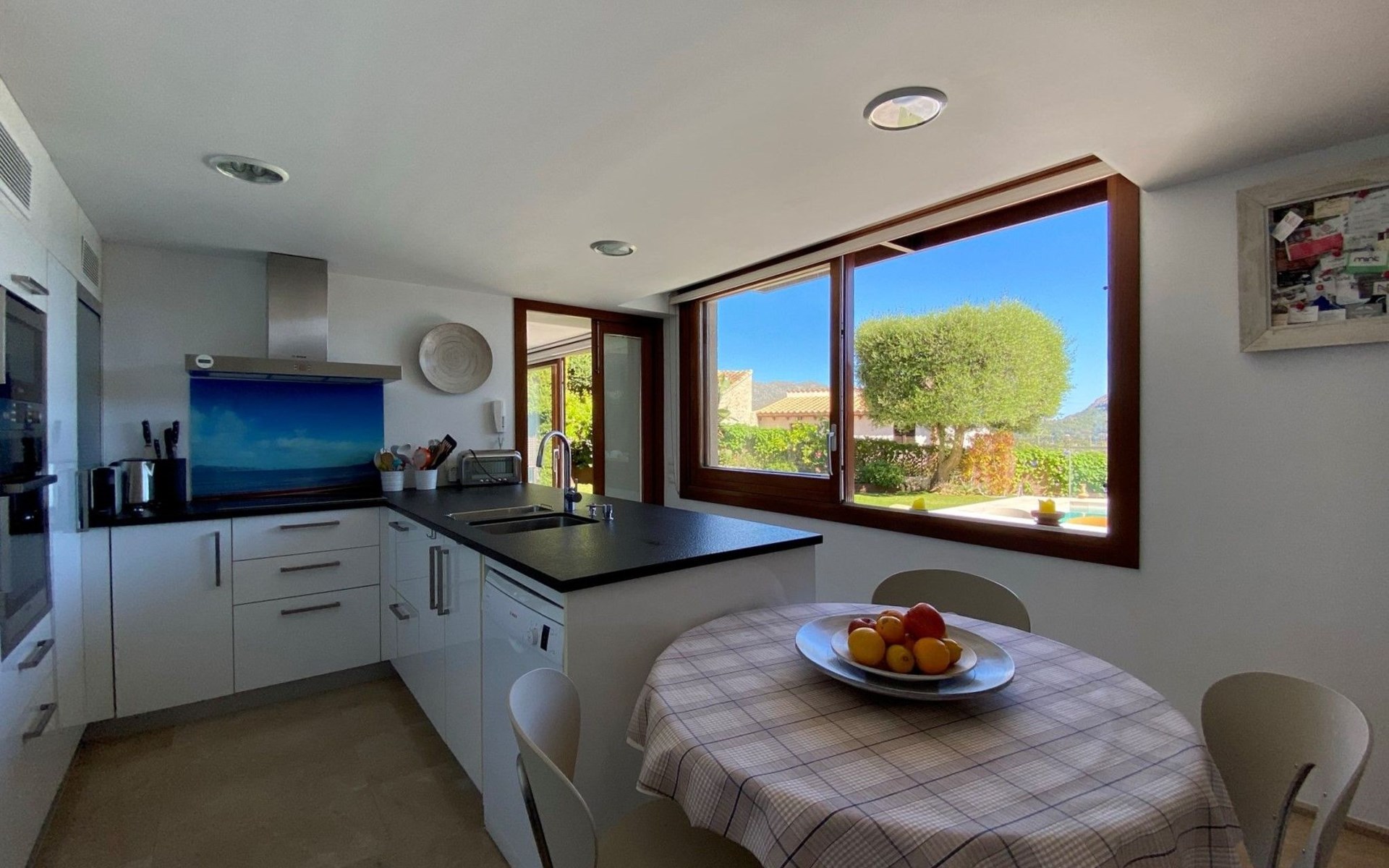 New house located at the top of Pollensa, with views to the bay of Pollensa and Alcudia. Fully equipped with quality furnishings for exquisite comfort during your stay on the island. The house has two levels, equipped with air conditioning in all rooms, living room with comfortable sofas and satellite TV, DVD player, radio and CD player. Fully equipped kitchen with high quality appliances, induction cooker, multipurpose microwave, oven, fridge/freezer. Master bedroom with king size bed. One single bedroom, plus a sofa bed that sleeps 1 or two people. A cot is also available if required.