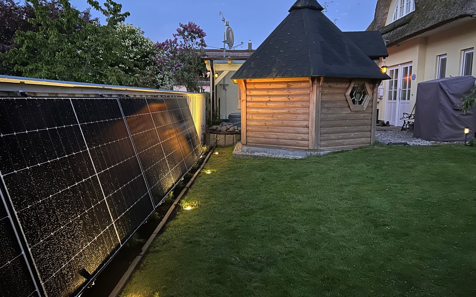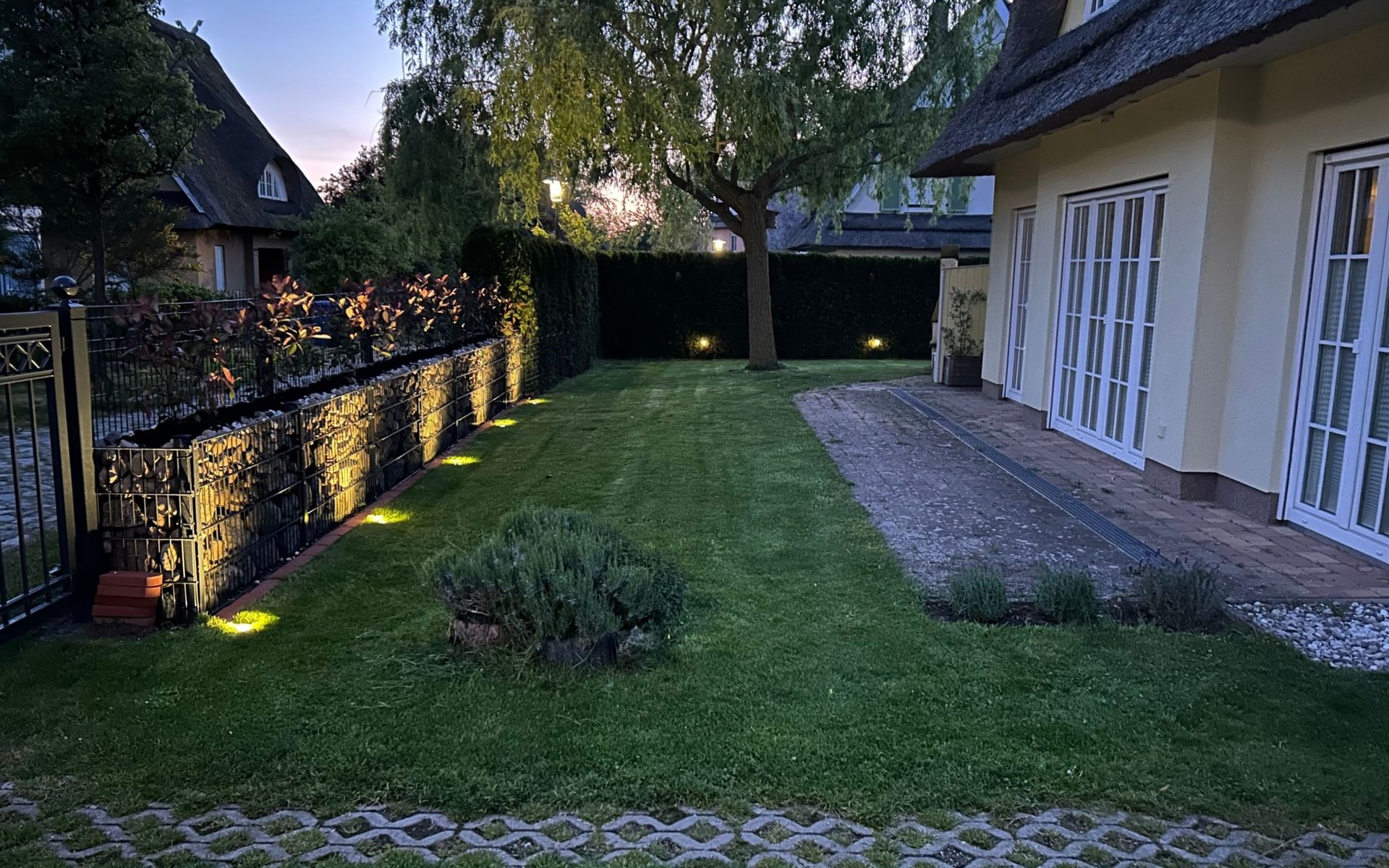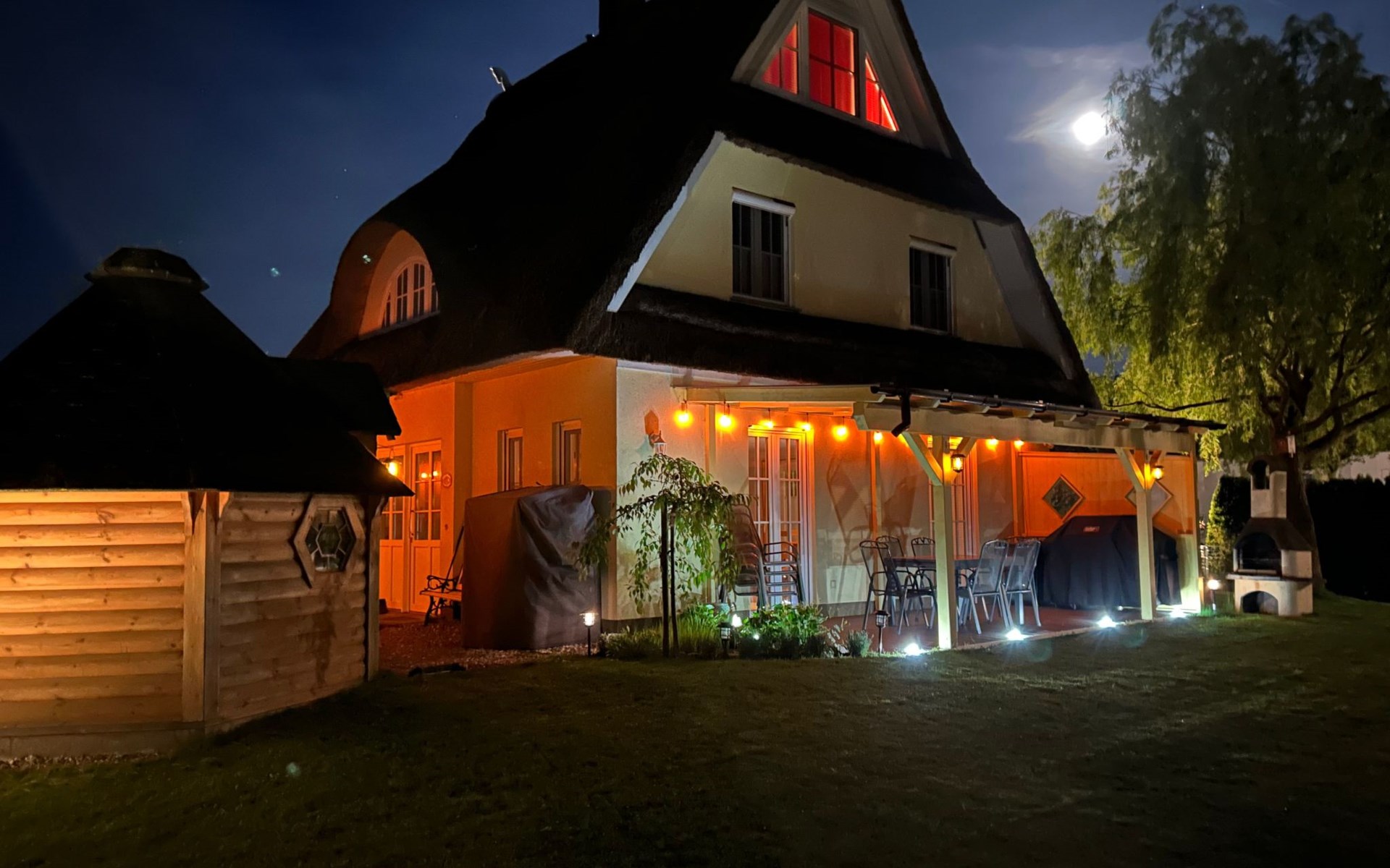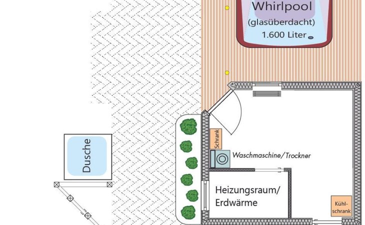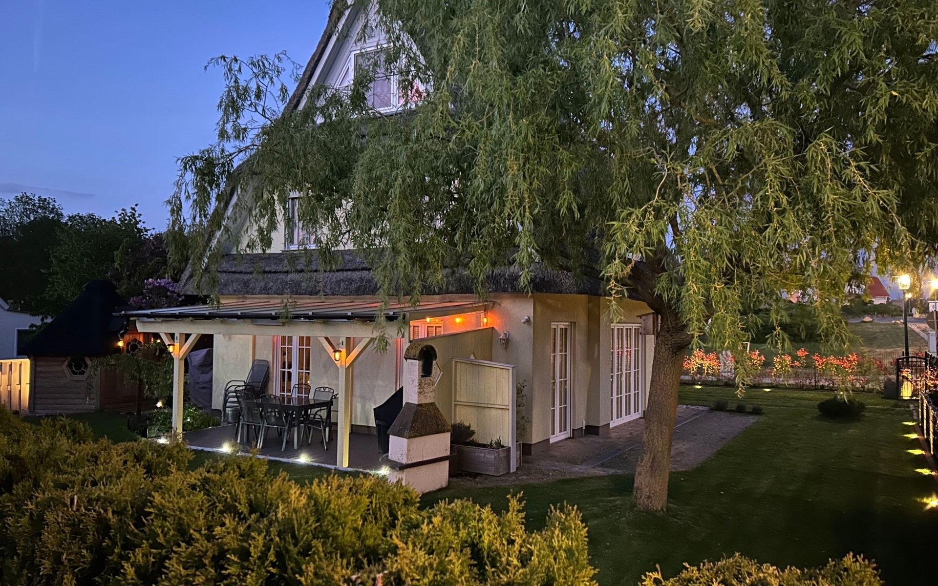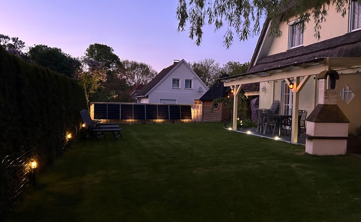 The spacious outdoor area includes a south-west-facing, fenced-in terrace with all-round privacy, where you will find a fireplace barbecue, a Weber gas barbecue and an outdoor fridge. Relaxation is provided by a Finnish sauna Kota and a covered outdoor whirlpool as well as an outdoor shower. The terrace and garden, romantically lit with LED floor spotlights, invite you to enjoy the evenings under the starry sky.