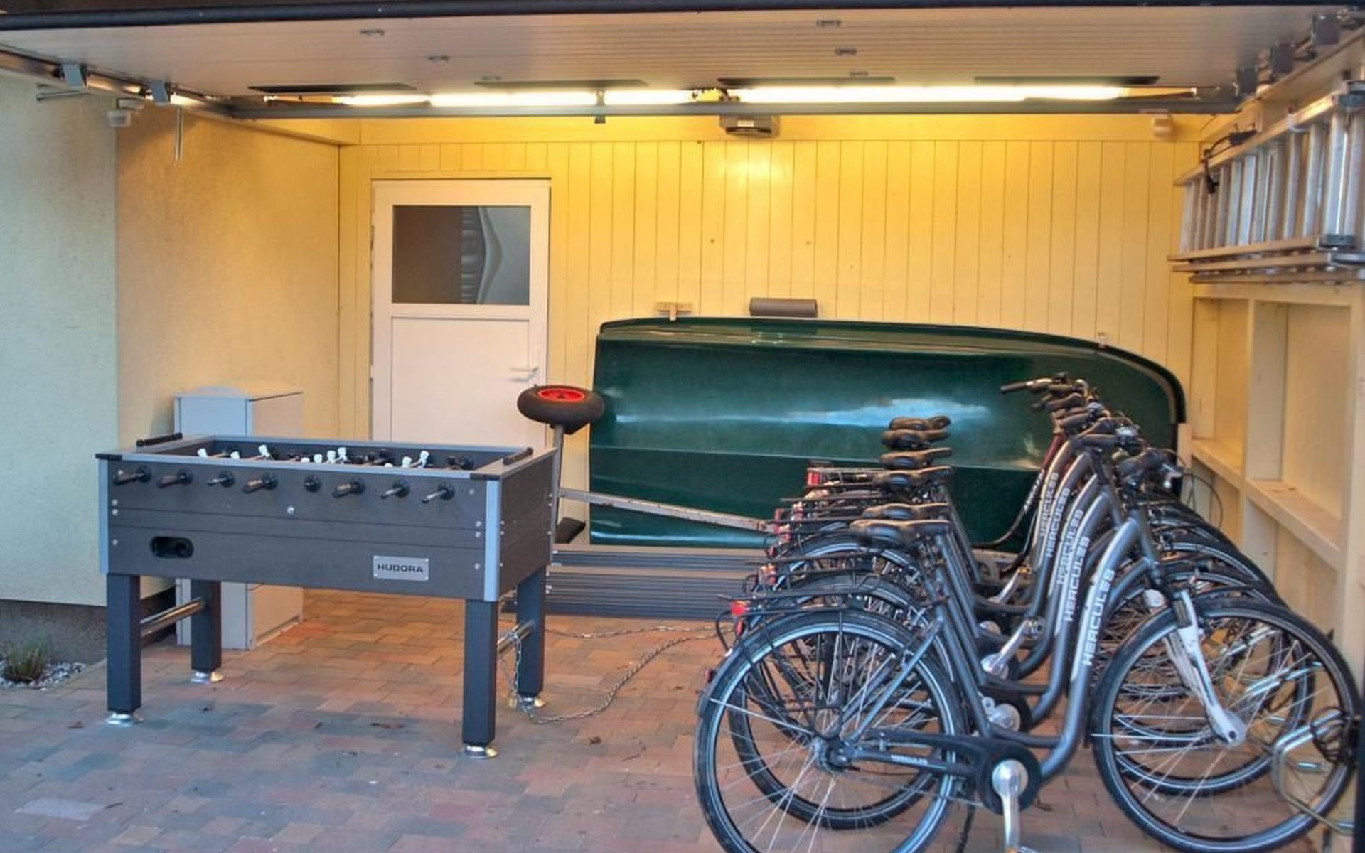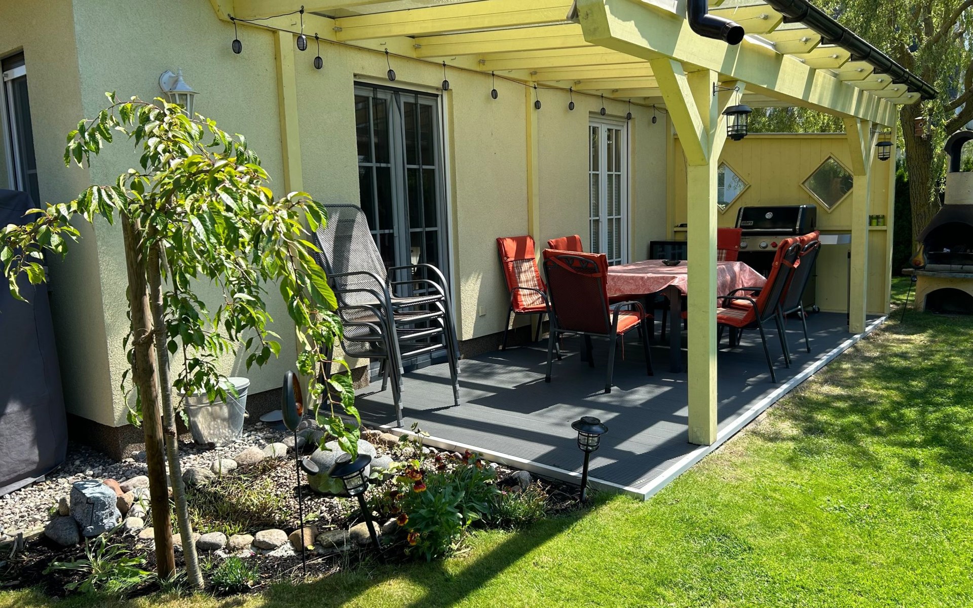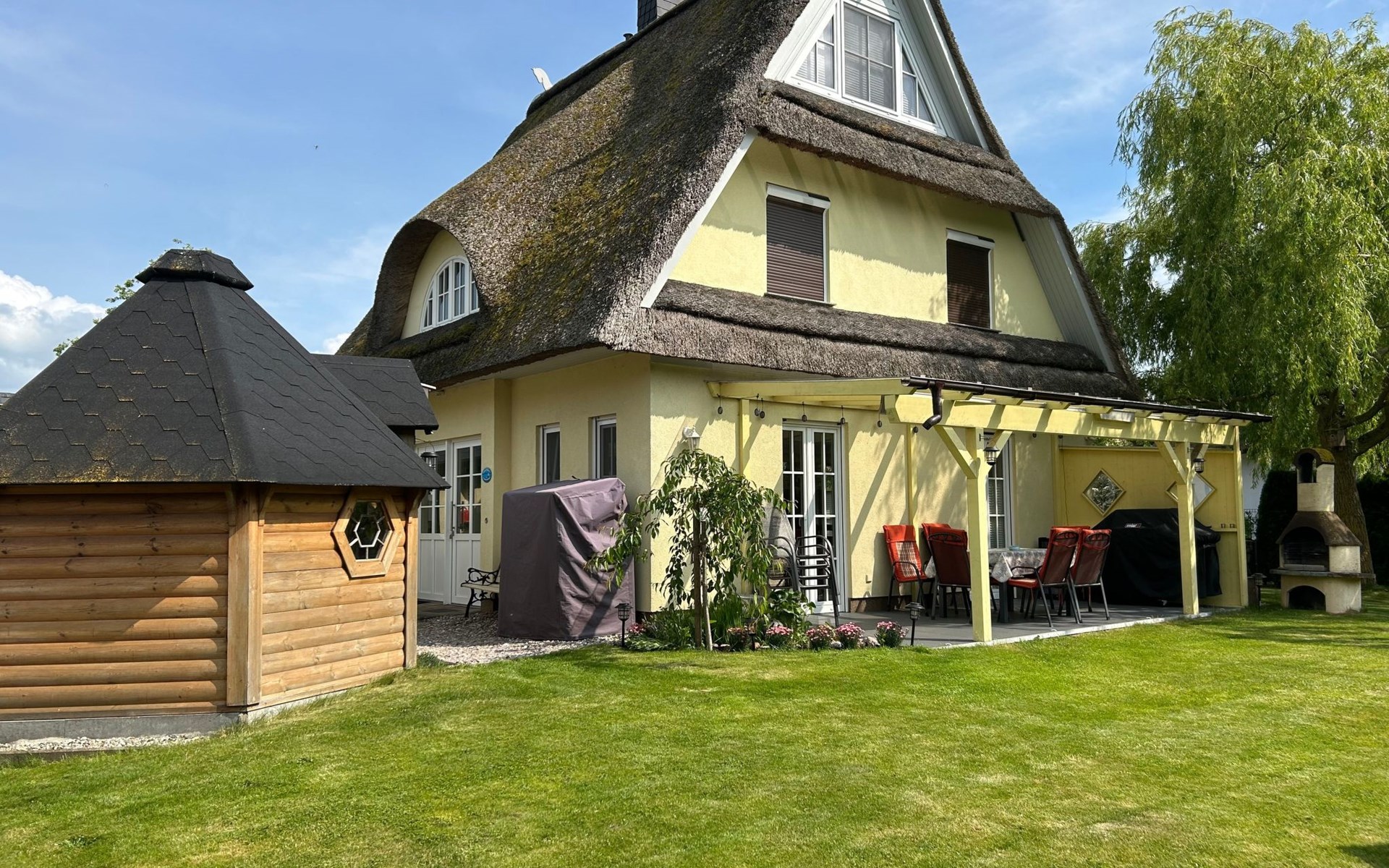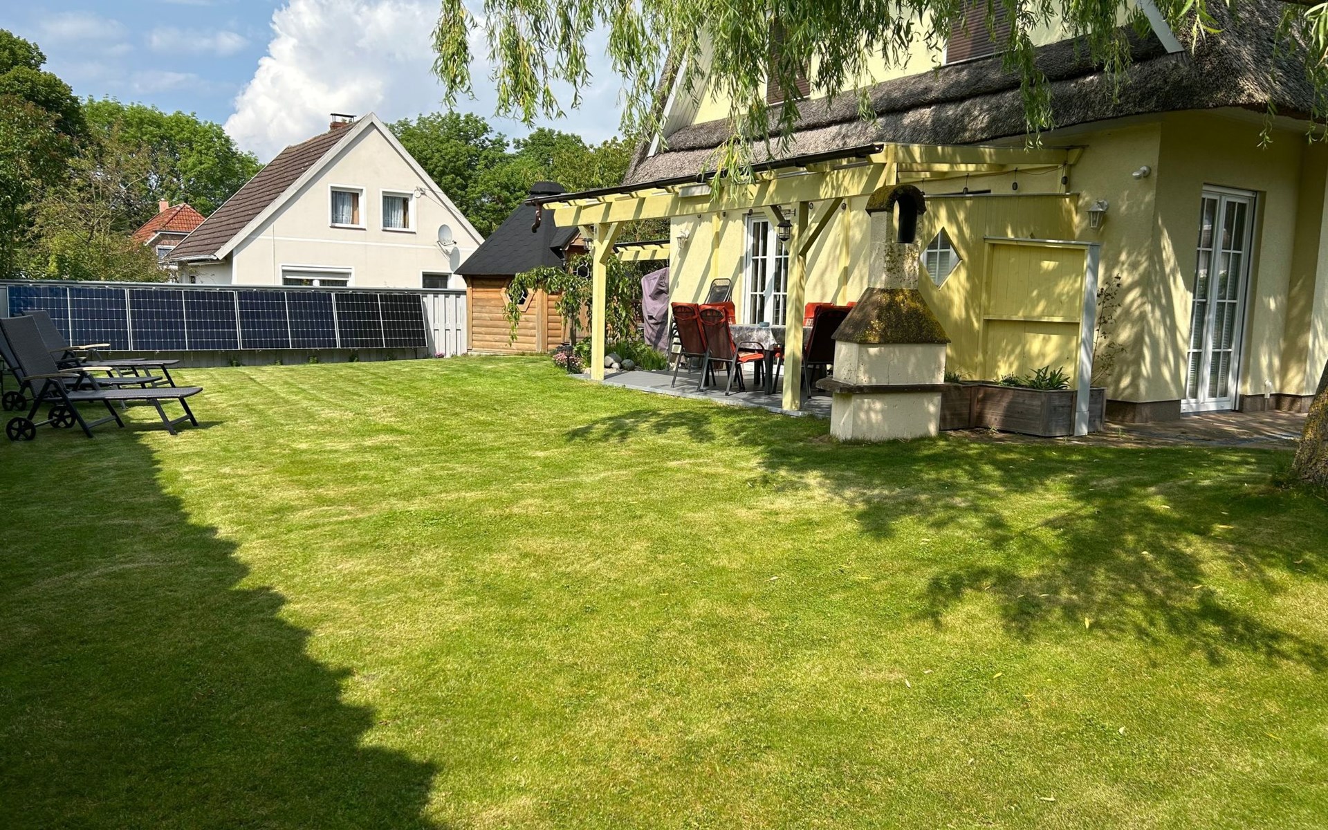 The spacious outdoor area includes a south-west-facing, fenced-in terrace with all-round privacy, where you will find a fireplace barbecue, a Weber gas barbecue and an outdoor fridge. Relaxation is provided by a Finnish sauna Kota and a covered outdoor whirlpool as well as an outdoor shower. The terrace and garden, romantically lit with LED floor spotlights, invite you to enjoy the evenings under the starry sky.