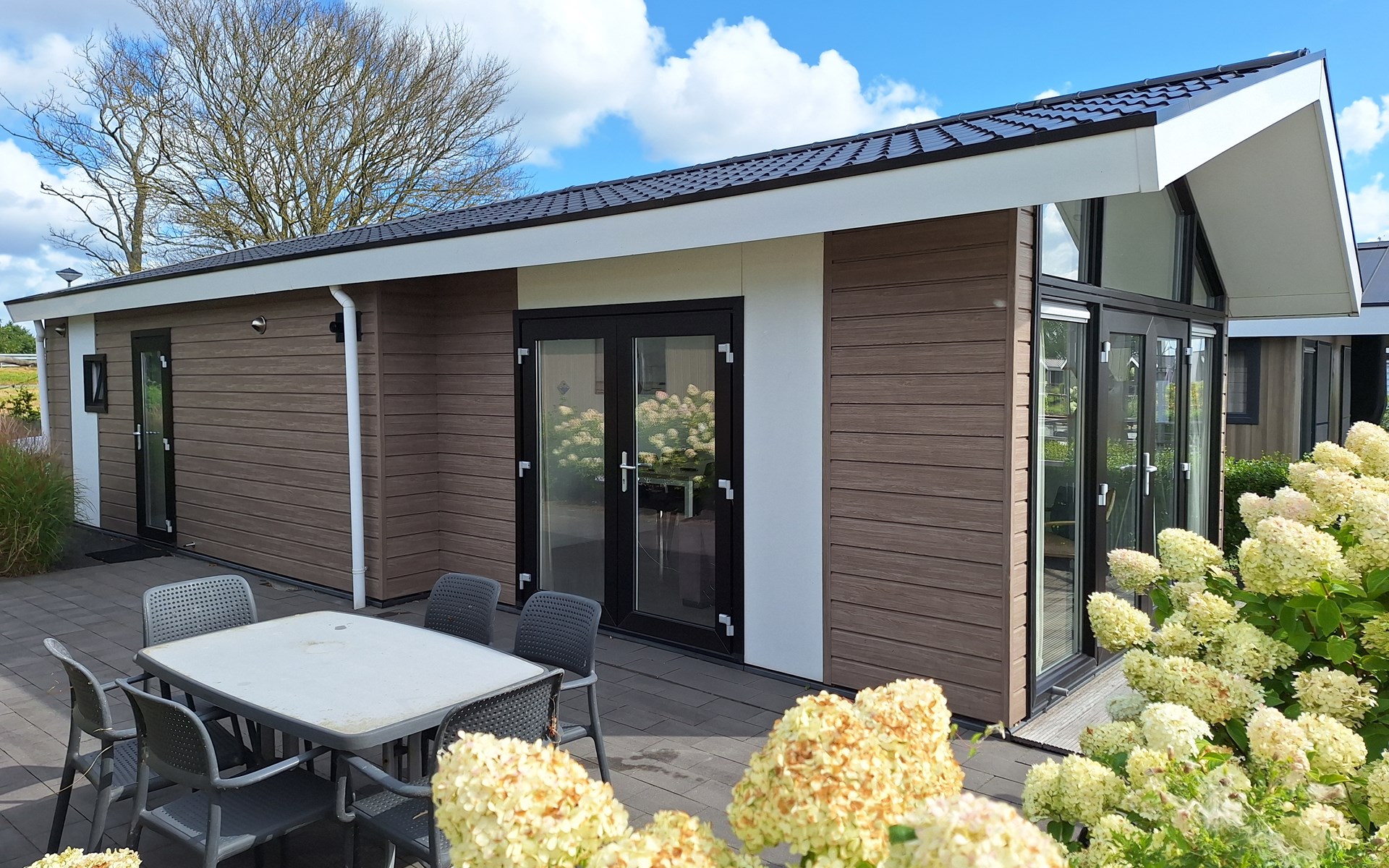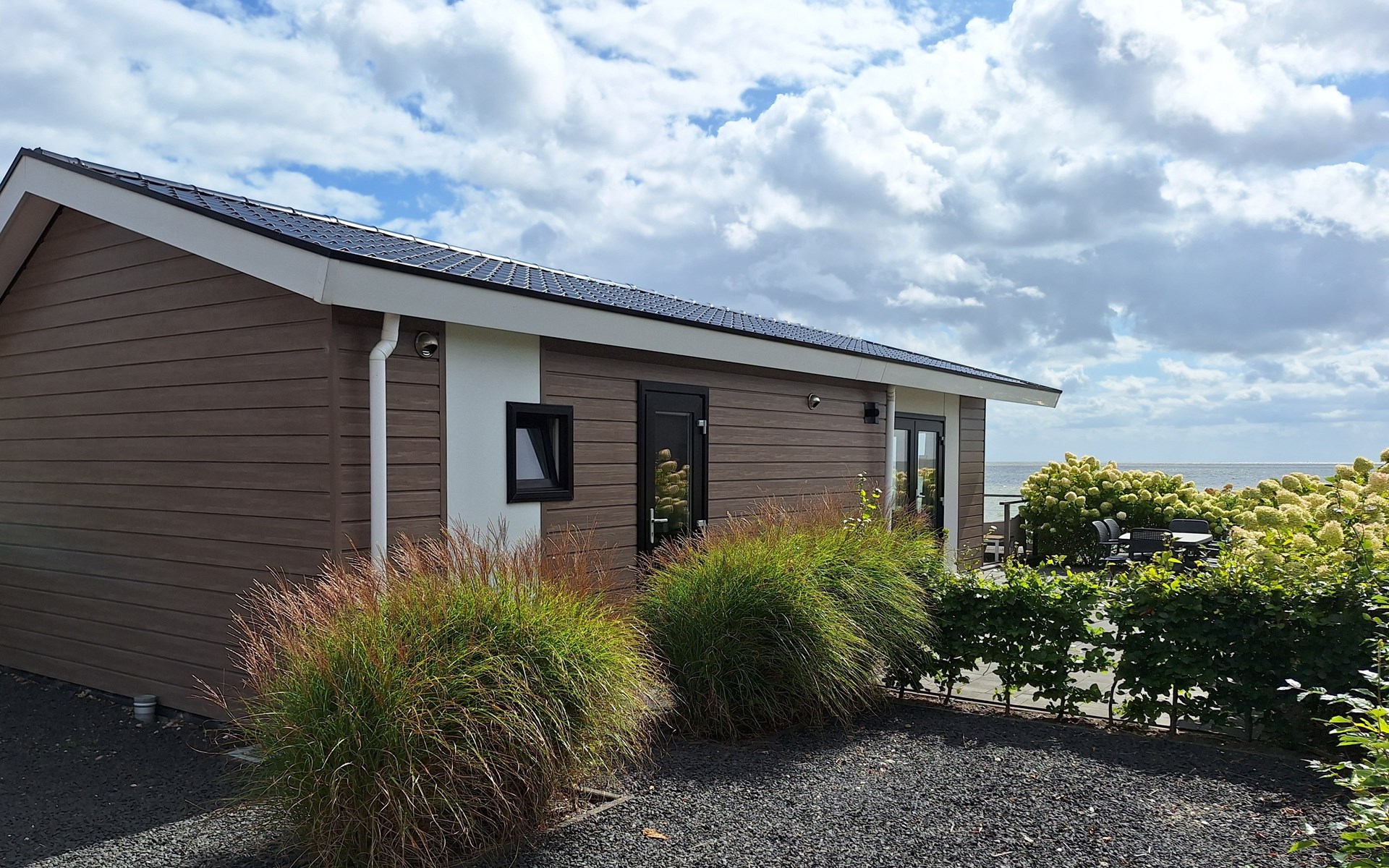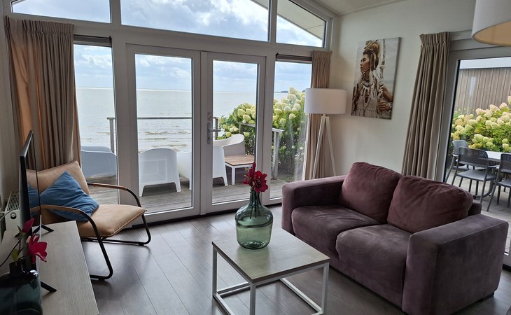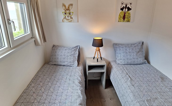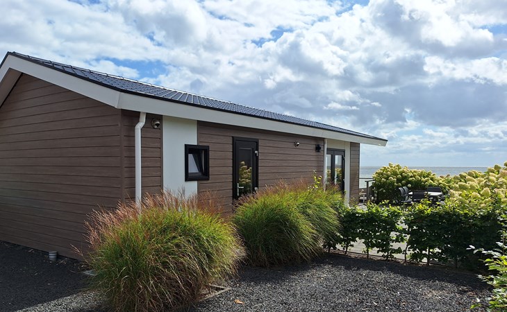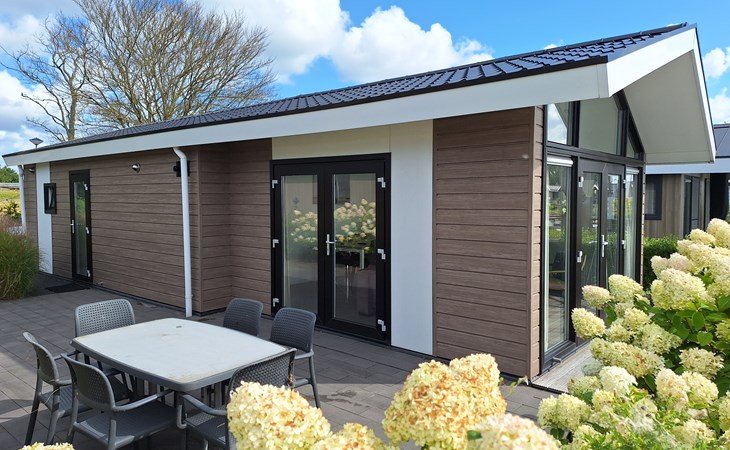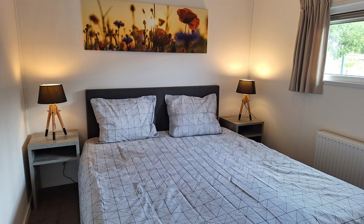 The name says it all: the Pavilion Waterfront 4 is right on the water's edge. This detached, single-storey chalet can accommodate 4 people. In the cosy living room you will find a sitting area with television and a separate dining area. The open kitchen is equipped with a dishwasher, microwave and filter coffee maker. In total there are 2 bedrooms: 1 bedroom with a double bed and 1 bedroom with 2 single beds. There is also a bathroom with shower and toilet. Through the folding doors you can reach the covered terrace with garden furniture. But the highlight of the Pavilion Waterfront 4 is the decking on the waterfront! (please note, accommodation number 42 is located at the water but does not have a waterside decking). At this house you can park 1 car and there is free Wi-Fi available.
