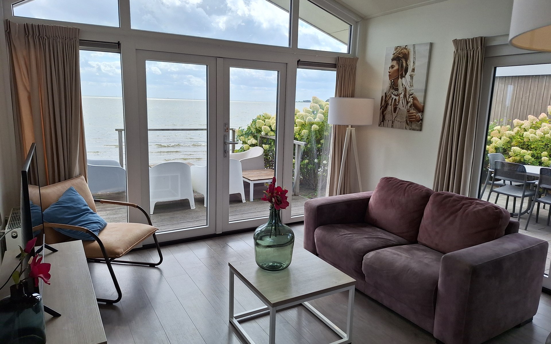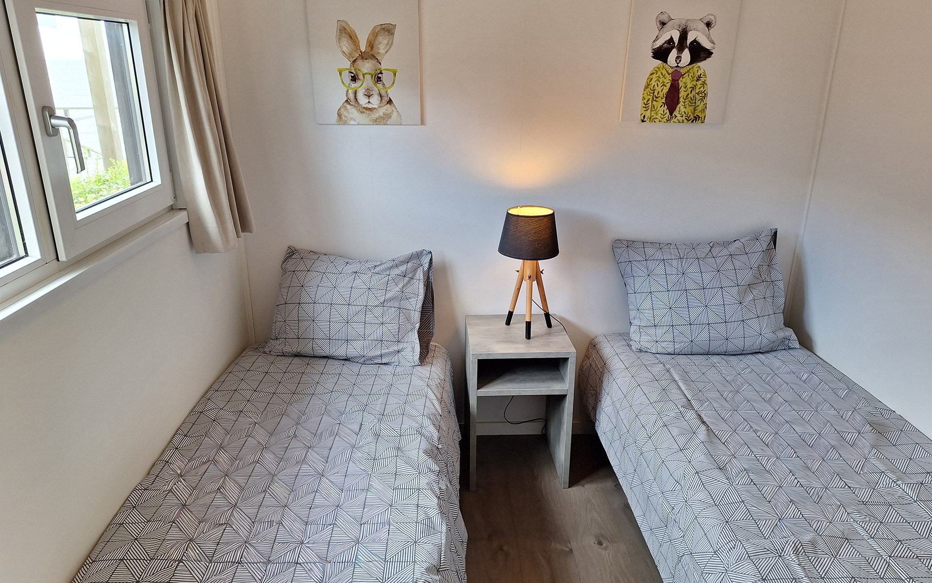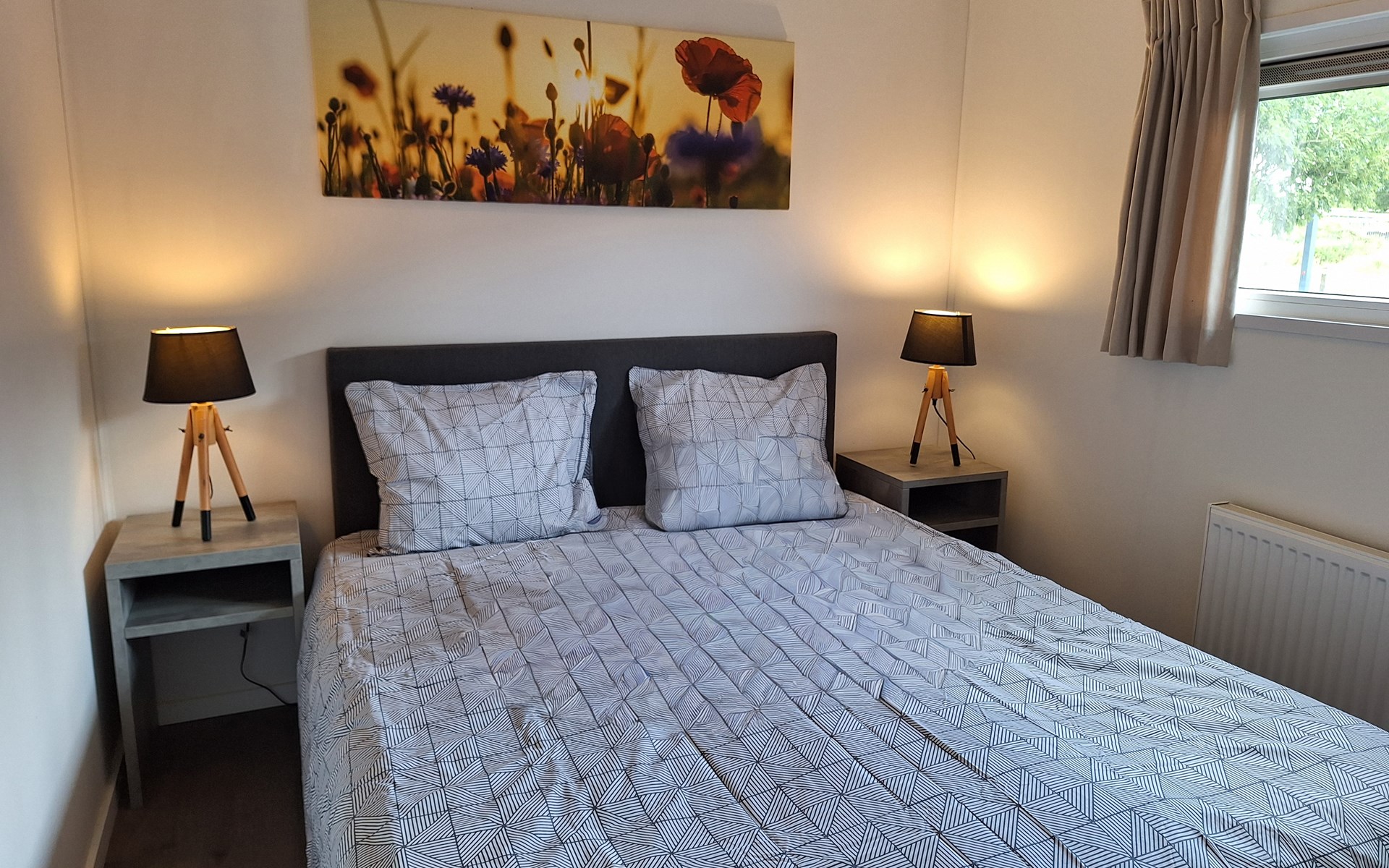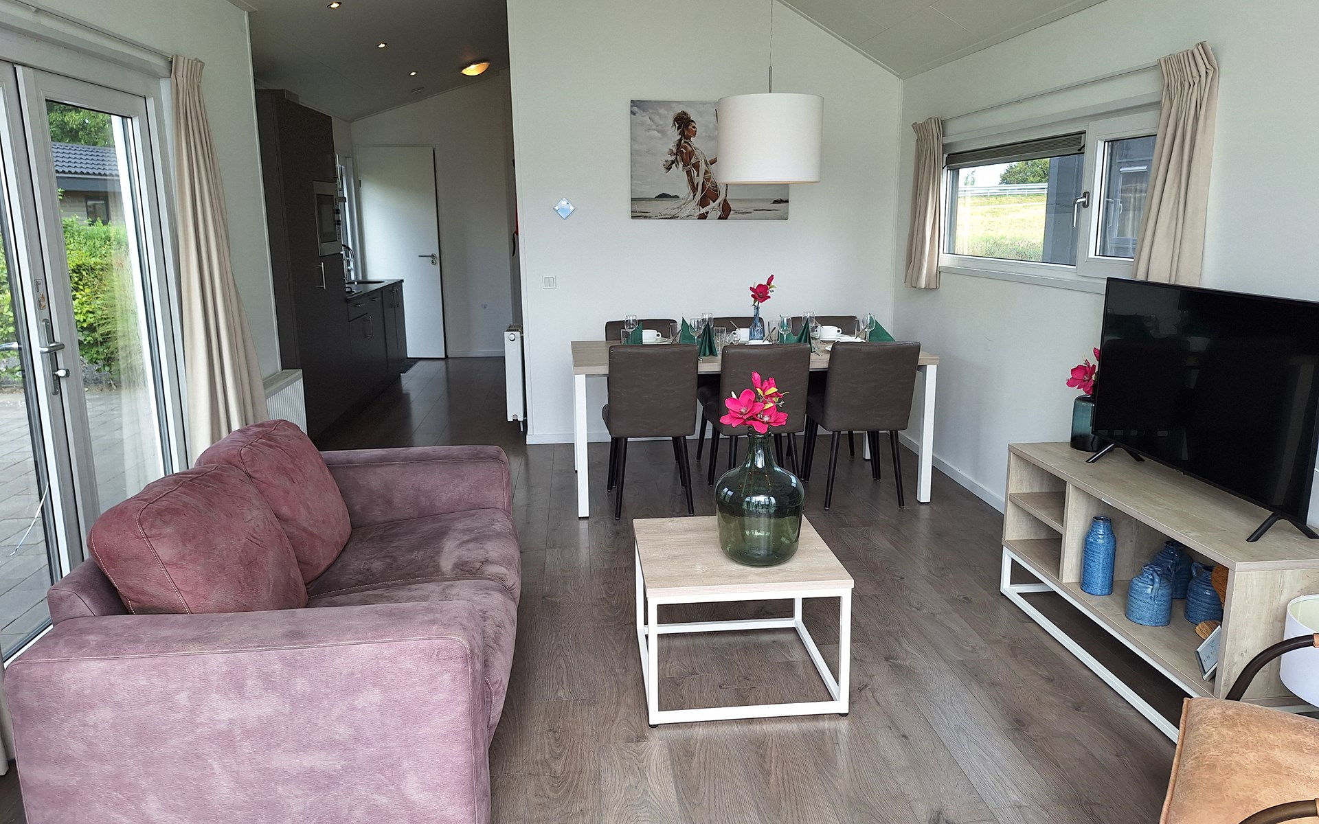 The name says it all: the Pavilion Waterfront 4 is right on the water's edge. This detached, single-storey chalet can accommodate 4 people. In the cosy living room you will find a sitting area with television and a separate dining area. The open kitchen is equipped with a dishwasher, microwave and filter coffee maker. In total there are 2 bedrooms: 1 bedroom with a double bed and 1 bedroom with 2 single beds. There is also a bathroom with shower and toilet. Through the folding doors you can reach the covered terrace with garden furniture. But the highlight of the Pavilion Waterfront 4 is the decking on the waterfront! (please note, accommodation number 42 is located at the water but does not have a waterside decking). At this house you can park 1 car and there is free Wi-Fi available.