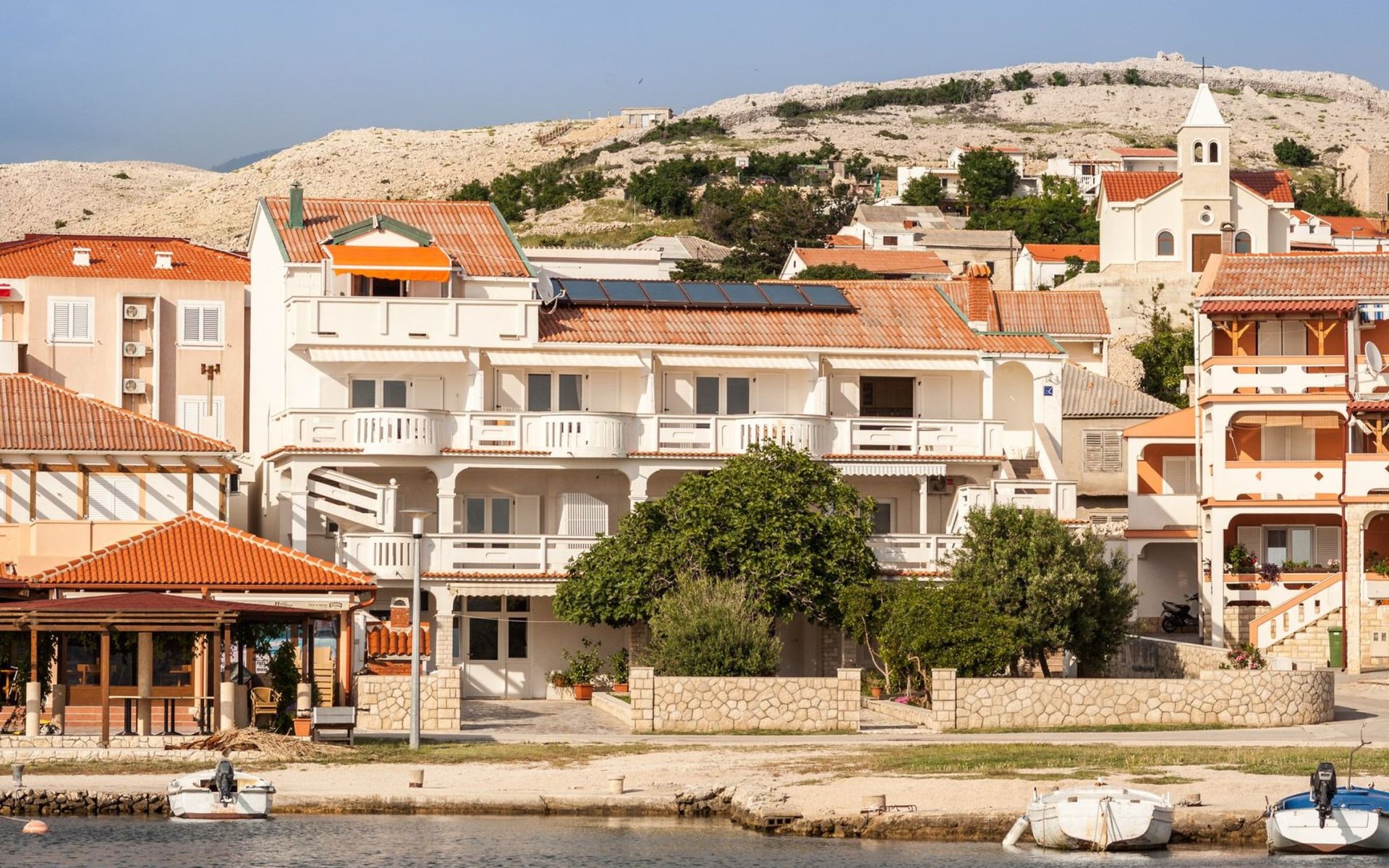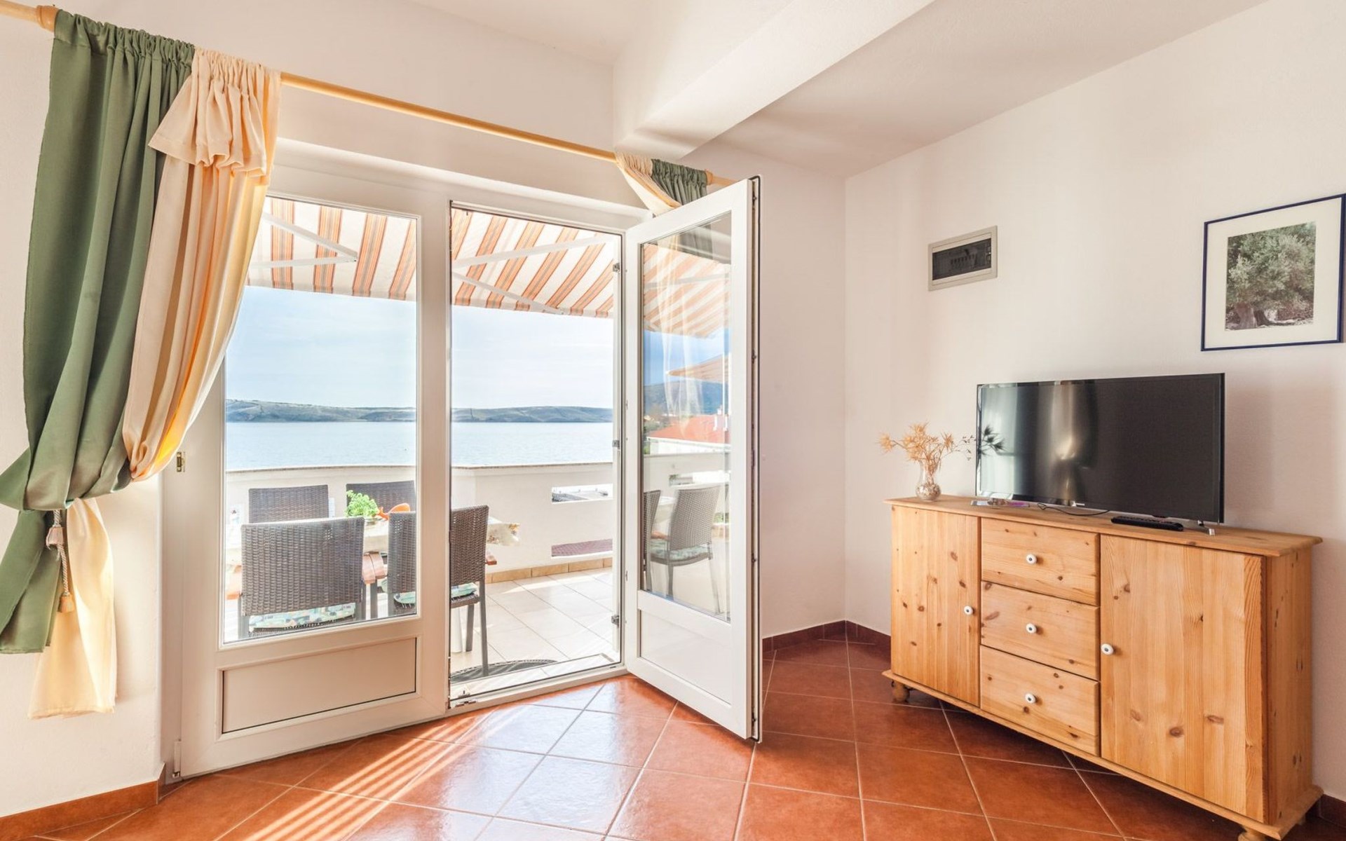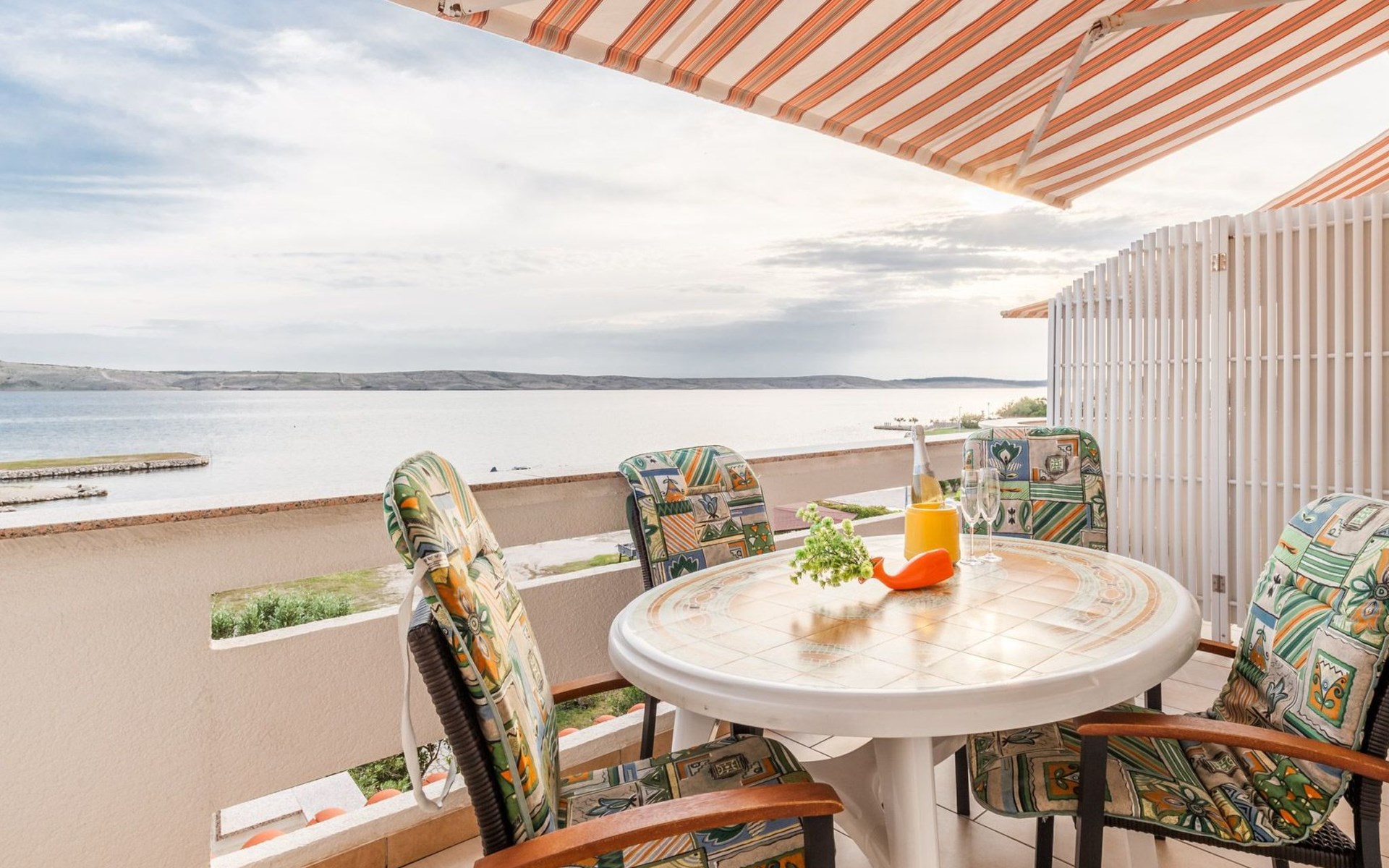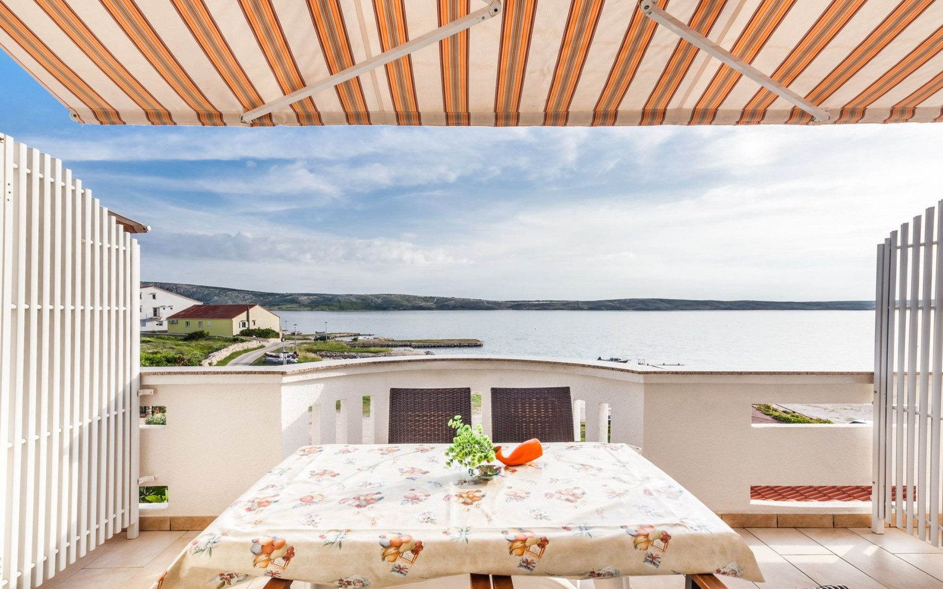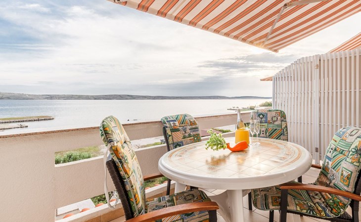Cosy furnishings await you inside. Our 5 flats, each approx. 45 m² in size, are lovingly furnished and offer you a separate bedroom, a bathroom with shower/WC and a living room with kitchen. The highlight of each flat is the sunny balcony with a direct sea view - the ideal place to unwind and enjoy the breathtaking view of Pag Bay.