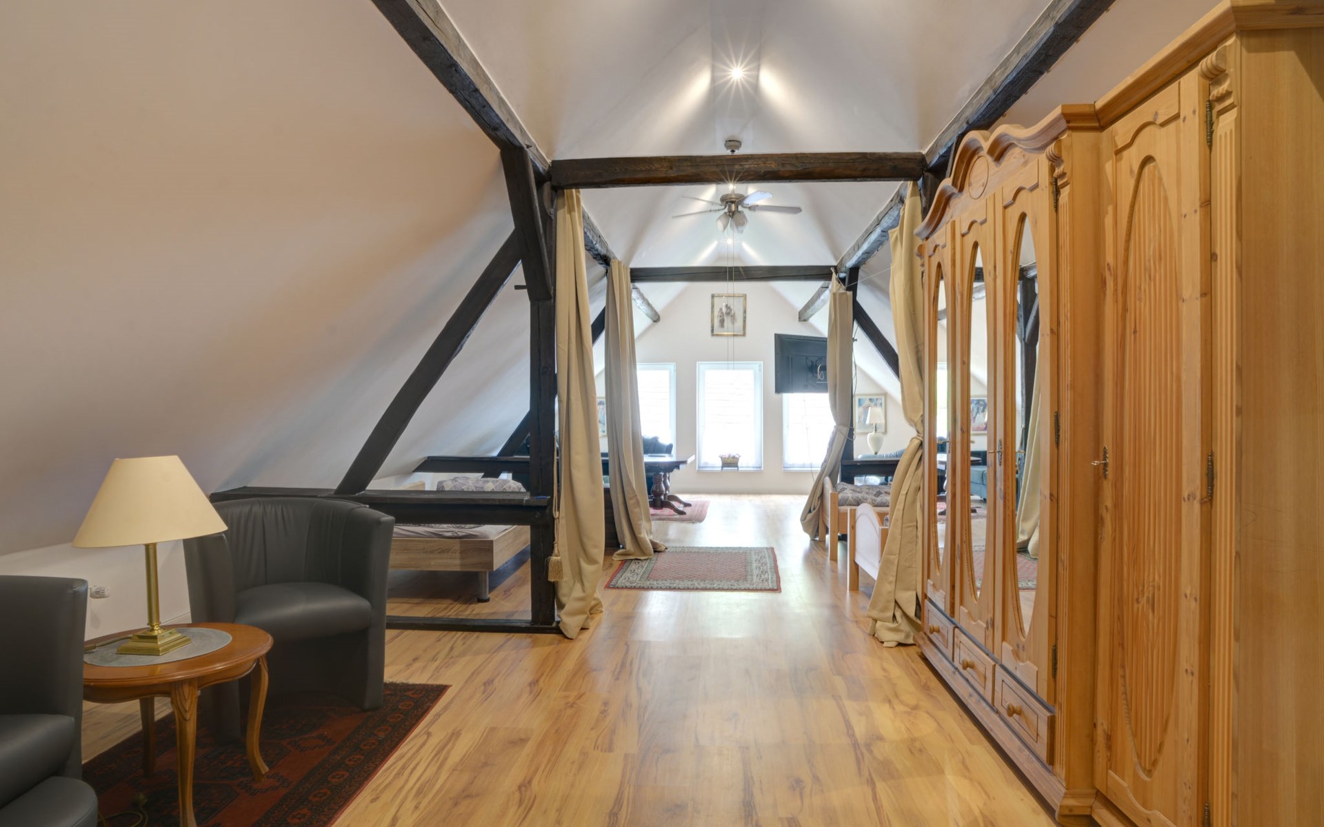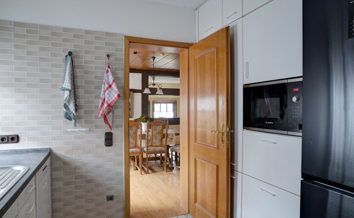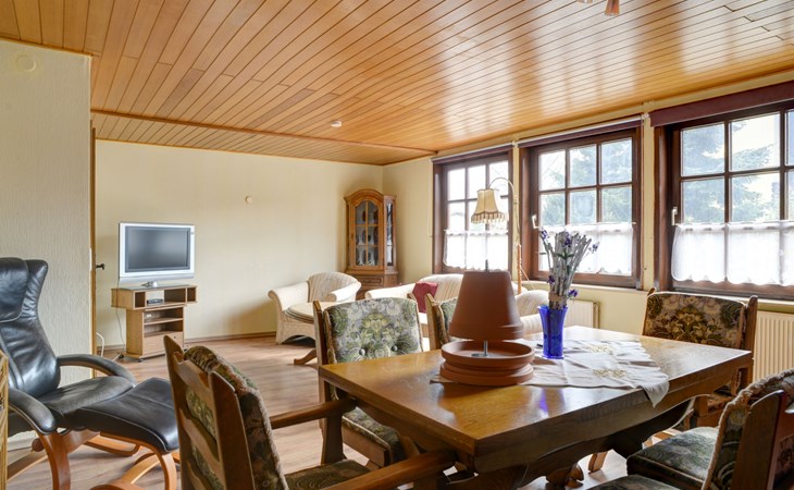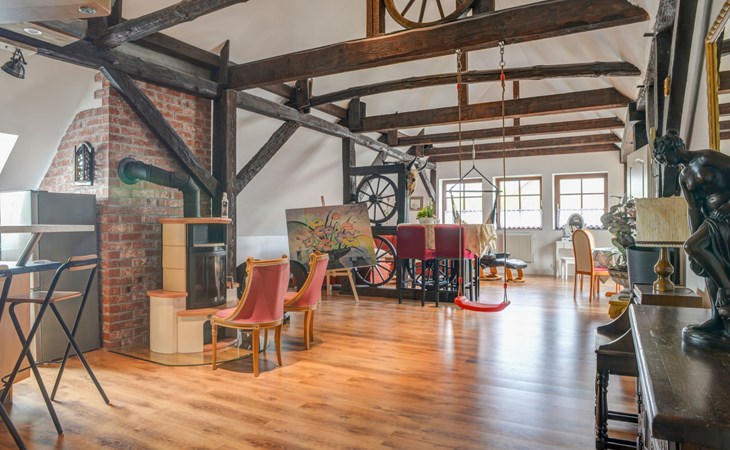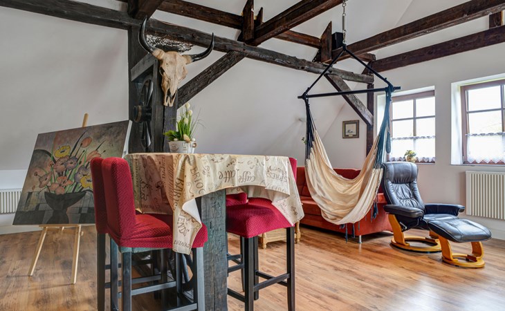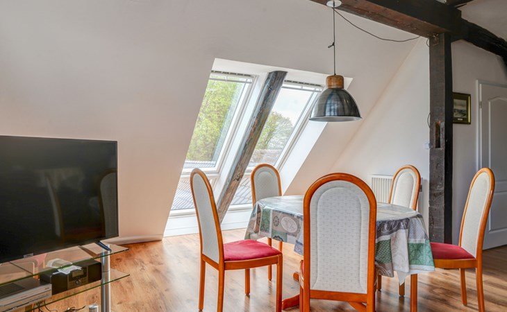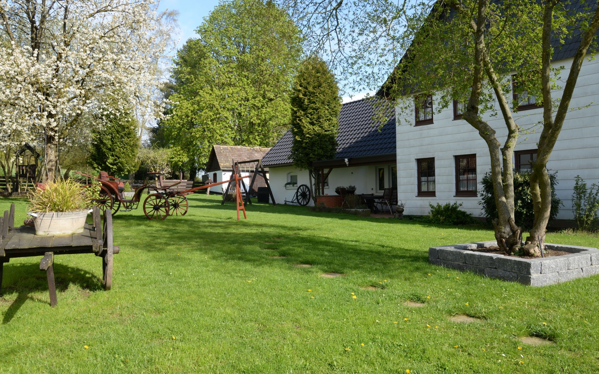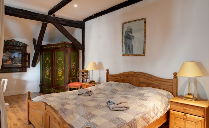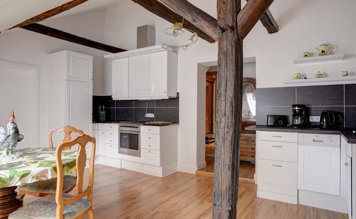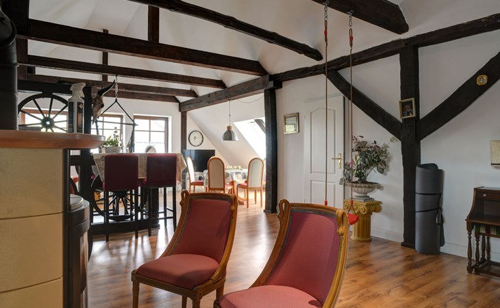 Beautiful, historical working farm, 3 storeys, from the 19th century, renovated in 2019, surrounded by trees and meadows. In the district of Hohe 5.3 km from the centre of Hehlen, 5 km from the centre of Bodenwerder, in a quiet position, 400 m from the edge of the forest. For shared use: large garden 1'500 m2 (fenced) with lawn and trees. Terrace (20 m2), garden furniture, barbecue, children's playground (slide, swing). In the complex: fitness room (extra). Storage room for bicycles, central heating system, washing machine (for shared use, extra), drying room. Parking (for 10 cars) on the premises, single garage (extra) at the house. Shop 7 km, grocery 5 km, supermarket 7 km, restaurant 5 km, bakery 5 km, bus stop "Hohe" 20 m, ferry "Hehlen" 8 km, outdoor swimming pool 8 km, indoor swimming pool 9 km. Walking paths from the house 200 m. Nearby attractions: Welterbe Corvey 33 km, Porzellanmanufaktur Fürstenberg 40 km. Well-known lakes can easily be reached: Humboldtsee 28 km. Please note: car recommended. The owner does not accept any youth groups. Garden seating area (200 m2) and the second terrace (9 m2) are available for shared use (both terraces are not visible to each other). Finnish steam tub (available 01.04.-30.11.) for shared use.