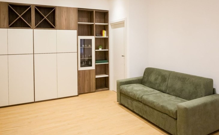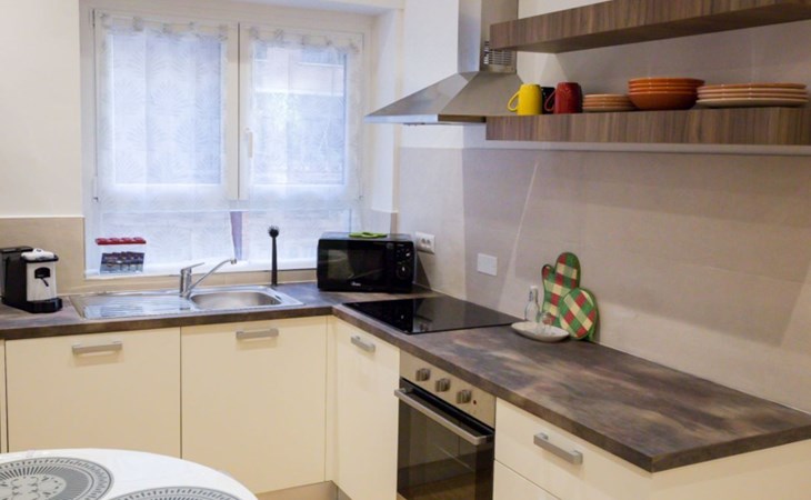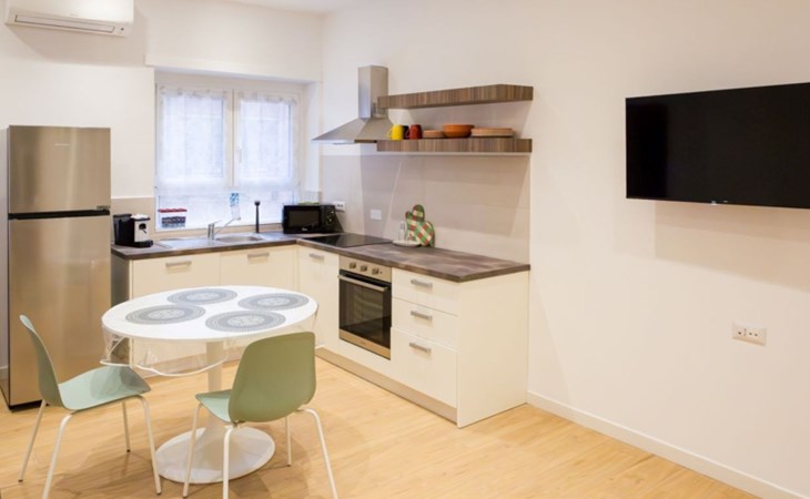 The interior is equipped with every comfort to ensure you have a pleasant and relaxing stay. The flat features a fluid layout of spaces, with air conditioning available in every room to ensure maximum comfort during the hottest or coldest months. The living area includes a well-equipped kitchen with induction cooker, coffee machine with pods, dishwasher and electric kettle, perfect for preparing meals as if you were at home. In addition, a washing machine and tumble dryer are available for your exclusive use, ideal for long stays.