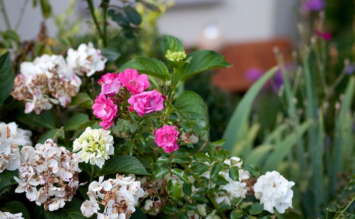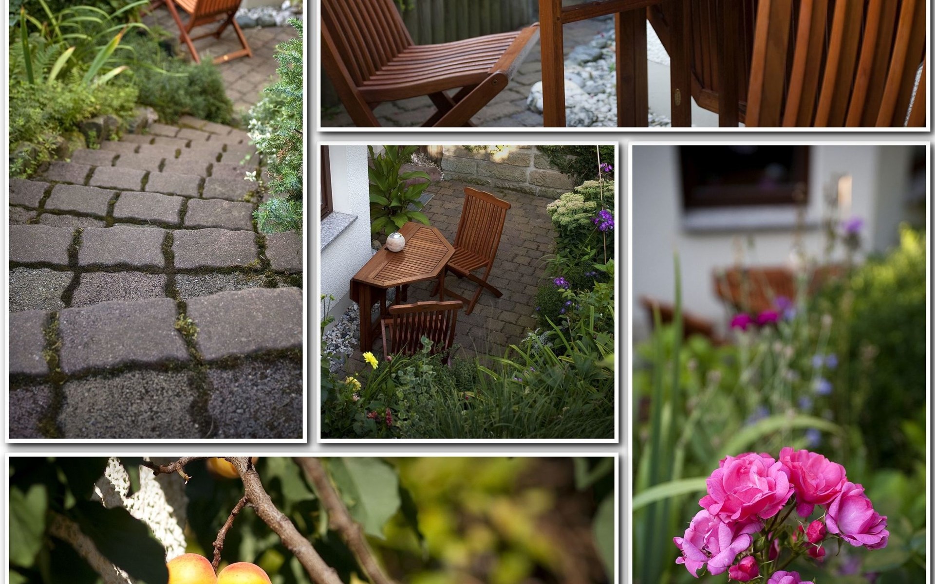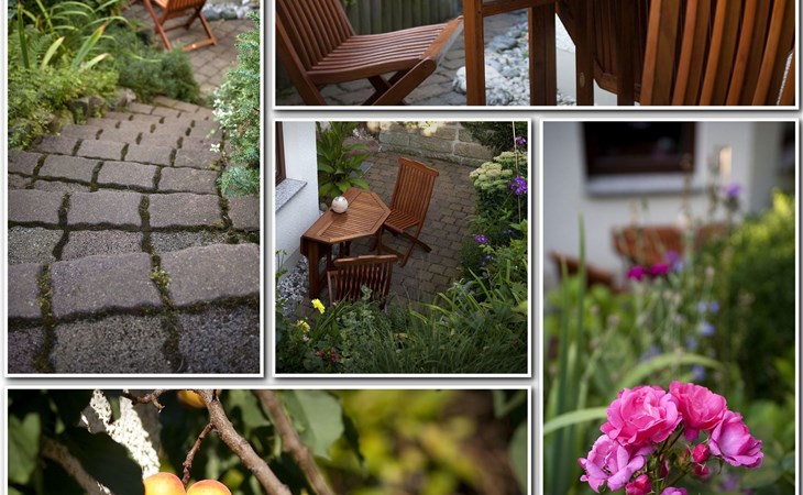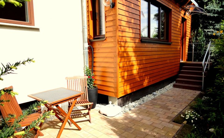 The outdoor area awaits you with its idyllic terrace right next to a decorative ginkgo tree and invites you to relax in the open air, whether for breakfast in the morning sun or for relaxing evenings. The high-quality wooden garden furniture promises comfort and style in a green setting.