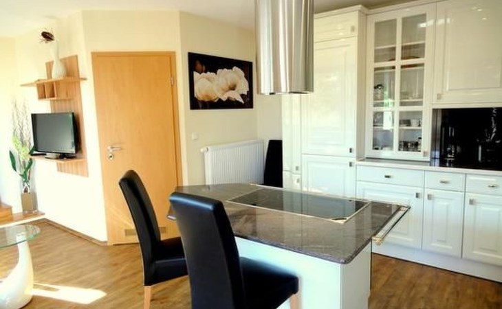 Inside, the approx. 50 m² non-smoking holiday flat offers a peaceful and sun-drenched atmosphere thanks to its separate entrance and south-east-facing windows that catch the morning light. Our guests enjoy the luxury of a generously furnished flat. It comprises a living room with open-plan kitchen, a cosy bedroom and a bathroom with shower, complemented by modern amenities such as underfloor heating, a particularly quiet Daikin air conditioning system, Wi-Fi, flat-screen TV, stereo system and a fully equipped kitchen for your home-cooked culinary experience.