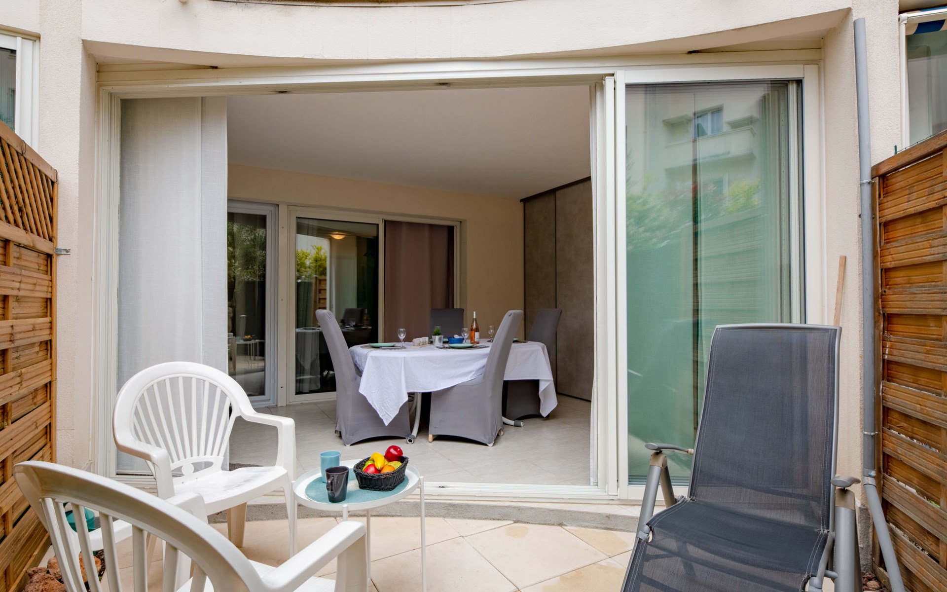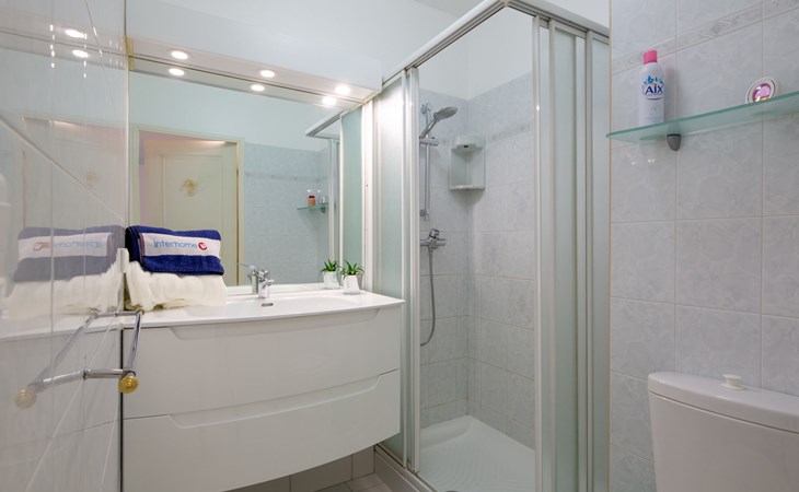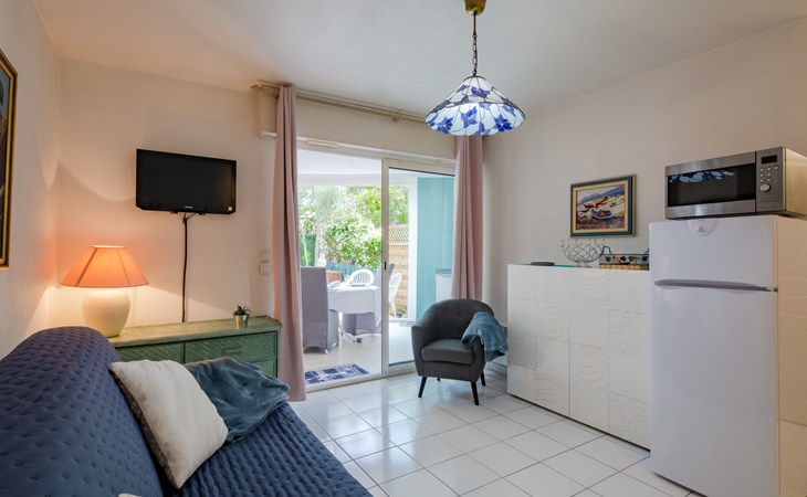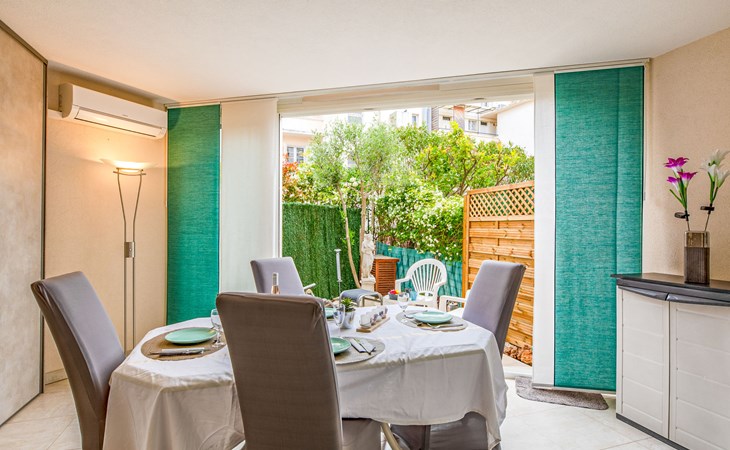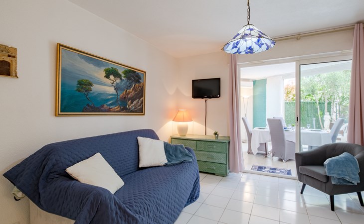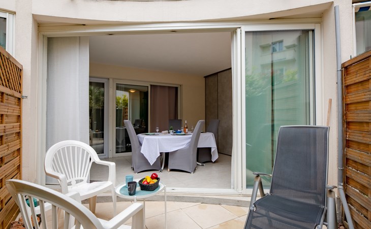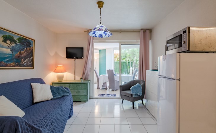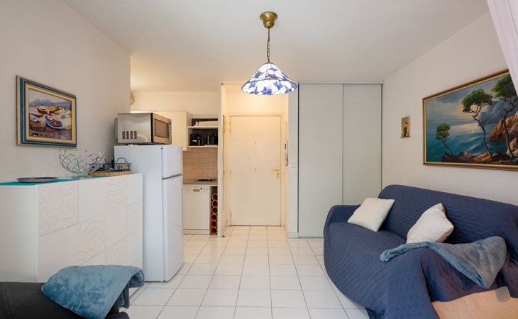 Fréjus Plage: Apartment house "Le chant de la mer", 4 storeys. 50 m from the sea, 50 m from the beach. Supermarket, restaurant, bakery 50 m, sandy beach "Plages de Fréjus" 50 m, diving center 800 m. Sports harbour 800 m, golf course (18 hole) 6 km. Nearby attractions: Cannes 40 km, Saint-Tropez 40 km, Nice 70 km, Gorges du Verdon 90 km. Well-known lakes can easily be reached: Sainte-Croix 90 km. Hiking paths: Estérel 8 km.