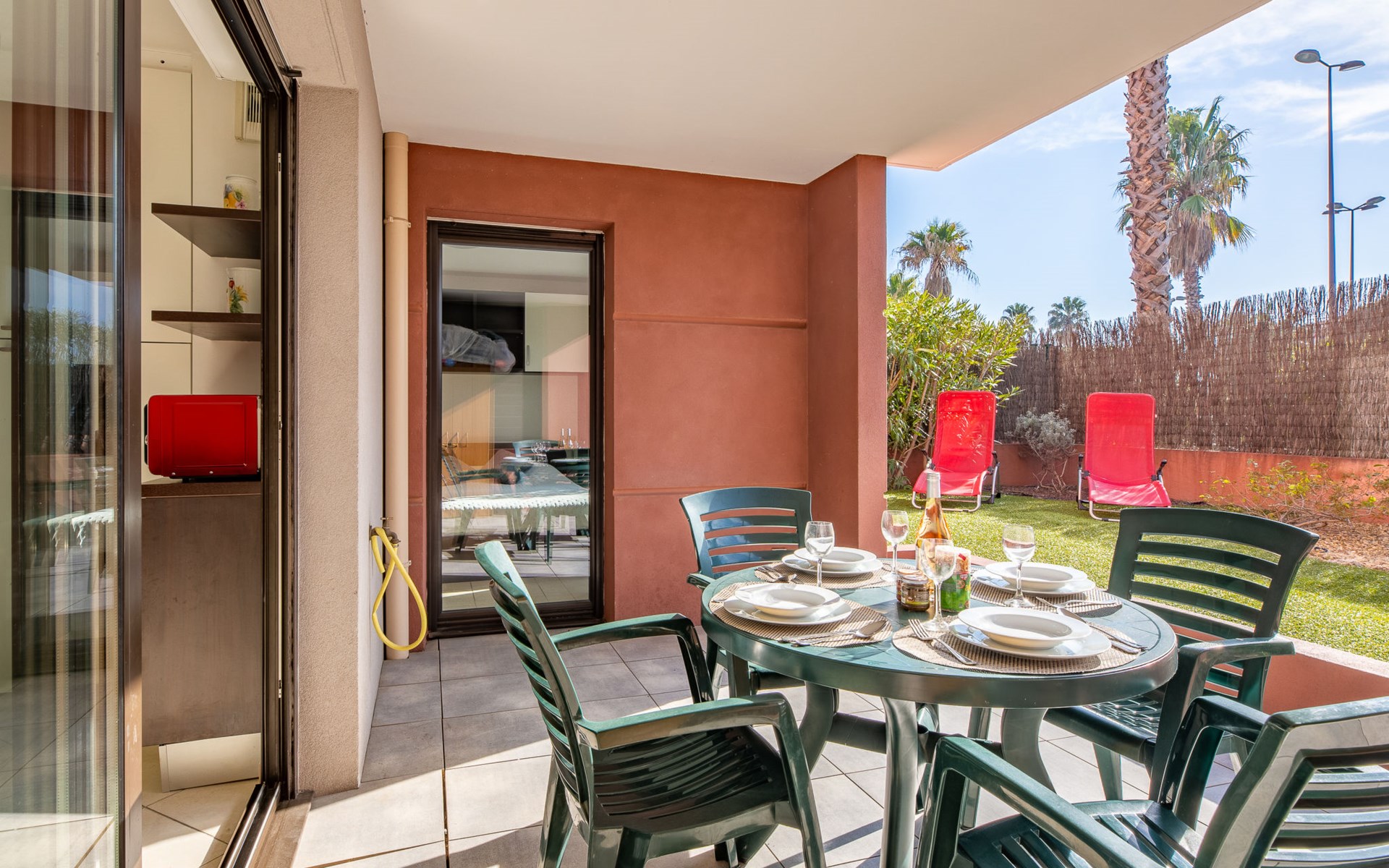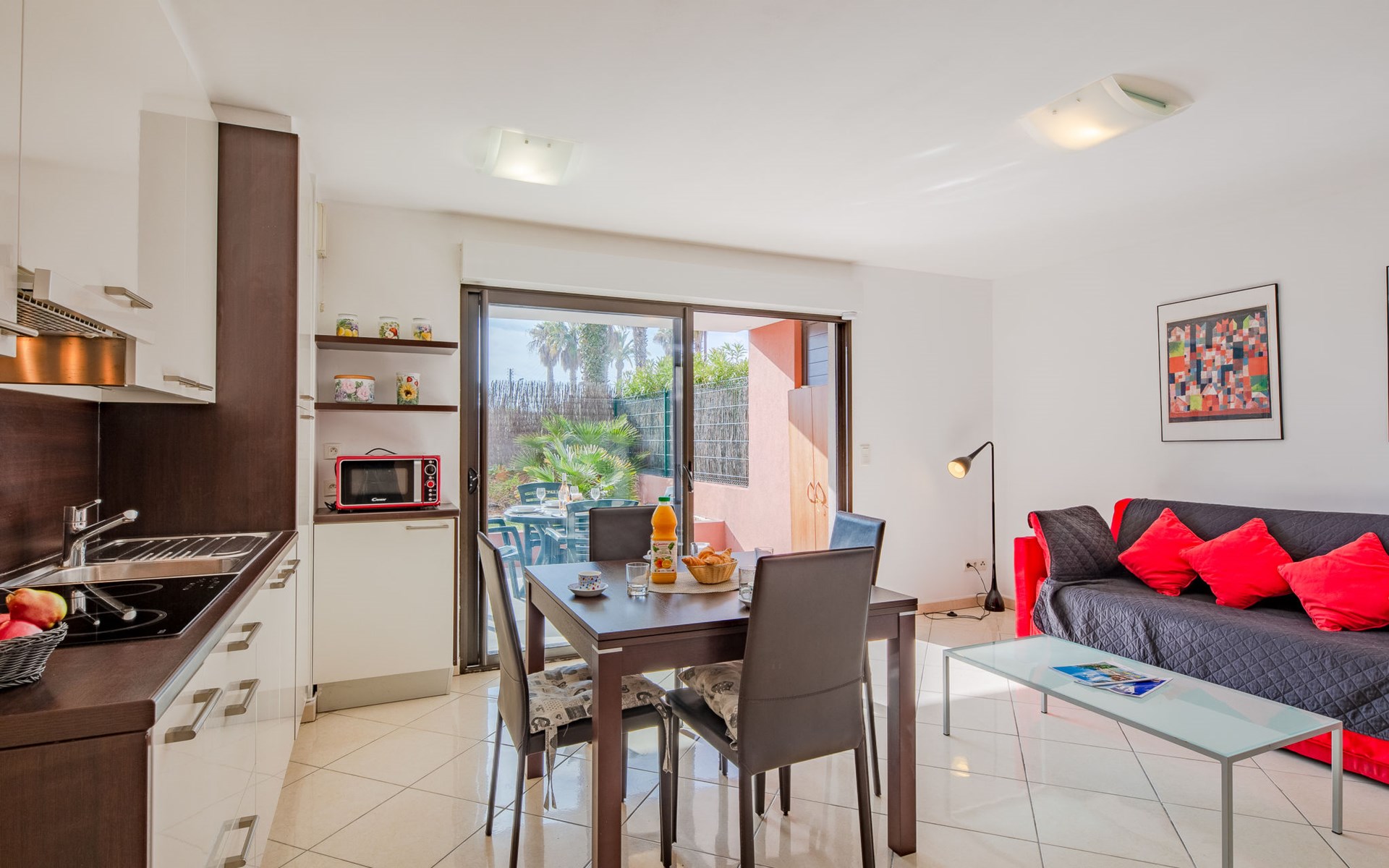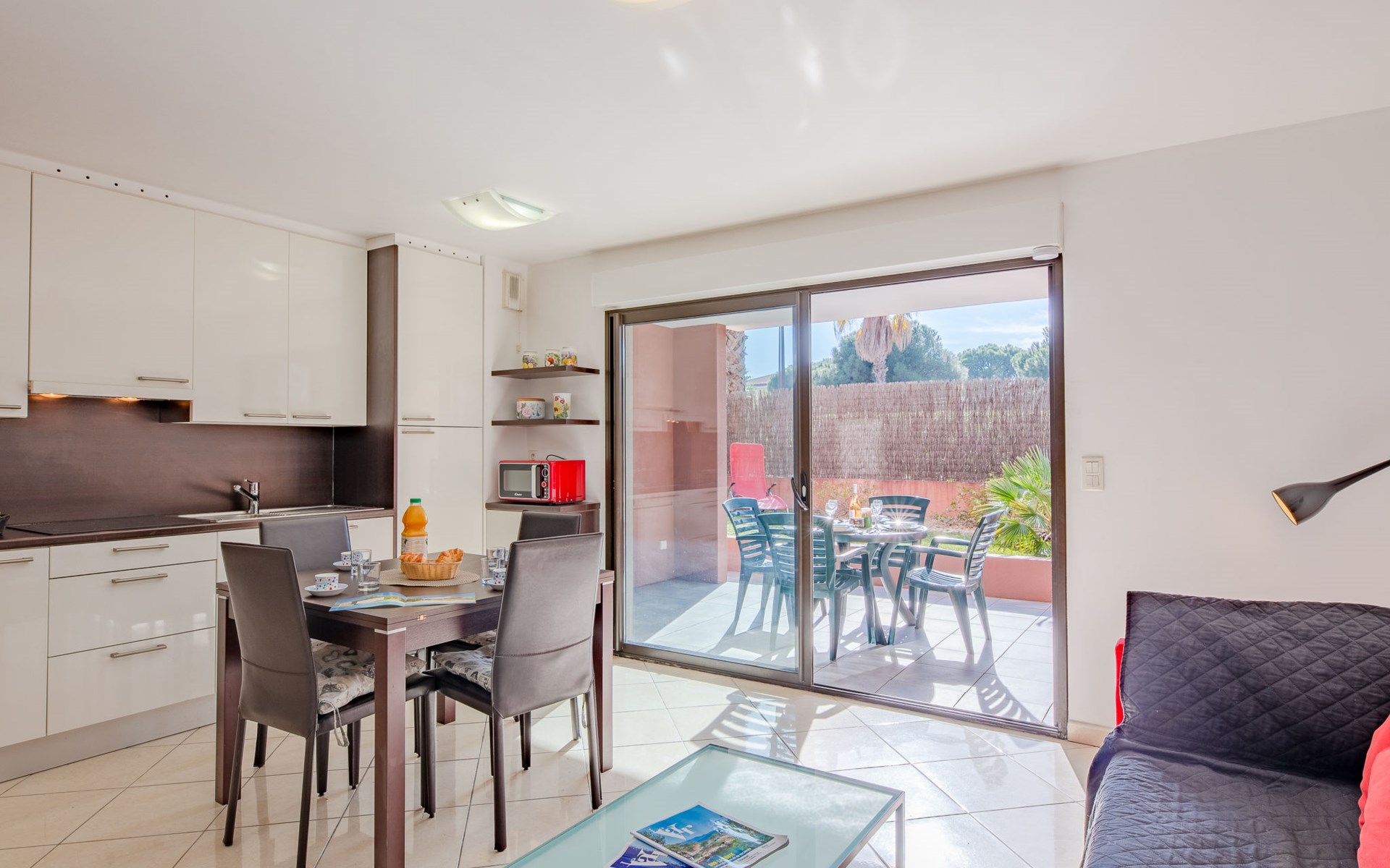 Port Fréjus: Modern apartment block "Santa Monica", 2 storeys, built in 2010. 500 m from the sea, from the beach. In the complex: lift, storage room for bicycles. Supermarket 1 km, shopping centre 1 km, restaurant 500 m, bus stop 200 m, railway station "Saint-Raphaël Valescure" 2 km, park "Base nature" 200 m, diving center 500 m, indoor swimming pool 250 m. Sports harbour 100 m, golf course (18 hole) 7 km. Nearby attractions: Cannes 40 km, Saint-Tropez 40 km, Nice 70 km, Gorges du Verdon 90 km. Well-known lakes can easily be reached: Sainte-Croix 90 km. Hiking paths: Estérel 7 km. Groups of teenagers on request only. The keys‘ handover takes place by the agency Interhome in Port Fréjus. Neighbourhood highly sensitive to noise. Quietness and good behaviour expected.
