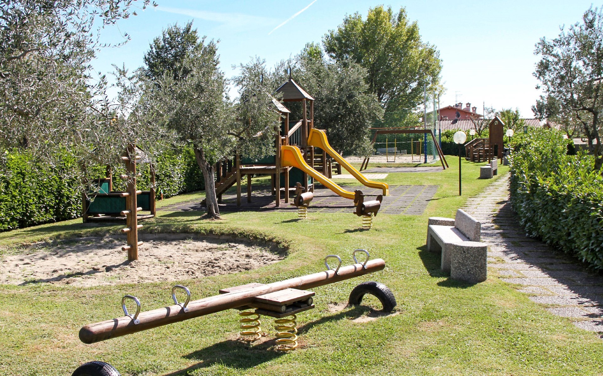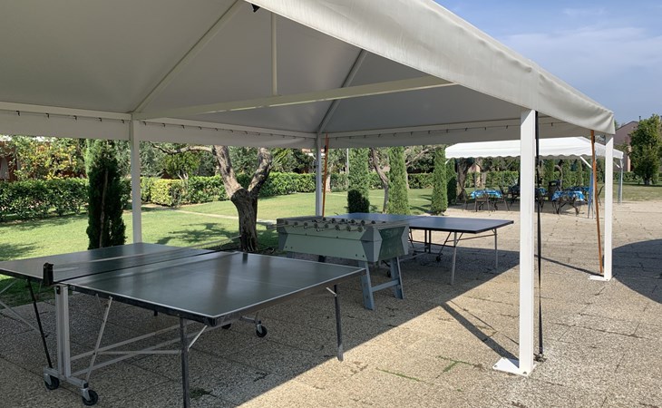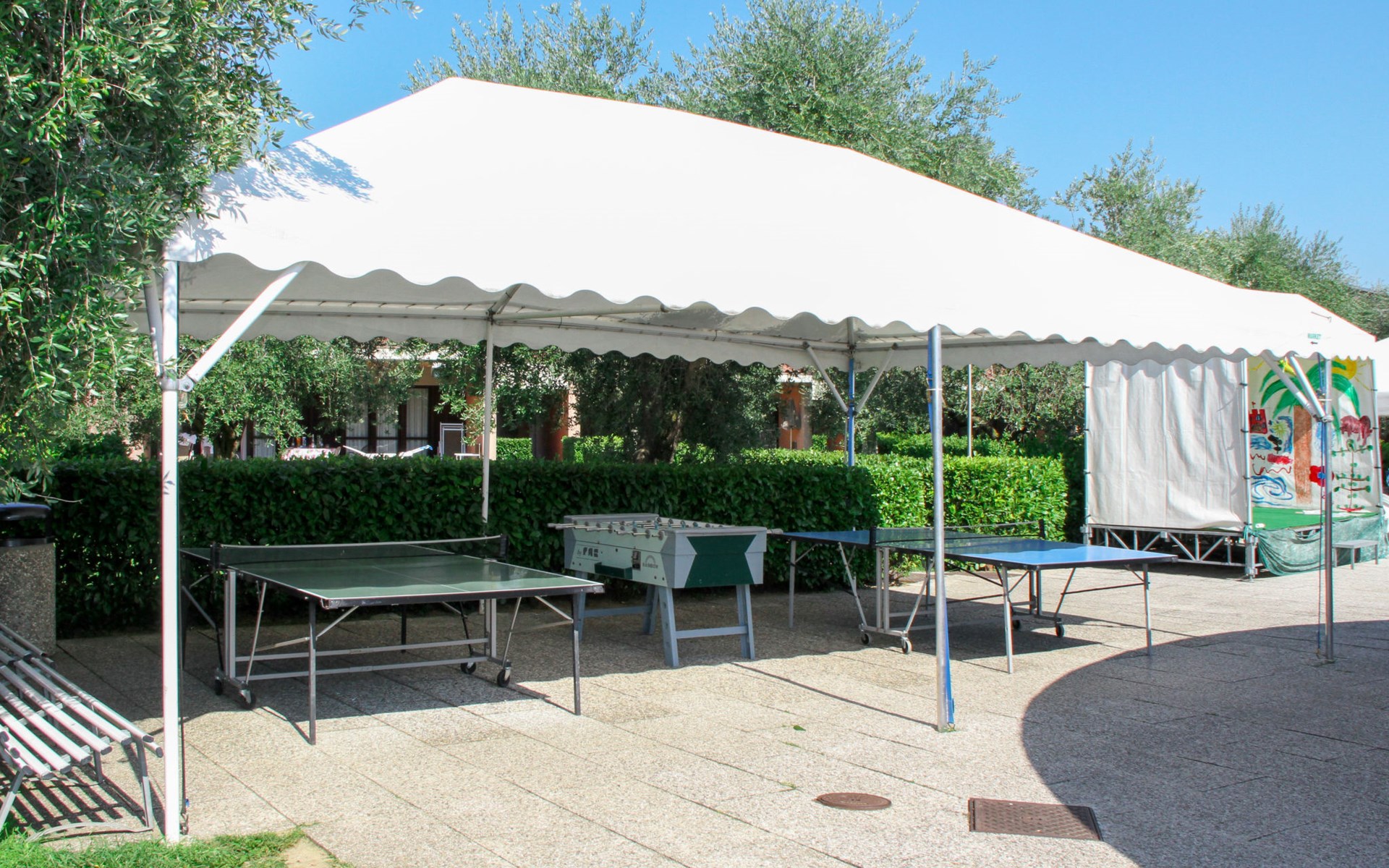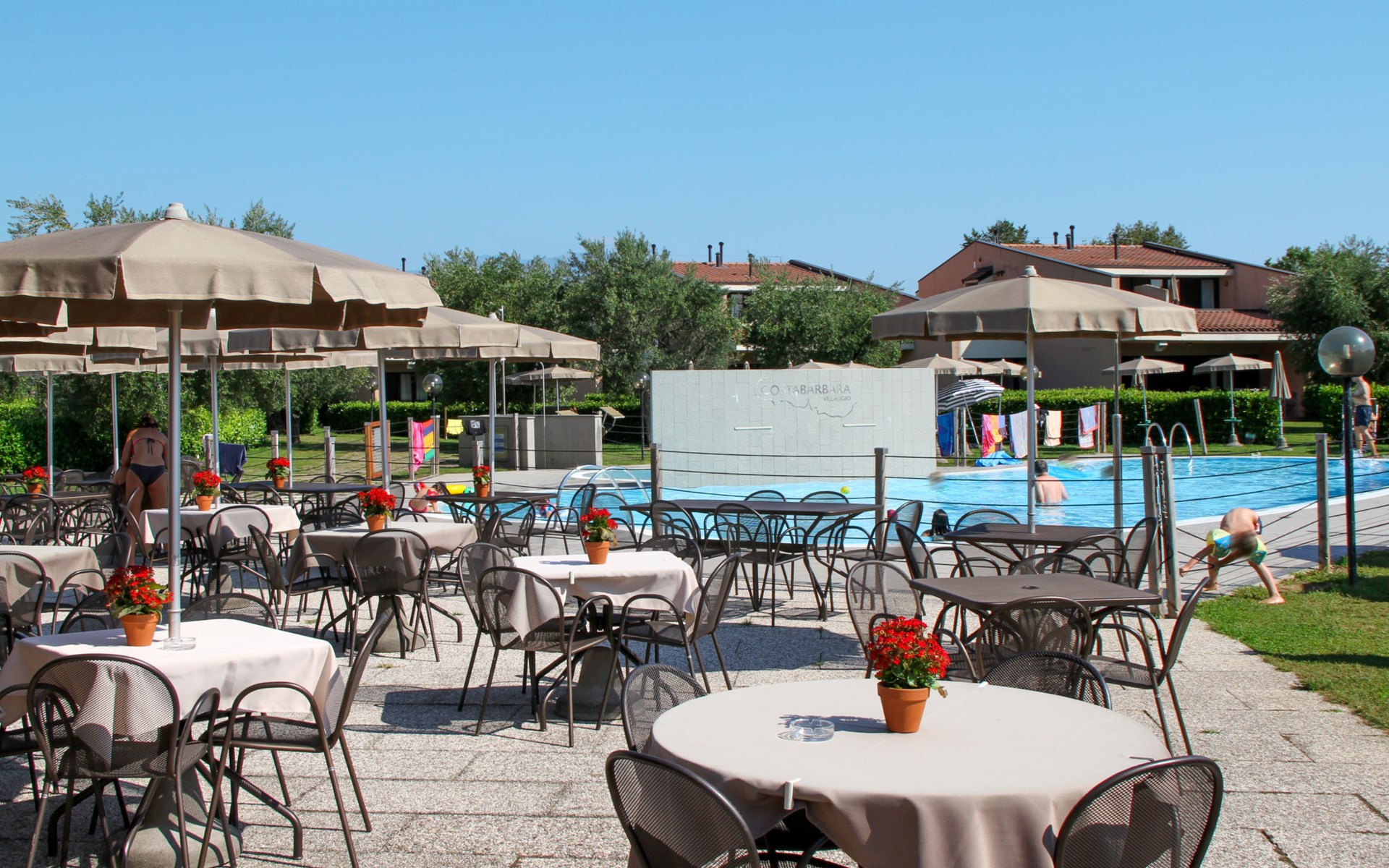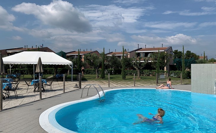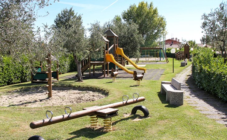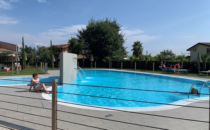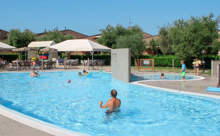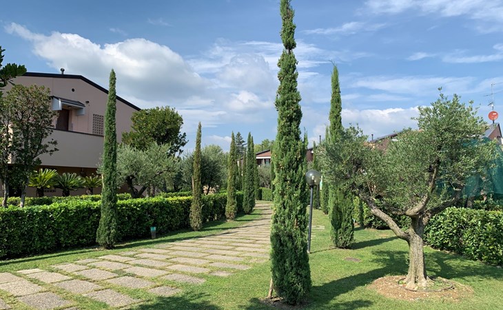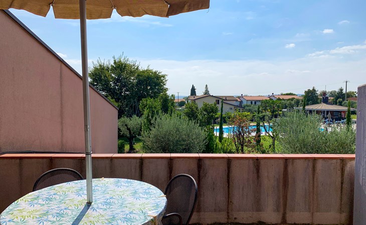 Child friendly resort "Barbara". 43 apartments in the residence. Outside the resort, 2 km from the centre of Moniga del Garda, 1 km from the lake. For shared use: property 10'000 m2 (fenced), lawn and trees, swimming pool kidney-shaped (seasonal availability: 15.Mar. - 15.Nov.). Children's pool, table tennis, beach volleyball, barbecue, children's playground. In the complex: reception, bar, WiFi, washing machine (for shared use, extra). Linen change weekly. Towel change weekly. Bread roll service, breakfast and half board on request (extra). Parking on the premises. Shop 50 m, supermarket 2 km, restaurant 50 m, bus stop 800 m, railway station "Desenzano del Garda" 12 km, pebble beach 1 km. Golf course 5 km. Please note: entertainment in the season. Suitable for families, baby equipment on request (extra). The owner does not accept any groups. Please note: WIFI in object only on balcony / terrasse.