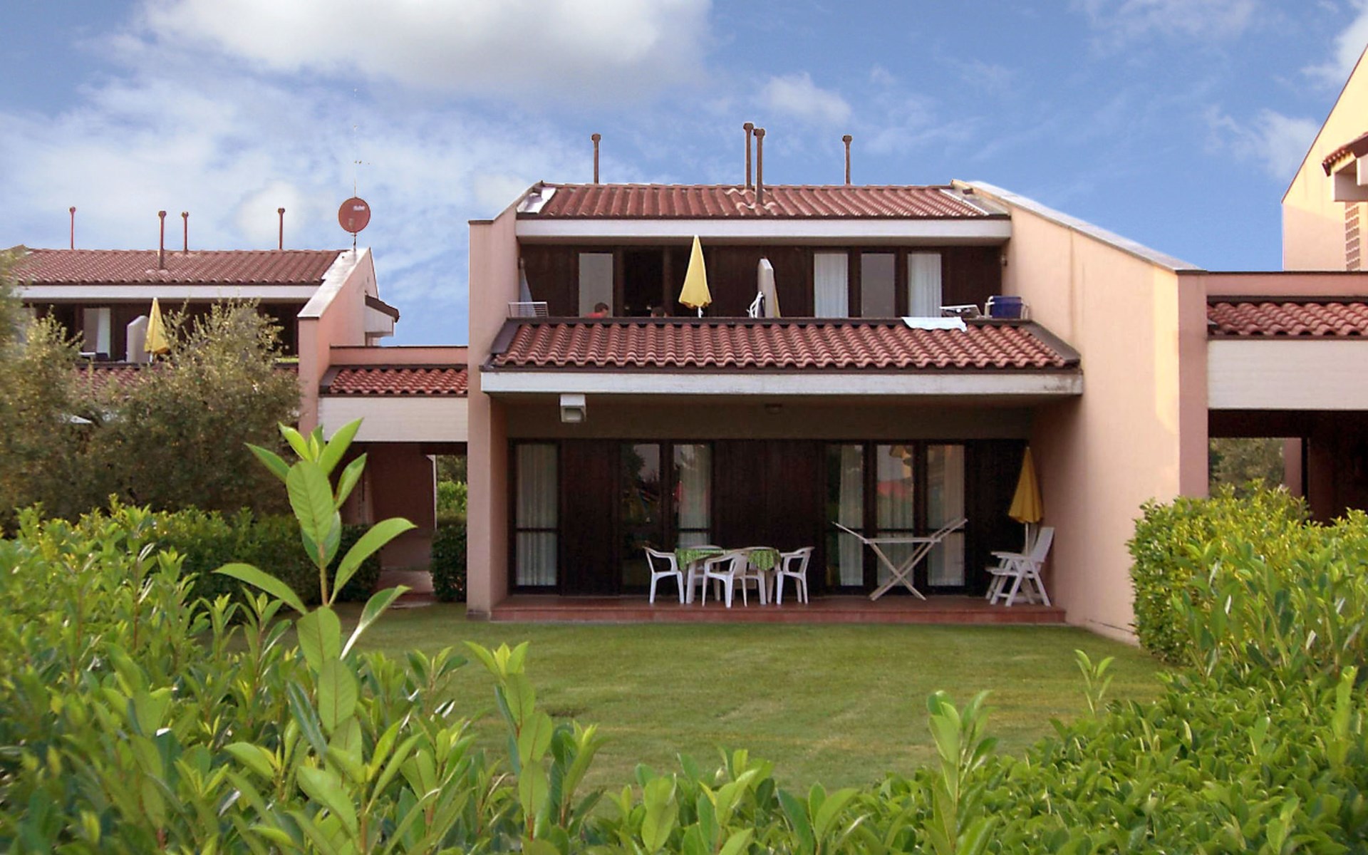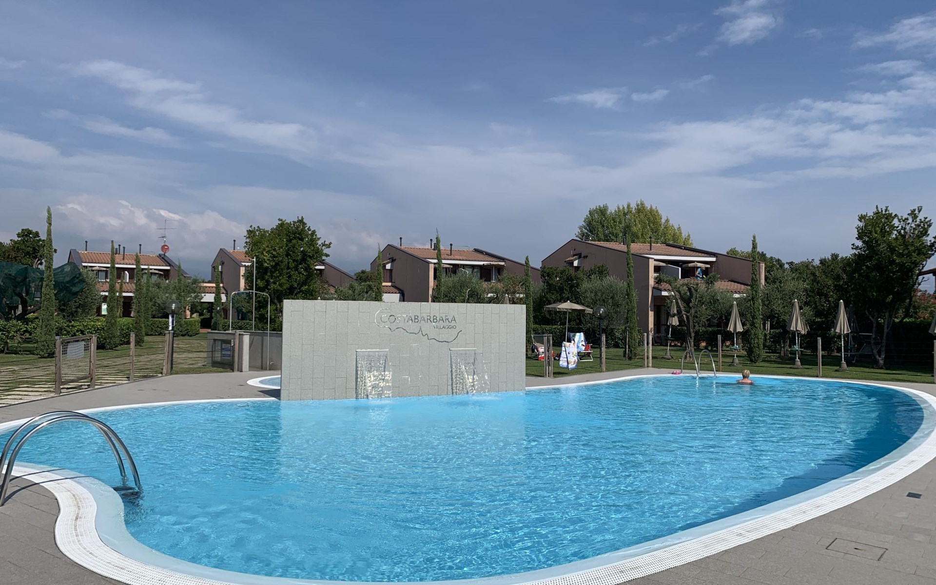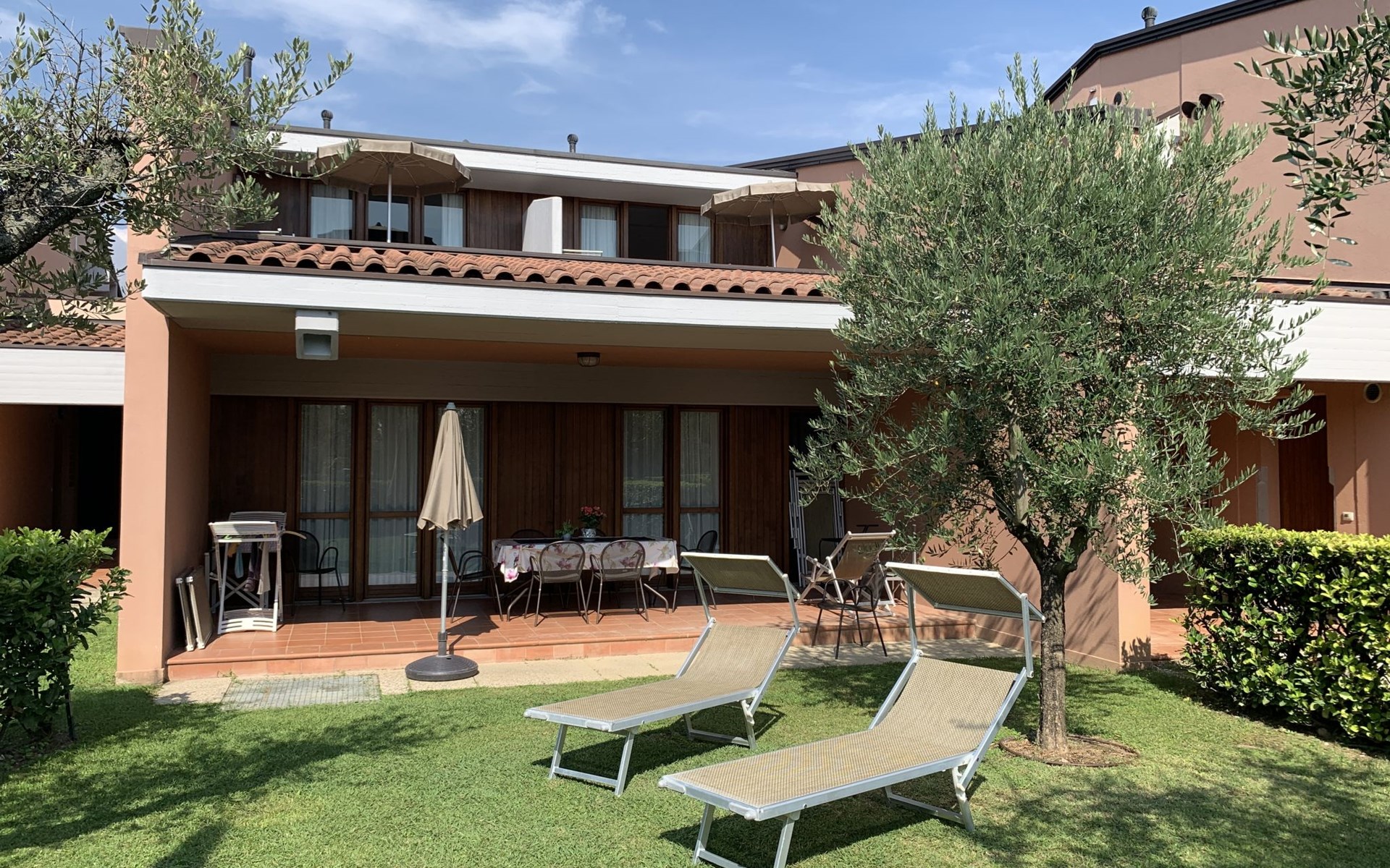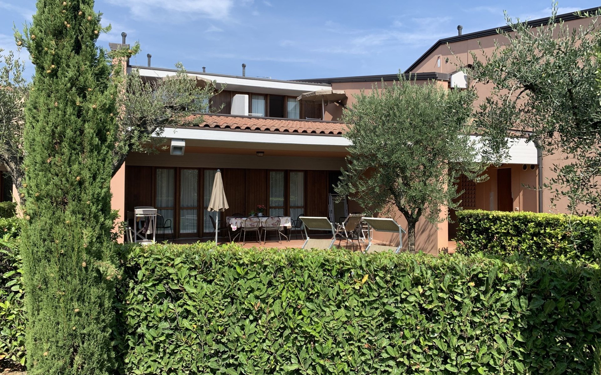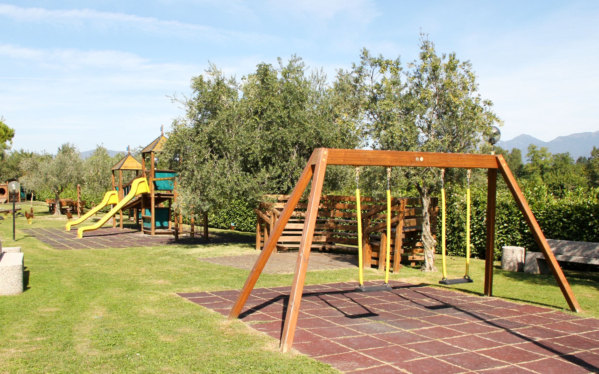 Child friendly resort "Barbara". 43 apartments in the residence. Outside the resort, 2 km from the centre of Moniga del Garda, 1 km from the lake. For shared use: property 10'000 m2 (fenced), lawn and trees, swimming pool kidney-shaped (seasonal availability: 15.Mar. - 15.Nov.). Children's pool, table tennis, beach volleyball, barbecue, children's playground. In the complex: reception, bar, WiFi, washing machine (for shared use, extra). Linen change weekly. Towel change weekly. Bread roll service, breakfast and half board on request (extra). Parking on the premises. Shop 50 m, supermarket 2 km, restaurant 50 m, bus stop 800 m, railway station "Desenzano del Garda" 12 km, pebble beach 1 km. Golf course 5 km. Please note: entertainment in the season. Suitable for families, baby equipment on request (extra). The owner does not accept any groups. Please note: WIFI in object only on balcony / terrasse.