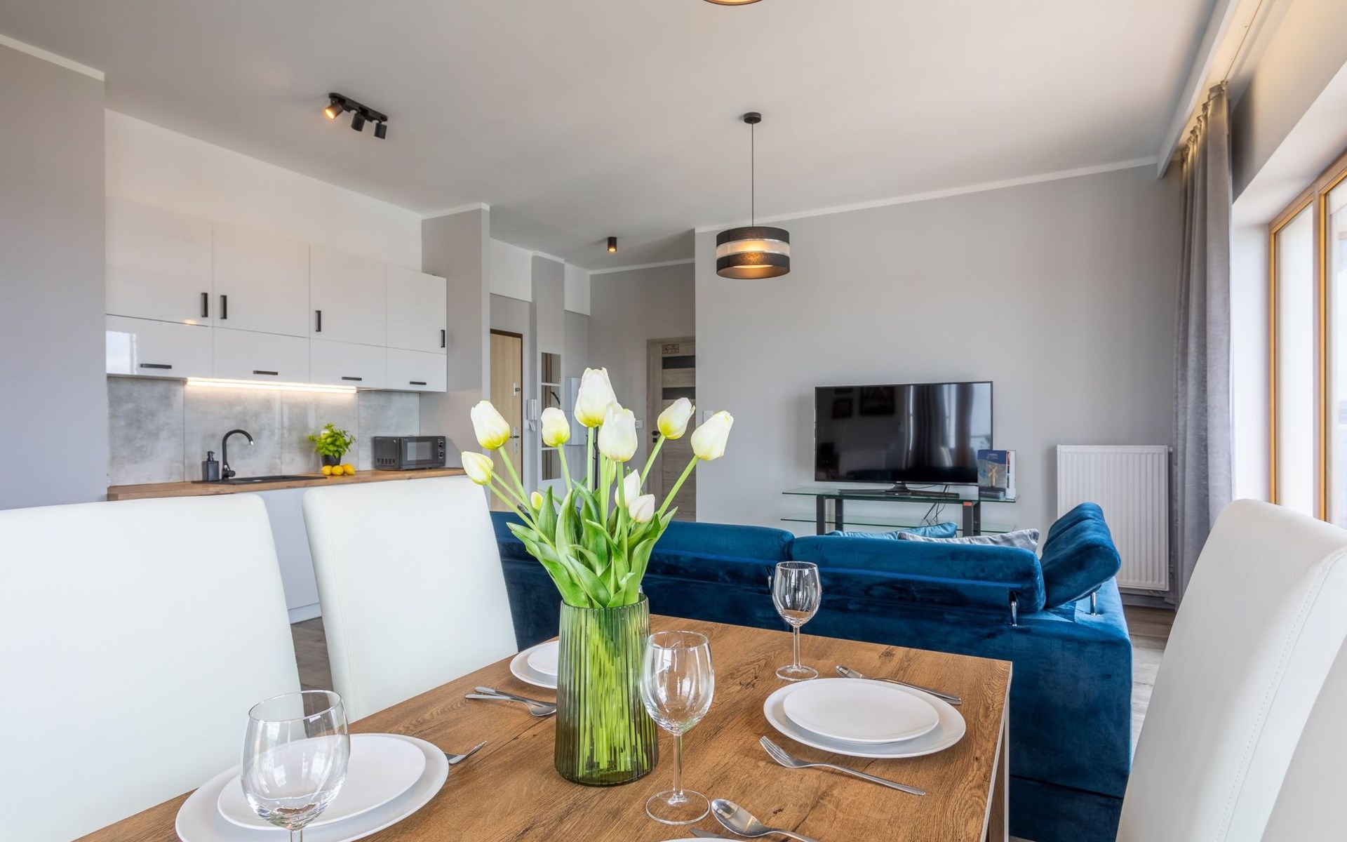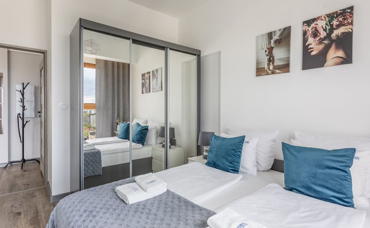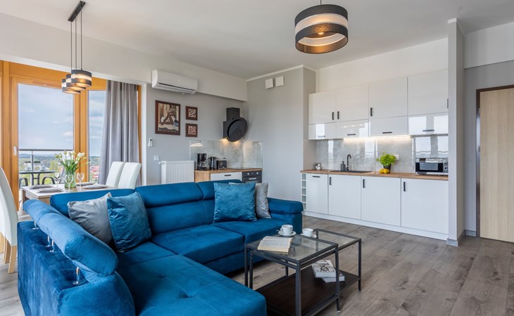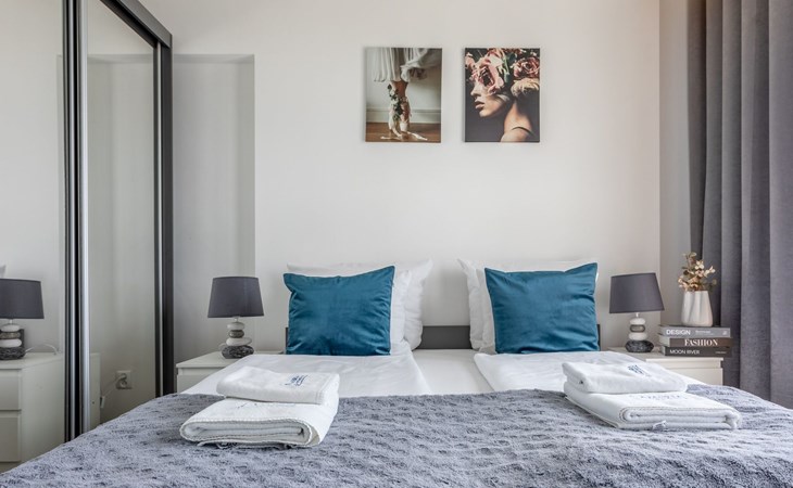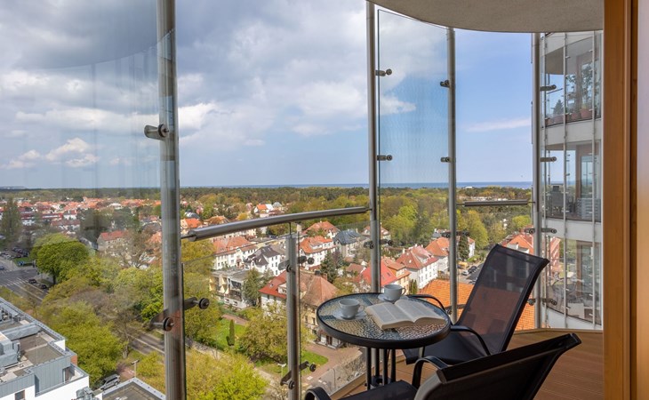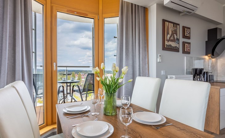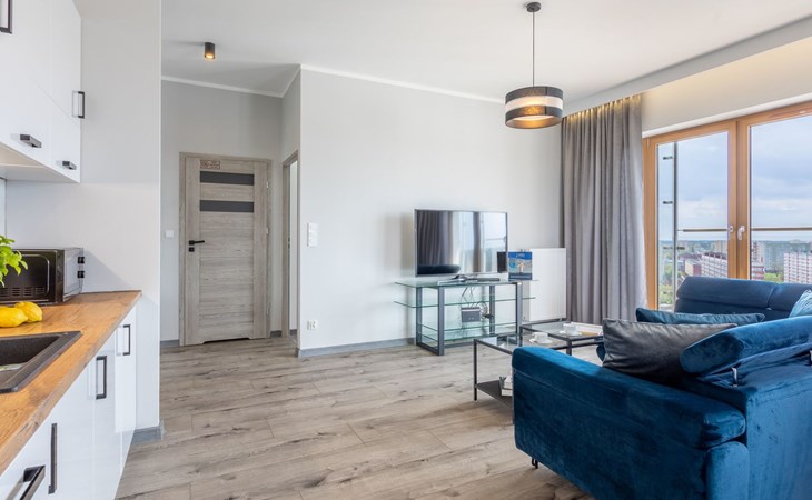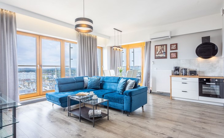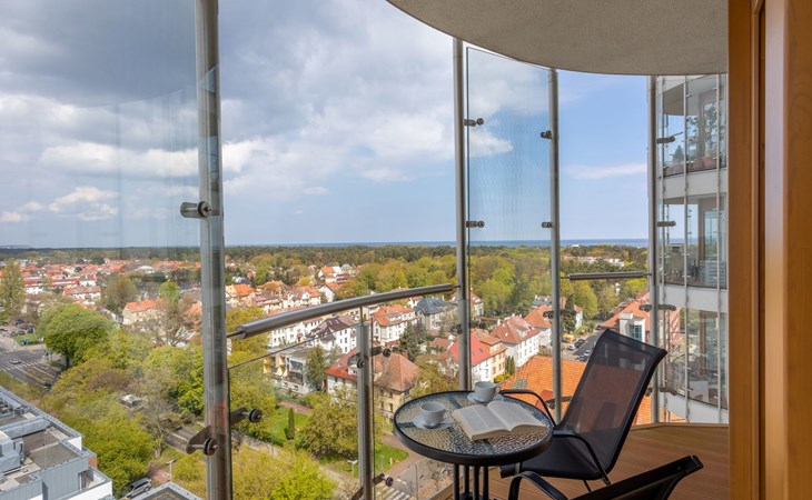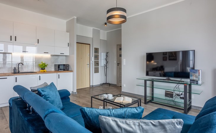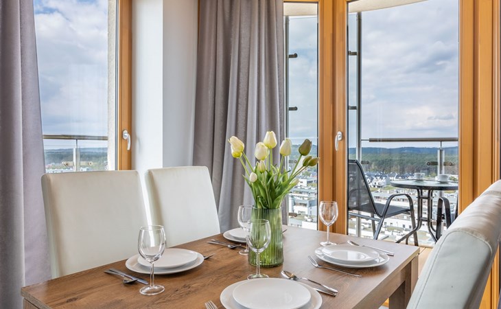 The "Tower 97" flat in Świnoujście is particularly appreciated by our guests for its excellent location, high standard of furnishings and breathtaking views of the city, the sea and Golm Mountain from the windows. It is located in a modern building that was put into operation in January 2020 and is part of the Platan complex.