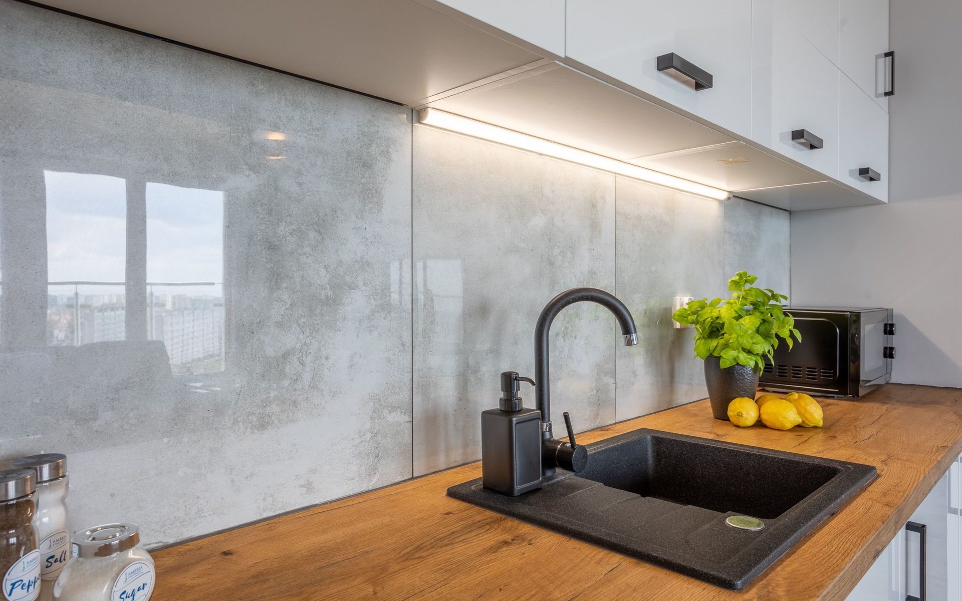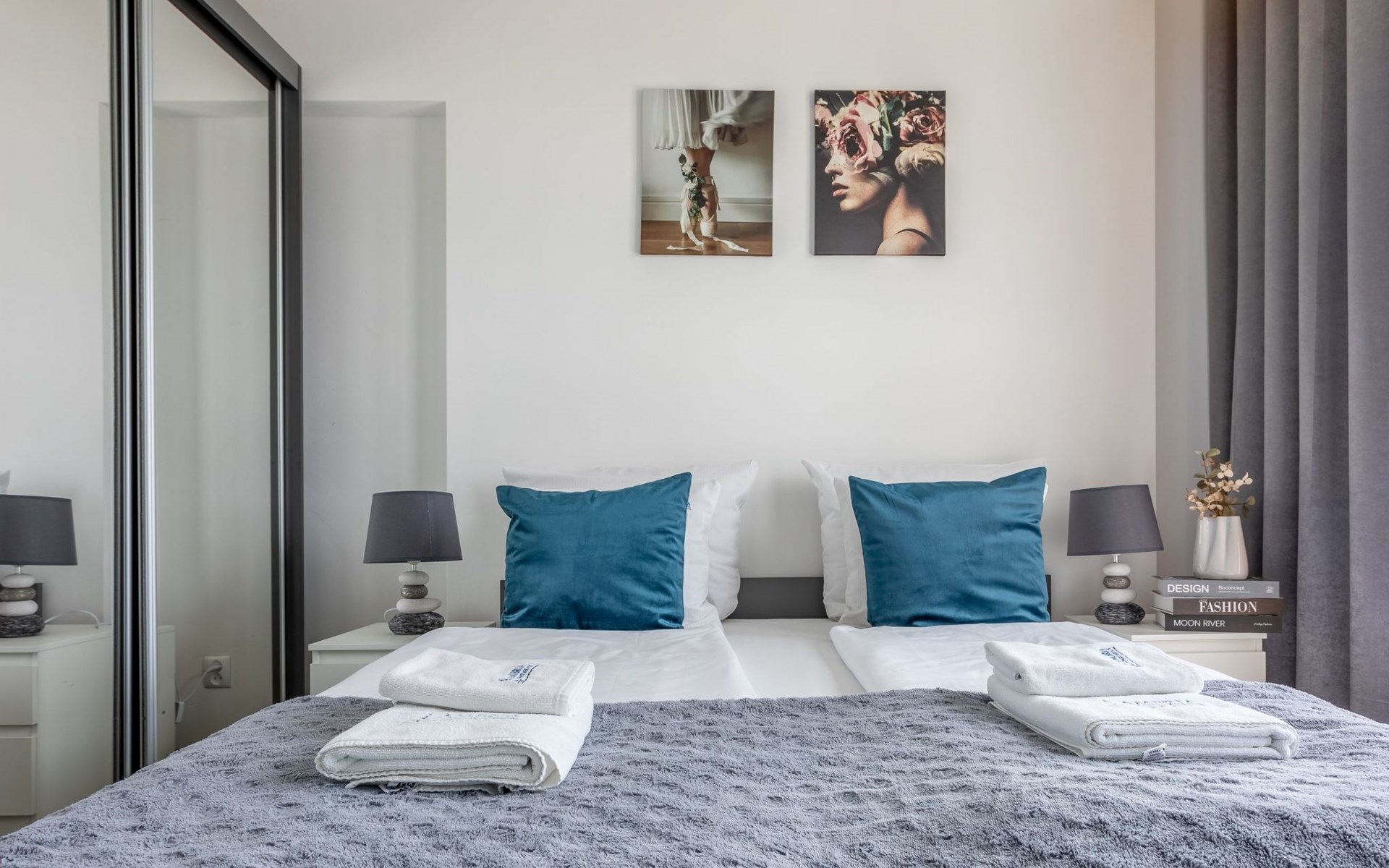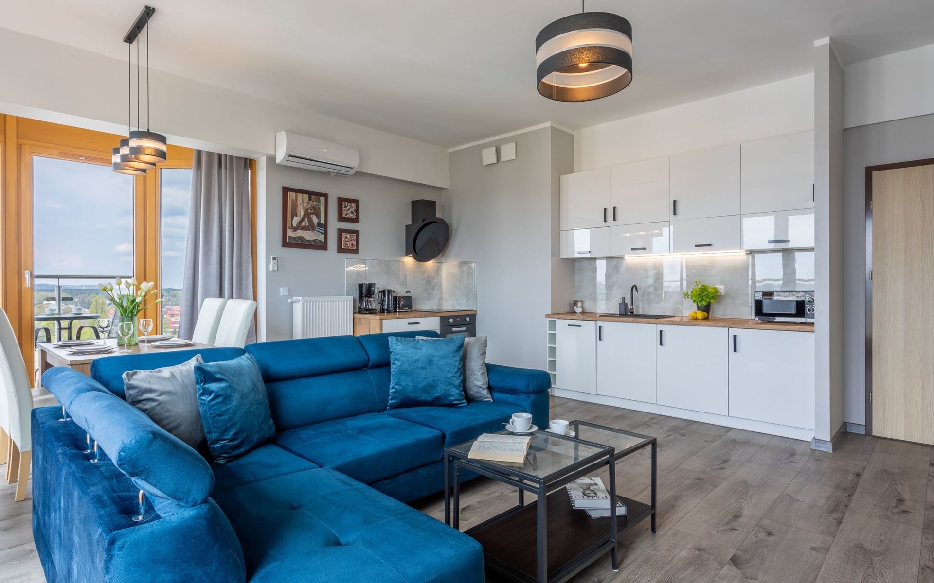 This is an air-conditioned flat on the eleventh floor. It consists of one bedroom, living room with well-equipped kitchenette and modern bathroom with total area of 49 m2. A great advantage is the balcony with a beautiful view and the opportunity to spend special moments admiring picturesque sunrises and sunsets or enjoying the beautiful panorama at any time of the day. The interior is very bright, dominated by shades of white, grey and beige mixed with deep blue, which undoubtedly evoke associations with the coastal climate, the sea and holidays.