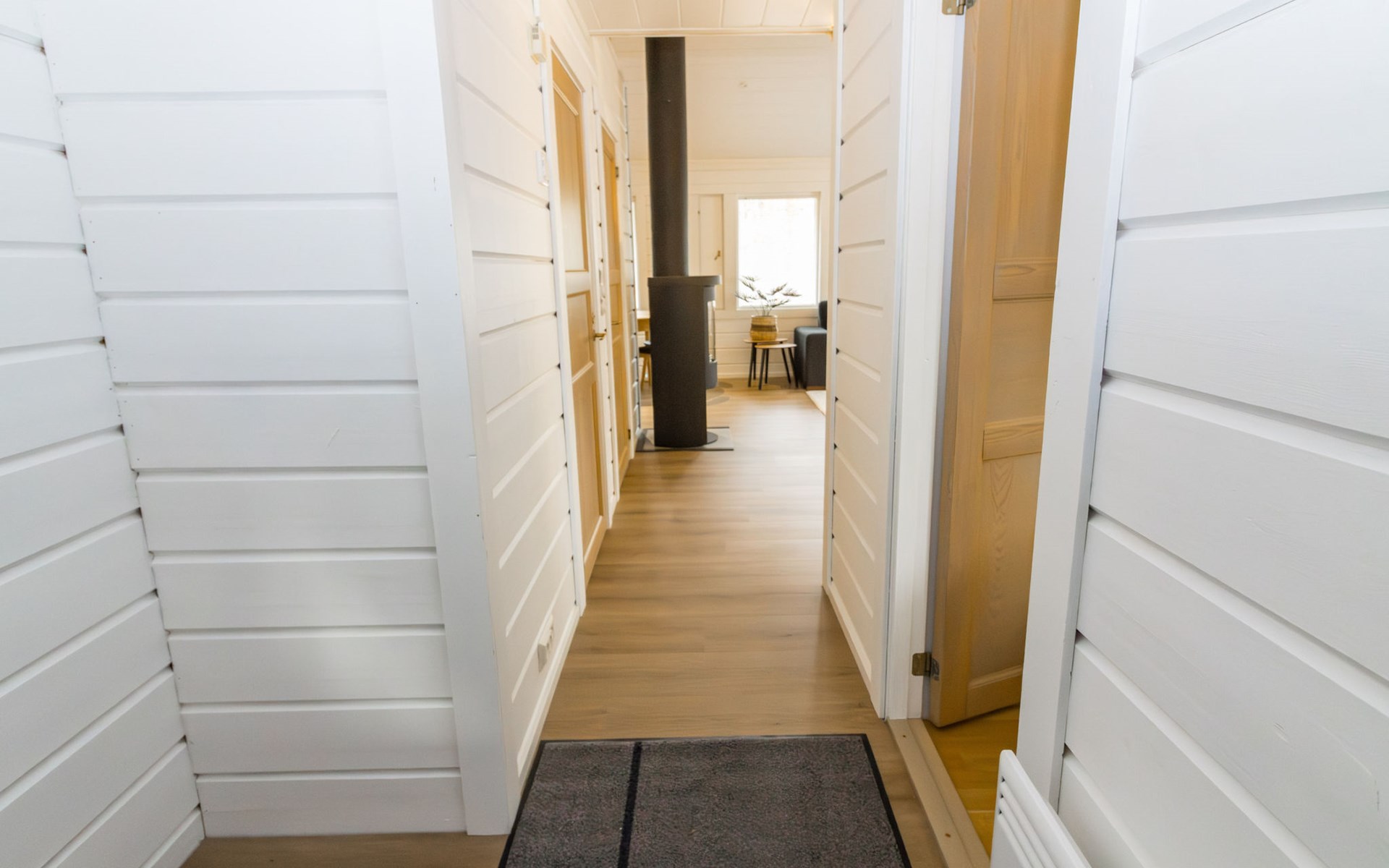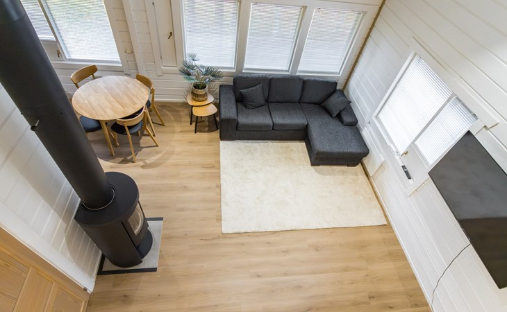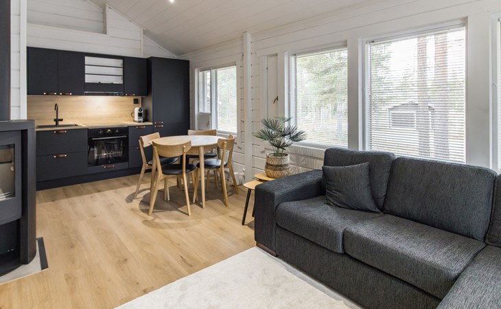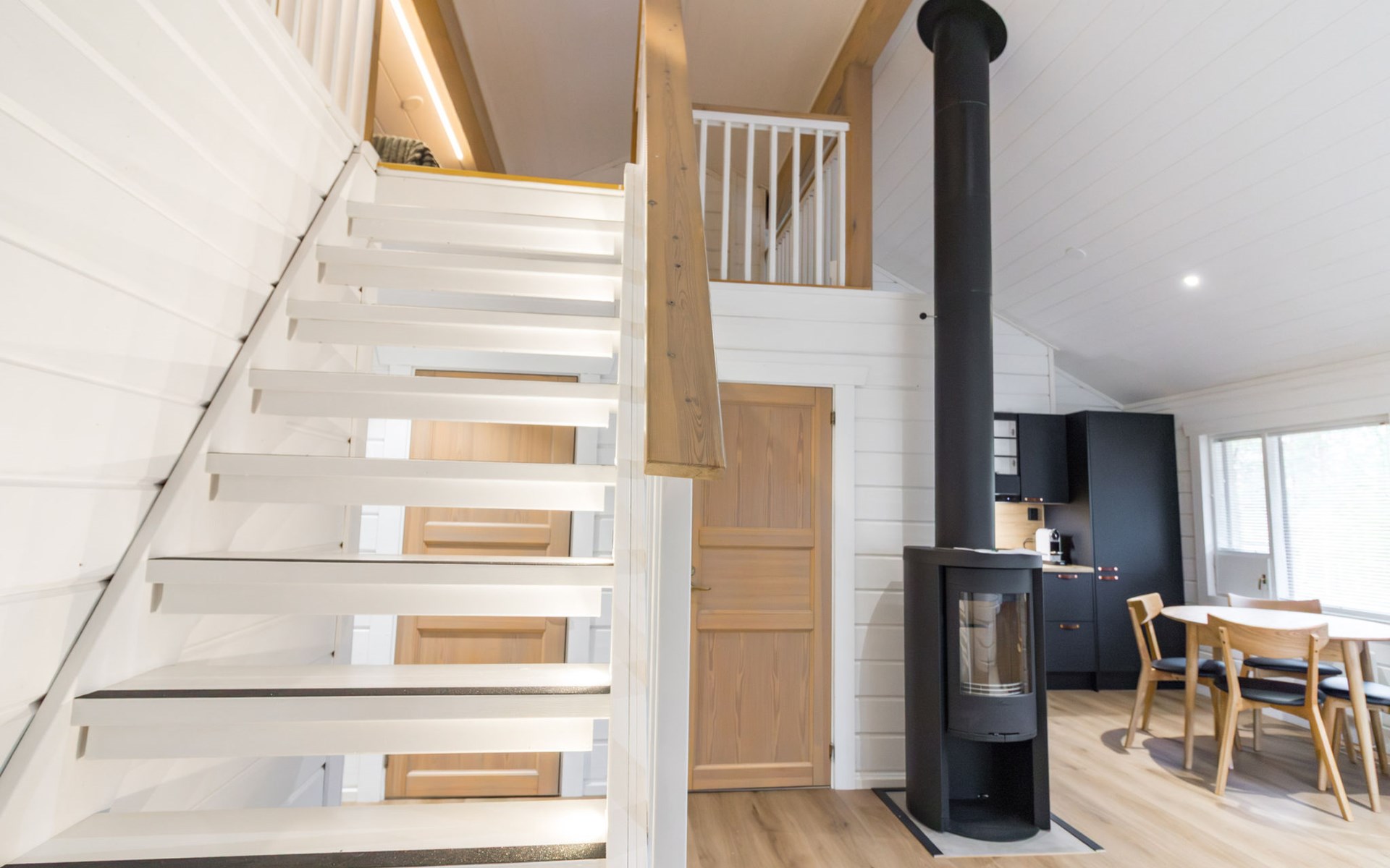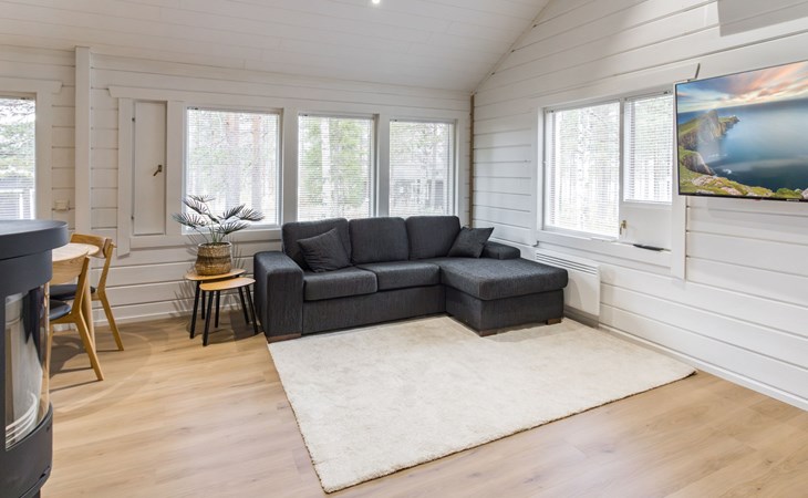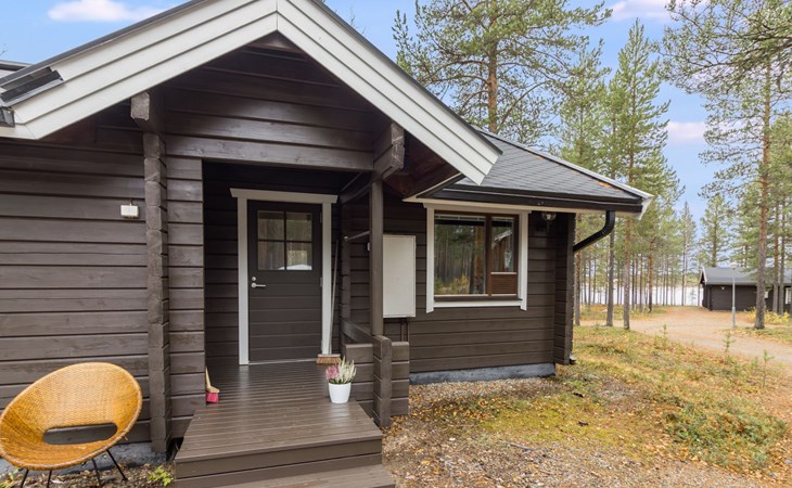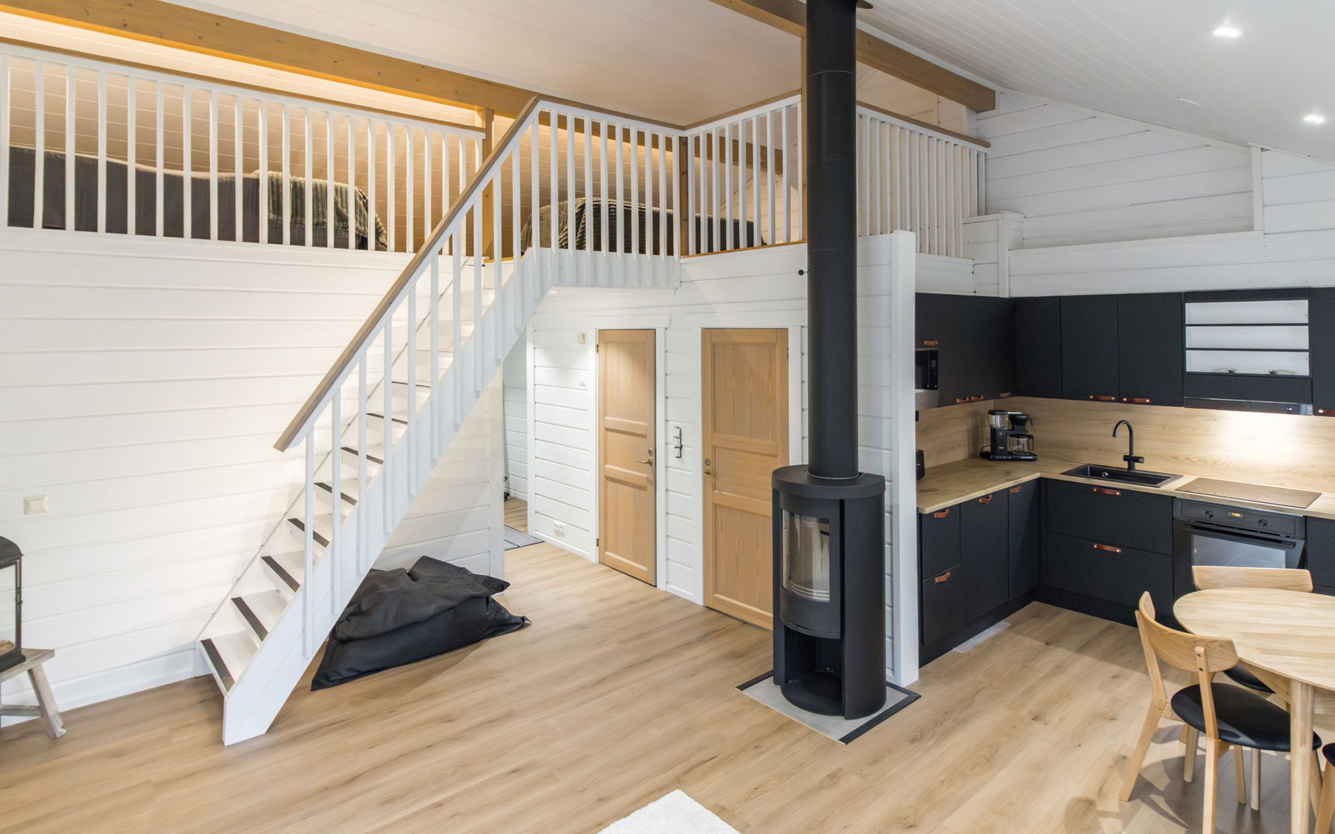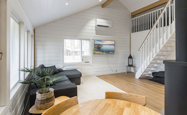The log semi-detached house was originally built in 1990, but completely renovated in 2025. The living room includes a kitchenette. The bedroom has a 160 cm double bed, and the loft has two single beds (80 cm wide each). The apartment also features an electric sauna, a washroom, and a separate WC.