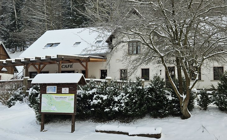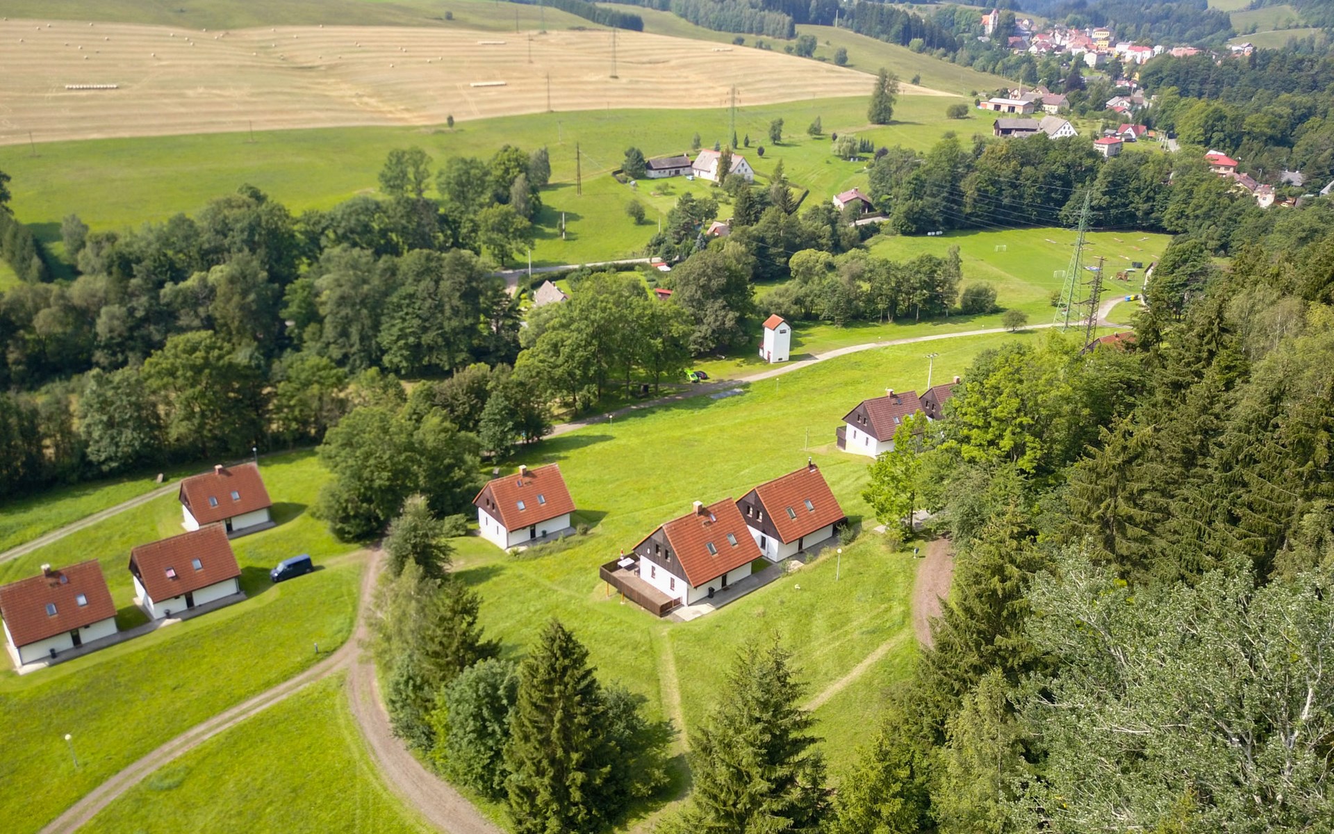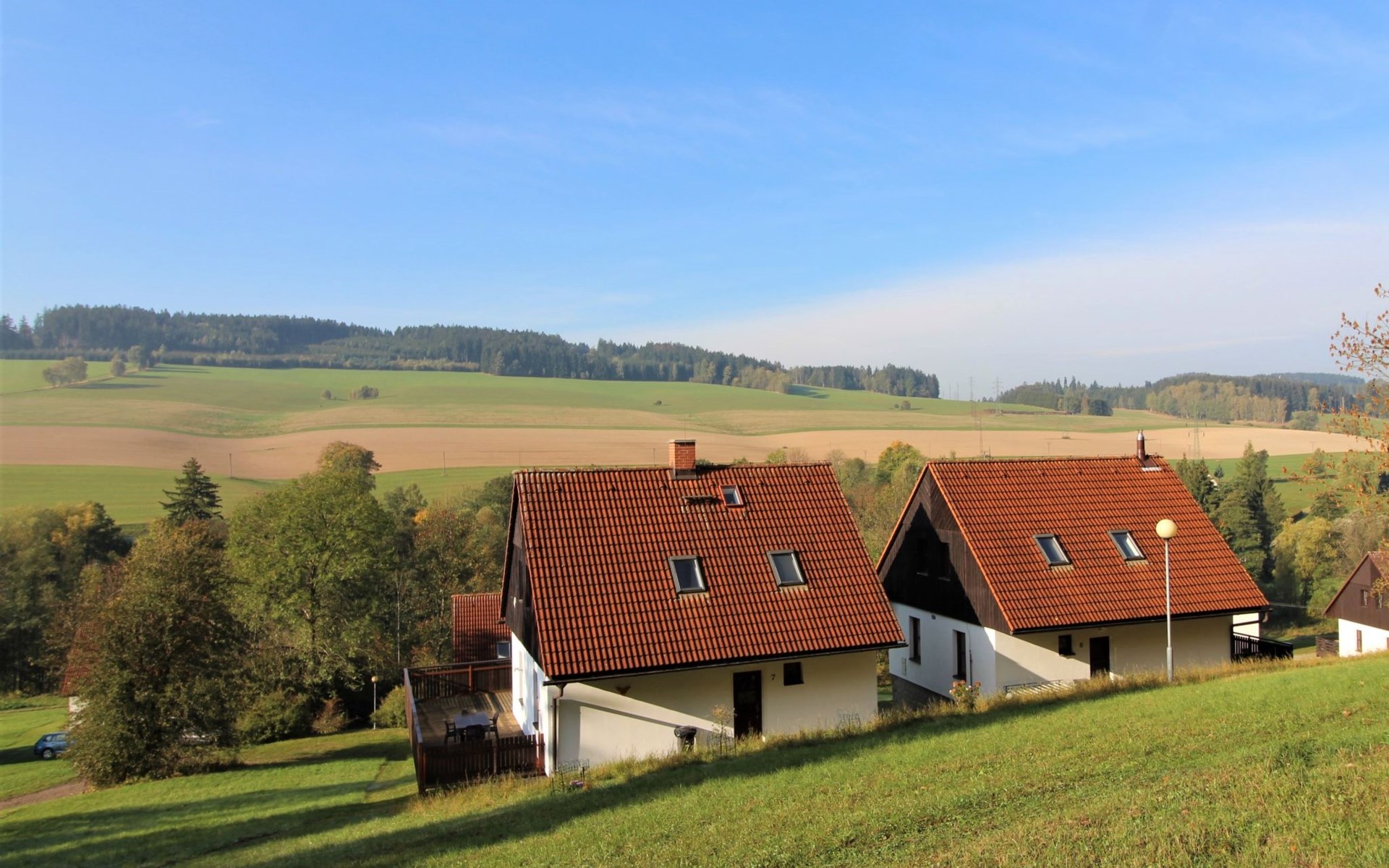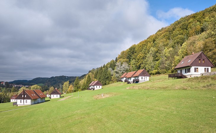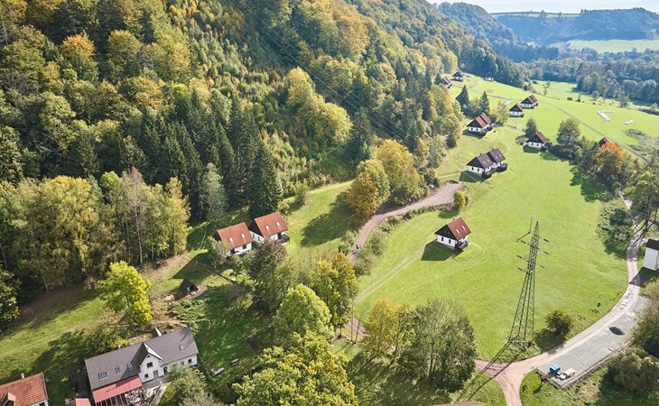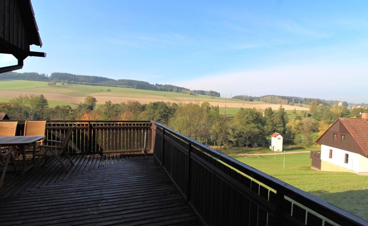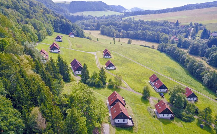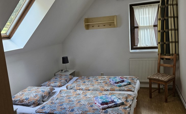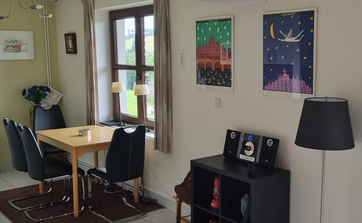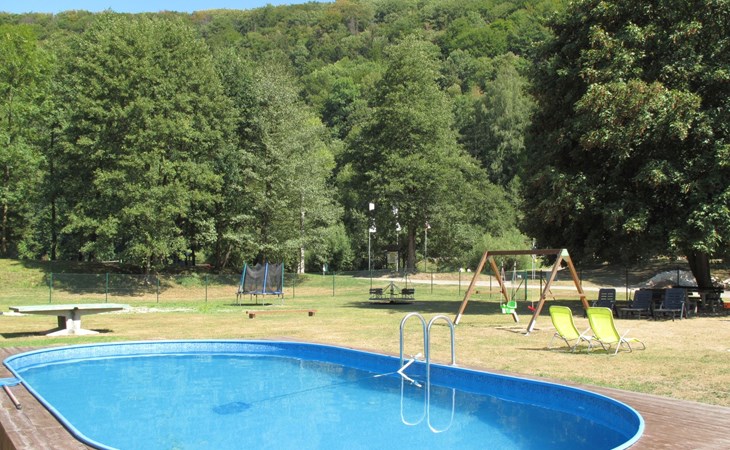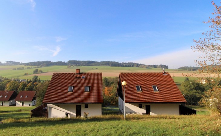 Stárkov 18 km from Náchod: Resort "Stárkov", 450 m a.s.l., detached, built in 1997, renovated in 2015, surrounded by meadows. 22 houses in the resort. On the outskirts, in a sunny, elevated position on a slope, along the wooded area, 24 km from the lake, 10 km from the skiing area, in the countryside. For shared use: property 10 ha, meadow, pond, swimming pool (8 x 4 m, depth 150 cm, seasonal availability: 15.Jun. - 16.Sep.). Table tennis, volleyball, badminton, volleyball court, beach volleyball, patio, barbecue, fireplace, children's playground (slide, swing, sandbox). In the complex: reception, lounge, bistro, massage (extra). Billiard table, playroom, table football, trampoline, kiosk, storage room for bicycles, laundry (extra), bicycle rental. Linen change (suppl. charge extra). Towel change (suppl. charge extra). Room cleaning on request (extra). Bread roll service possible on request. Pre-arrival grocery service. 200 m long steep, narrow motor access. Parking (for 2 cars) at the house. Grocery 1 km, supermarket 8 km, restaurant 1 km, café 10 m, bus stop "Stárkov, mlékárna" 50 m, railway station "Hronov" 8 km, indoor swimming pool 18 km. Golf course (9 hole) 26 km, sailing school 26 km, tennis 500 m, minigolf 10 m, riding stable 10 m, walking paths from the house, cycle lane, ski lift 6 km, ski school 17 km, cross country ski track 100 m, ice rink 8 km, children's playground 10 m. Nearby attractions: Adršpašsko-teplické skály 15 km, Náchod 17 km, Broumovské stěny 17 km, Ratibořice a Babiččino údolí 22 km, Broumov 24 km, Relaxpark Pec pod Sněžkou 50 km. Well-known ski regions can easily be reached: Radvanice 10 km, Petříkovice 17 km, Mladé Buky 36 km. Well-known lakes can easily be reached: vodní nádrž Rozkoš 26 km. Please note: suitable for families, baby equipment on request (included). Electric cars cannot be charged from the power supply of the rented house.