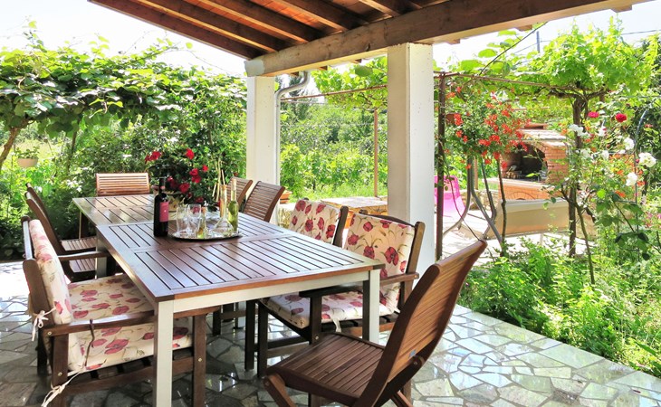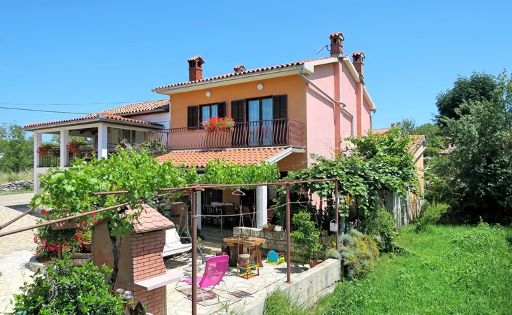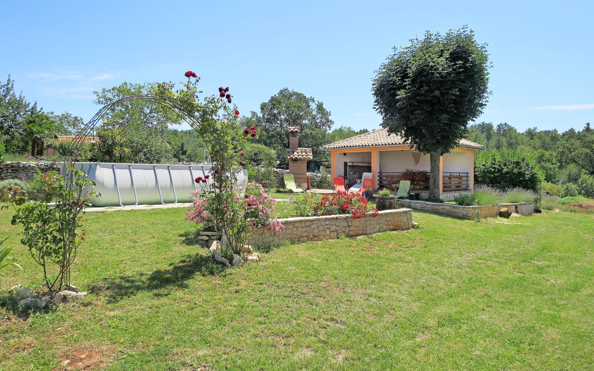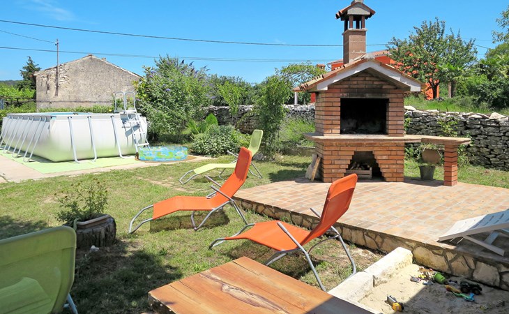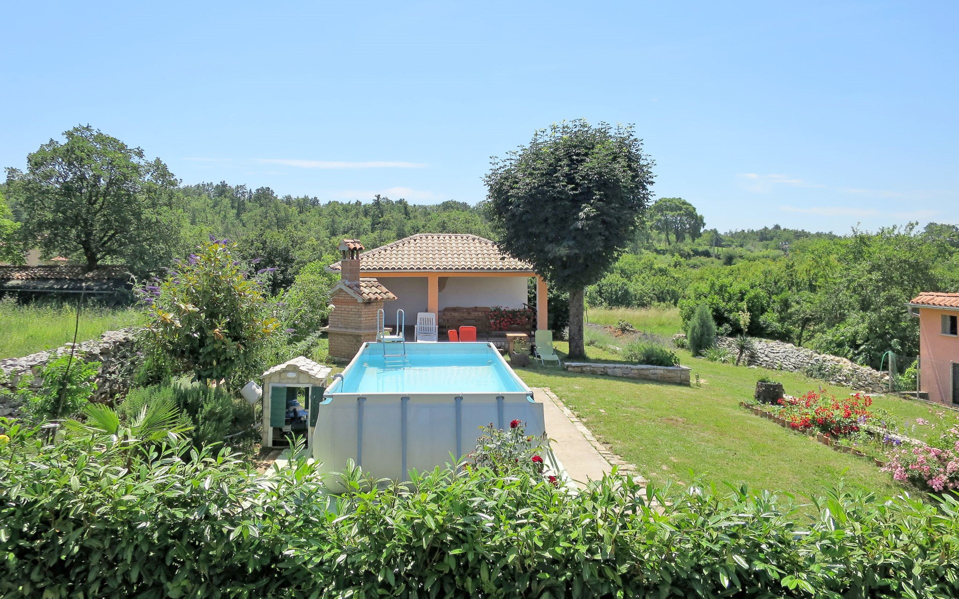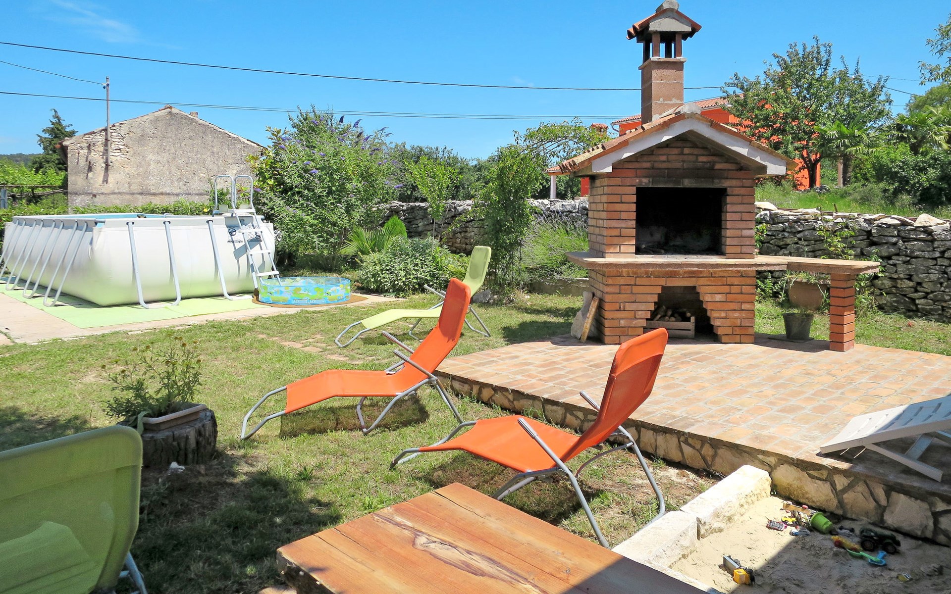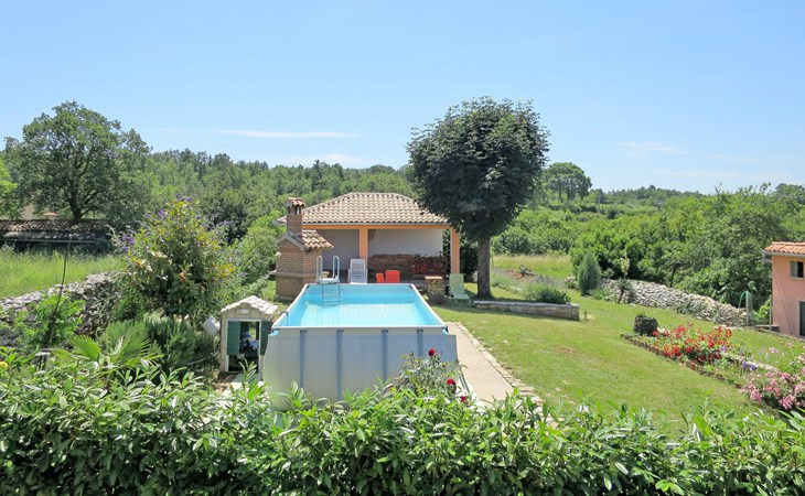 Semi-detached house "La Donja", 2 storeys. In the hamlet Paradiž 10 km from the centre of Labin, 1 km from the centre of Sveti Martin, 14 km from the centre of Rabac, 14 km from the sea. For shared use: property 1'700 m2 with lawn and plants. Private: property 200 m2 with lawn, swimming pool (above ground) angular (5 x 2 m, 15 m2, depth 110 cm, seasonal availability: 08.May. - 25.Sep.). Terrace, garden furniture, barbecue. In the house: internet access, washing machine. Parking (for 3 cars) at the house on the premises. Shop 1 km, supermarket 10 km, restaurant 1 km, bus stop 9.9 km, pebble beach 14 km. Marina 14 km. For private use: outdoor kitchen (2 hot plates).