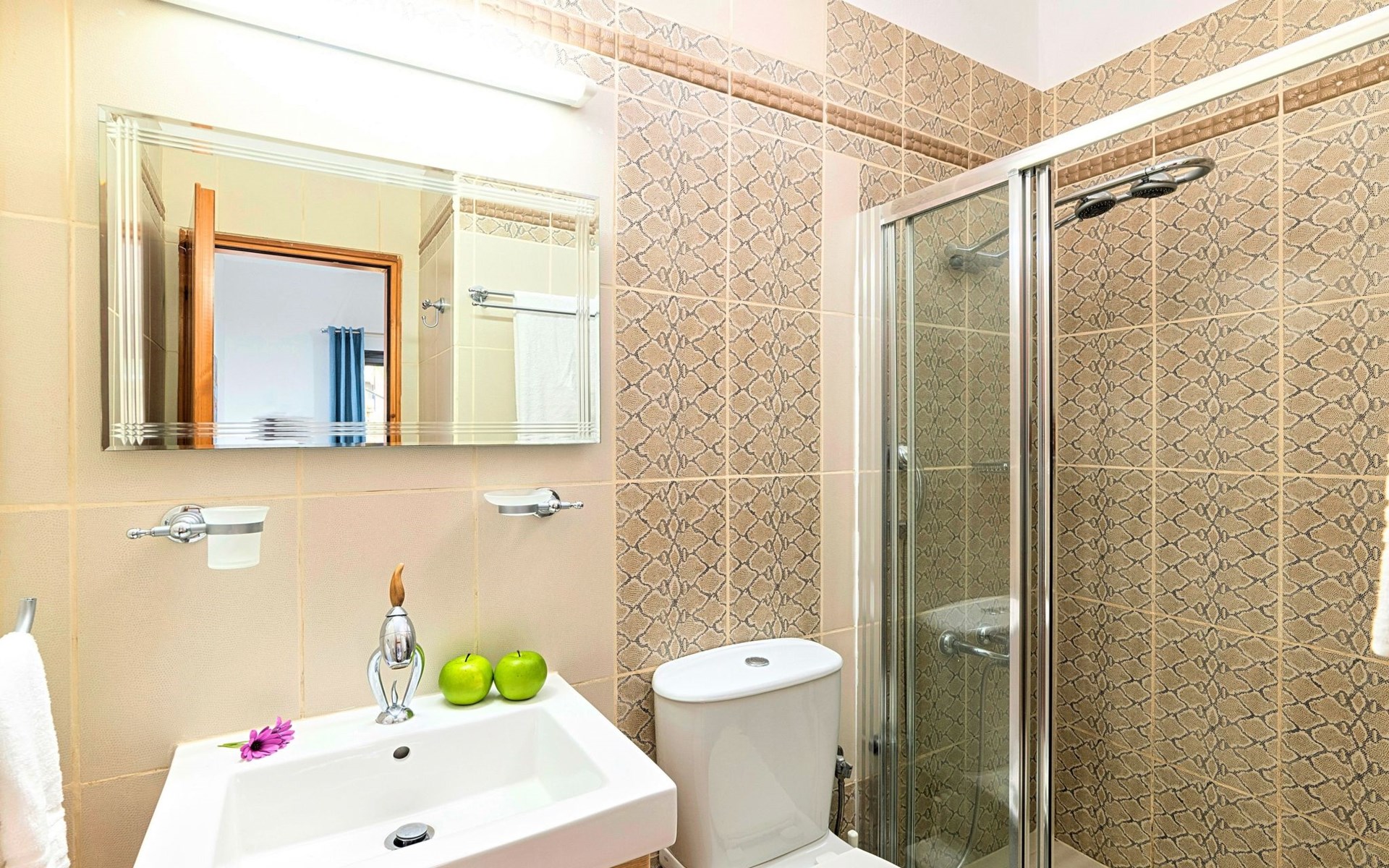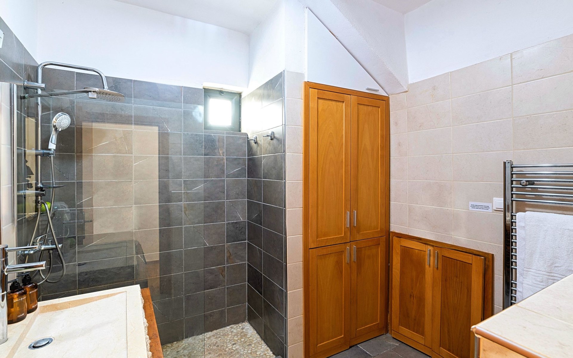● A bedroom with a queen-size double bed and en suite bathroom with shower.
