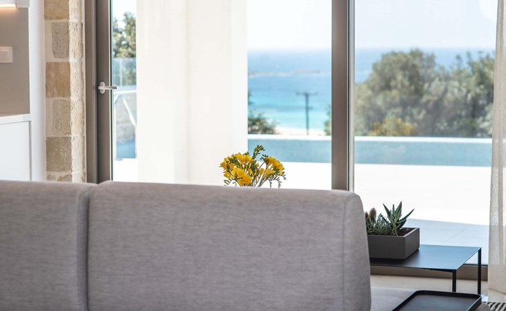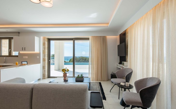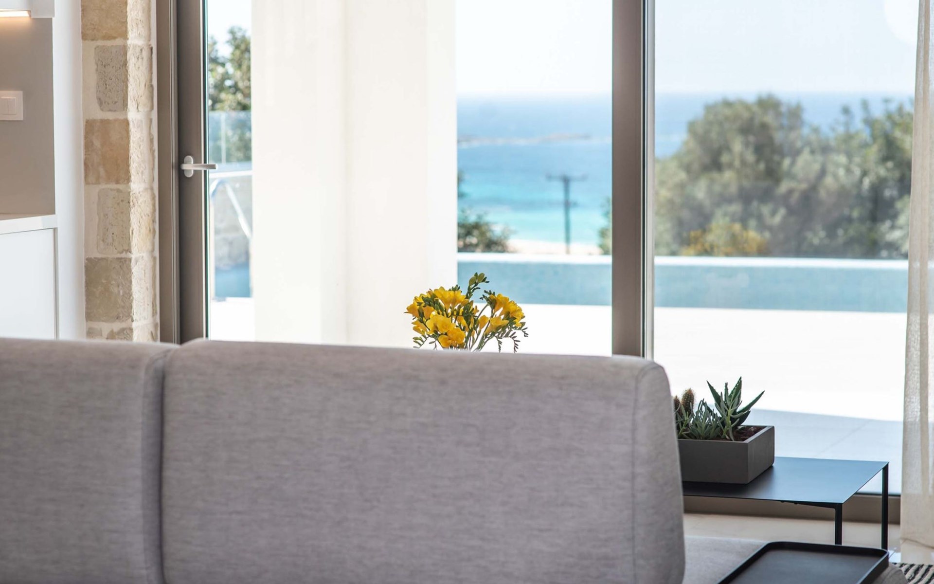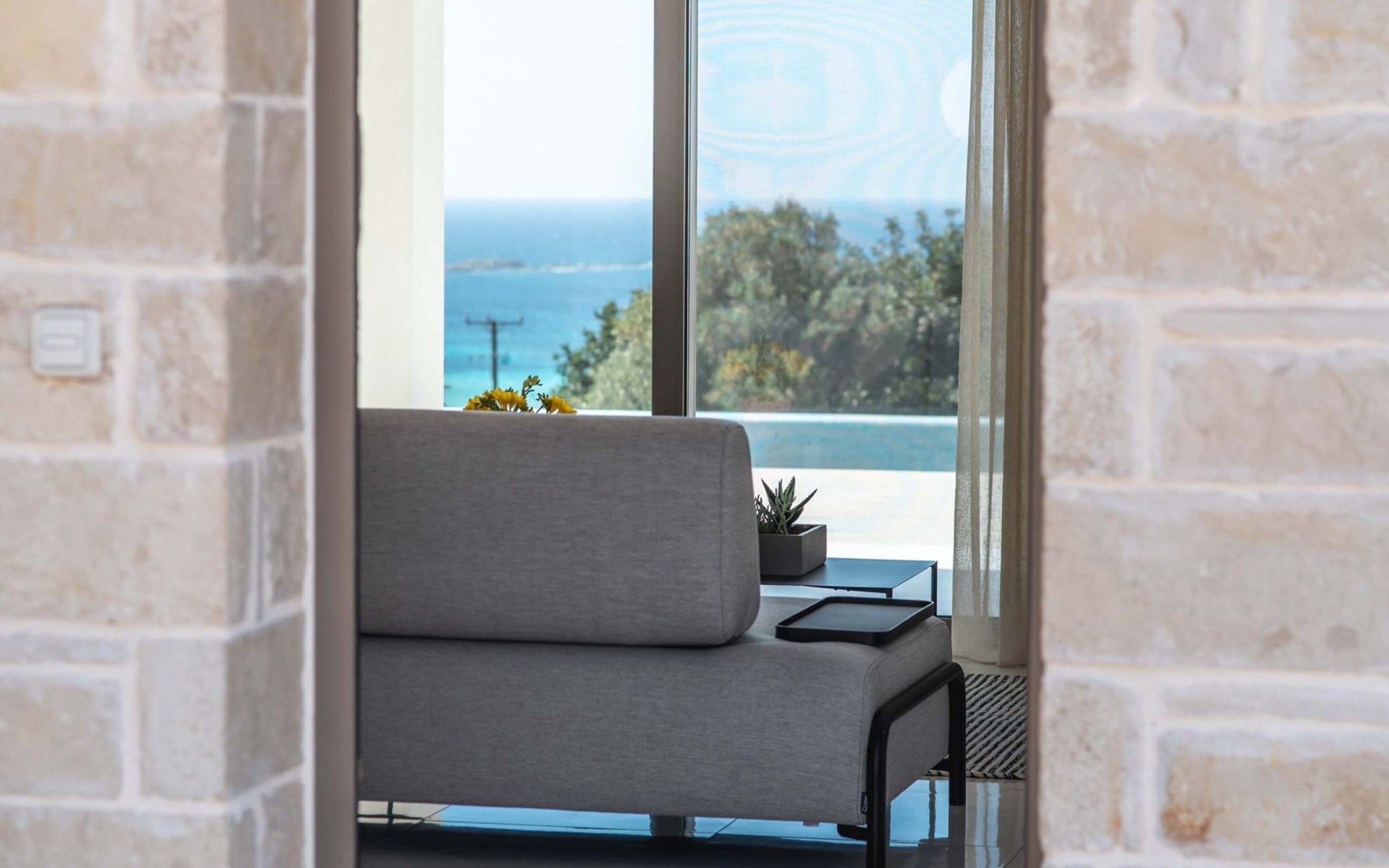 Living area with sofa, 43’’ satellite Smart TV, access to the pool terrace, sea view