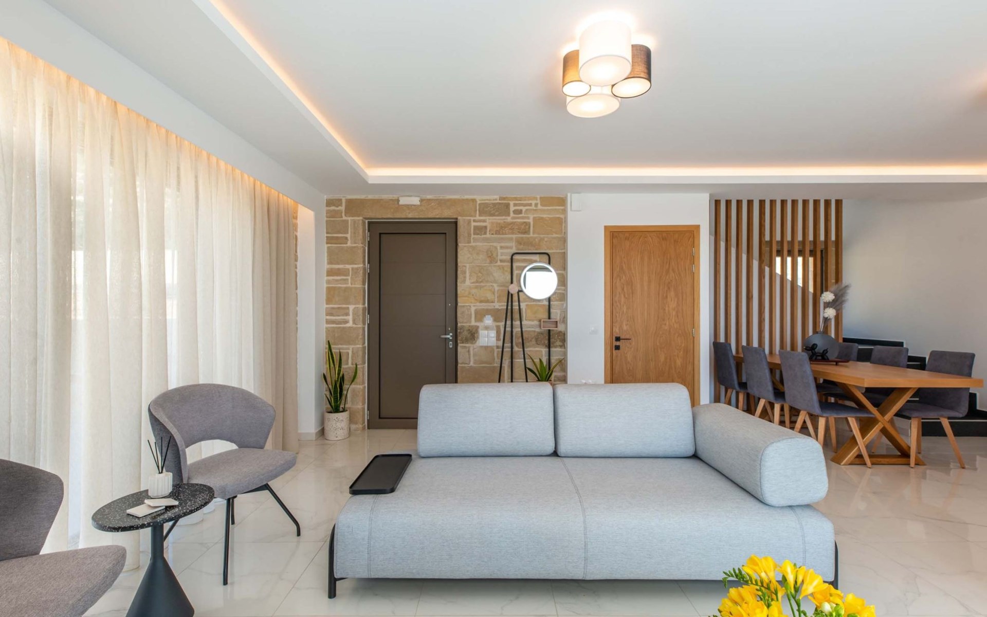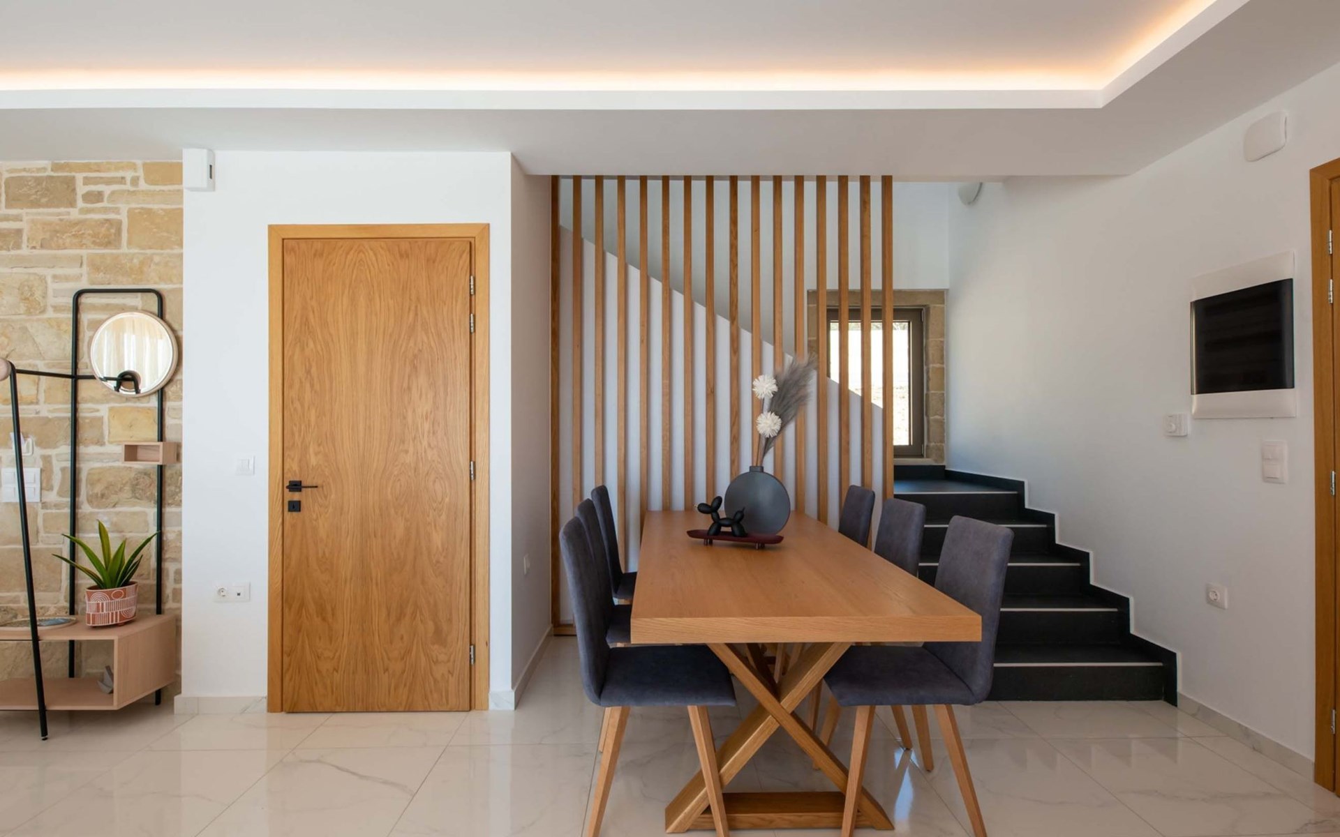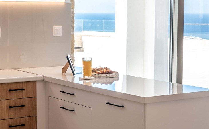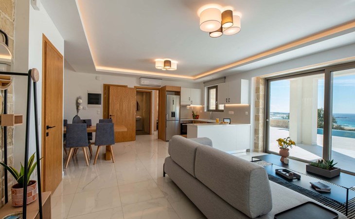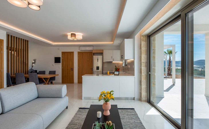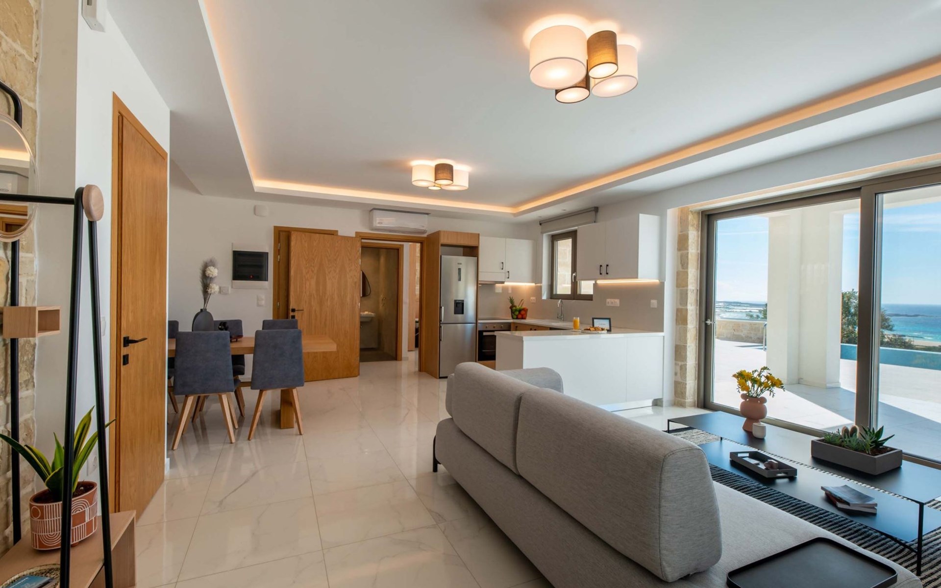 A sleek contemporary villa with arresting views, designed over three floors, features generous indoor and outdoor areas with a lavish design. Entering the villa you will step into a large living area with breathtaking views of the sea. The supreme amenities, the exuberant living room, and the dining area are also adequate for people with special needs. The villa is styled to feel like an immersive sanctuary, where natural materials meet modern design for a calming atmosphere that is luxurious yet comfortable with every space designed to embrace the exterior environment. Pretty close to the living area there is a glossy kitchen where cooking is anything but a chore and have light breakfasts and gourmet dinners. On the same level, there is also a bedroom with a satellite Smart TV and large windows that create the illusion of transparency and a dining room with seating for 6 persons.