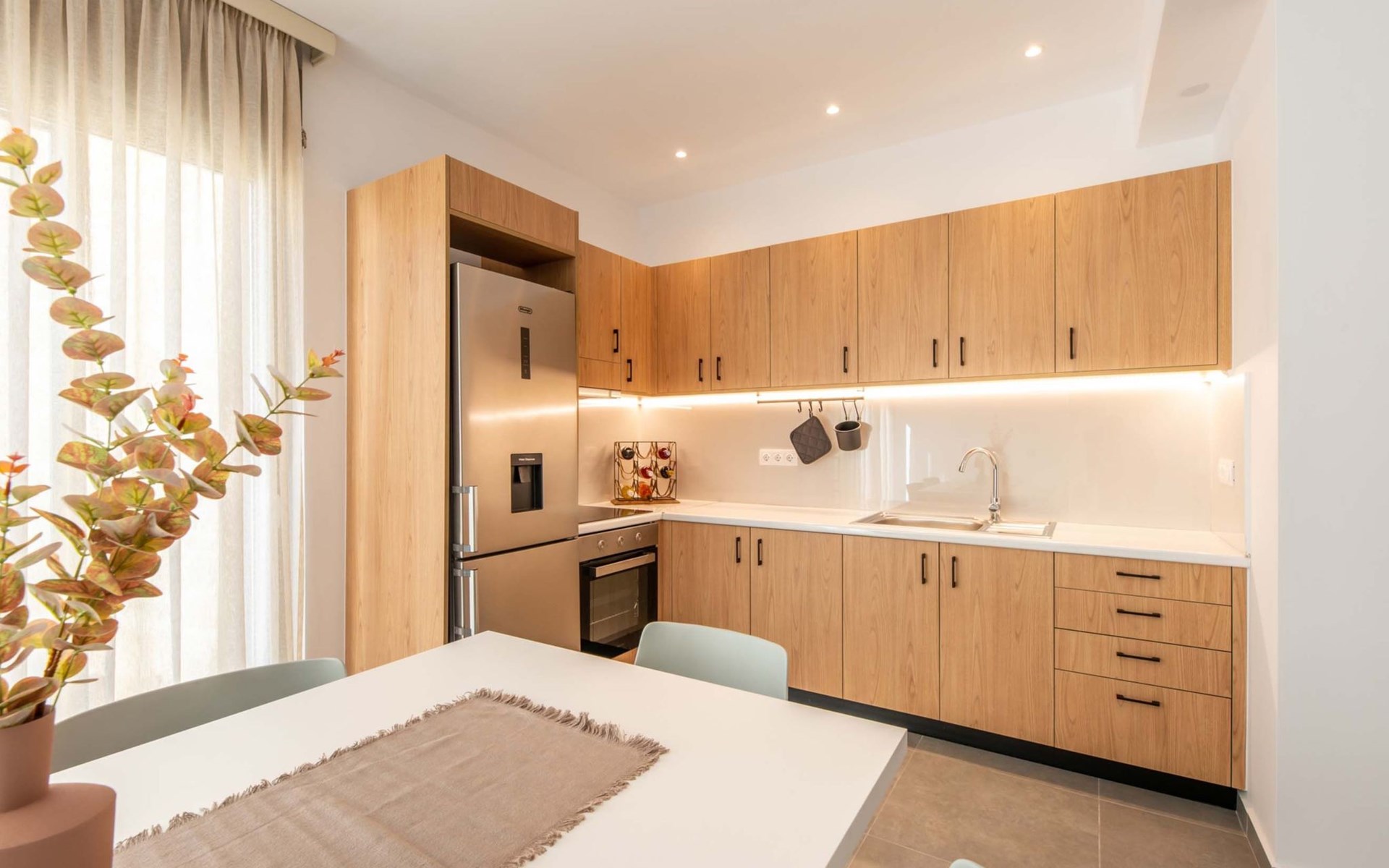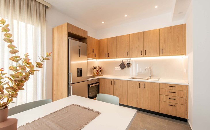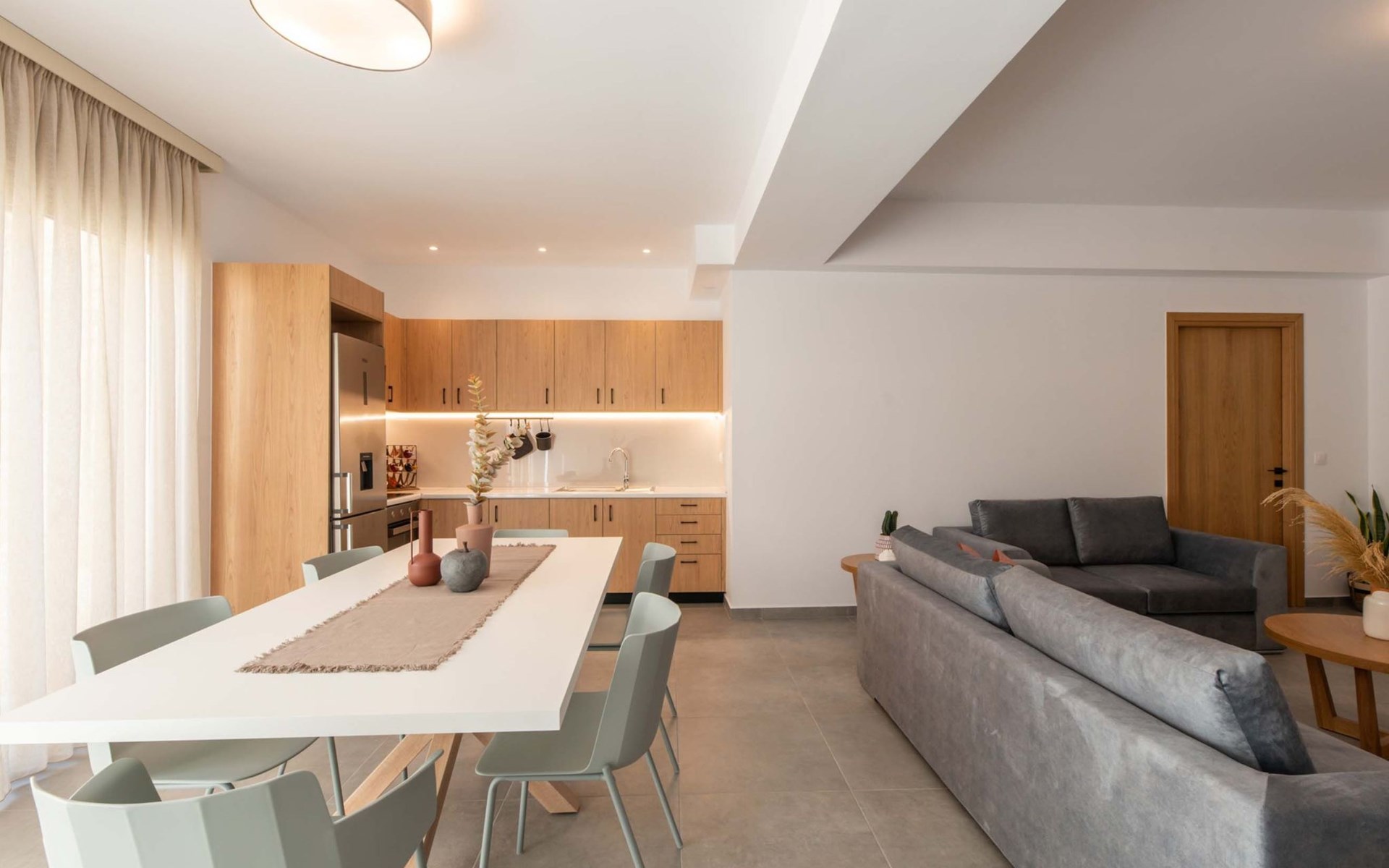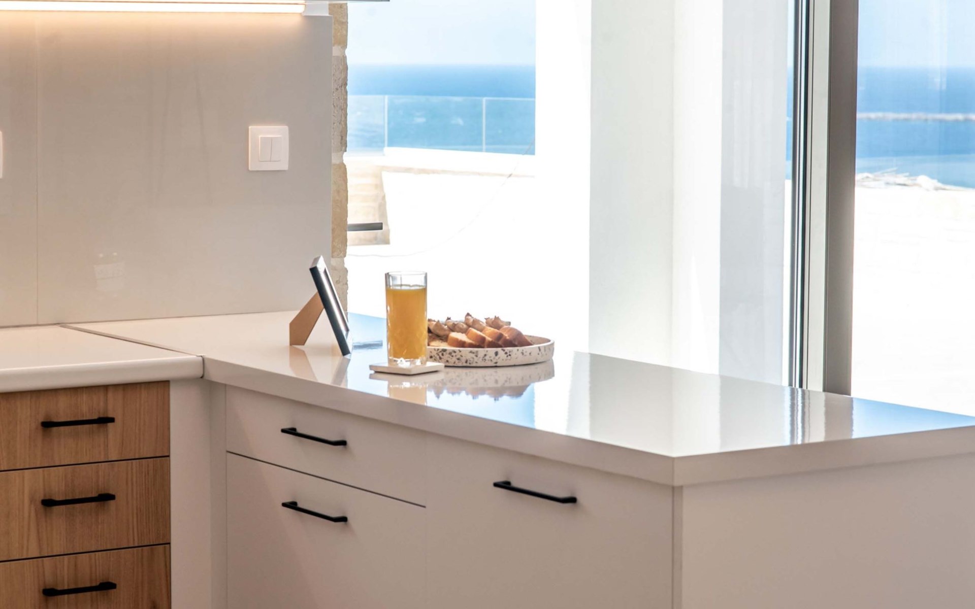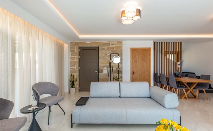 A sleek contemporary villa with arresting views, designed over three floors, features generous indoor and outdoor areas with a lavish design. Entering the villa you will step into a large living area with breathtaking views of the sea. The supreme amenities, the exuberant living room, and the dining area are also adequate for people with special needs. The villa is styled to feel like an immersive sanctuary, where natural materials meet modern design for a calming atmosphere that is luxurious yet comfortable with every space designed to embrace the exterior environment. Pretty close to the living area there is a glossy kitchen where cooking is anything but a chore and have light breakfasts and gourmet dinners. On the same level, there is also a bedroom with a satellite Smart TV and large windows that create the illusion of transparency and a dining room with seating for 6 persons.