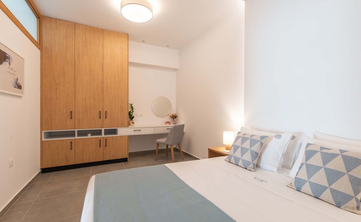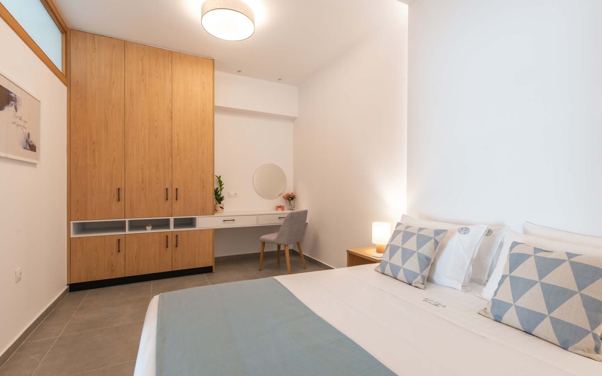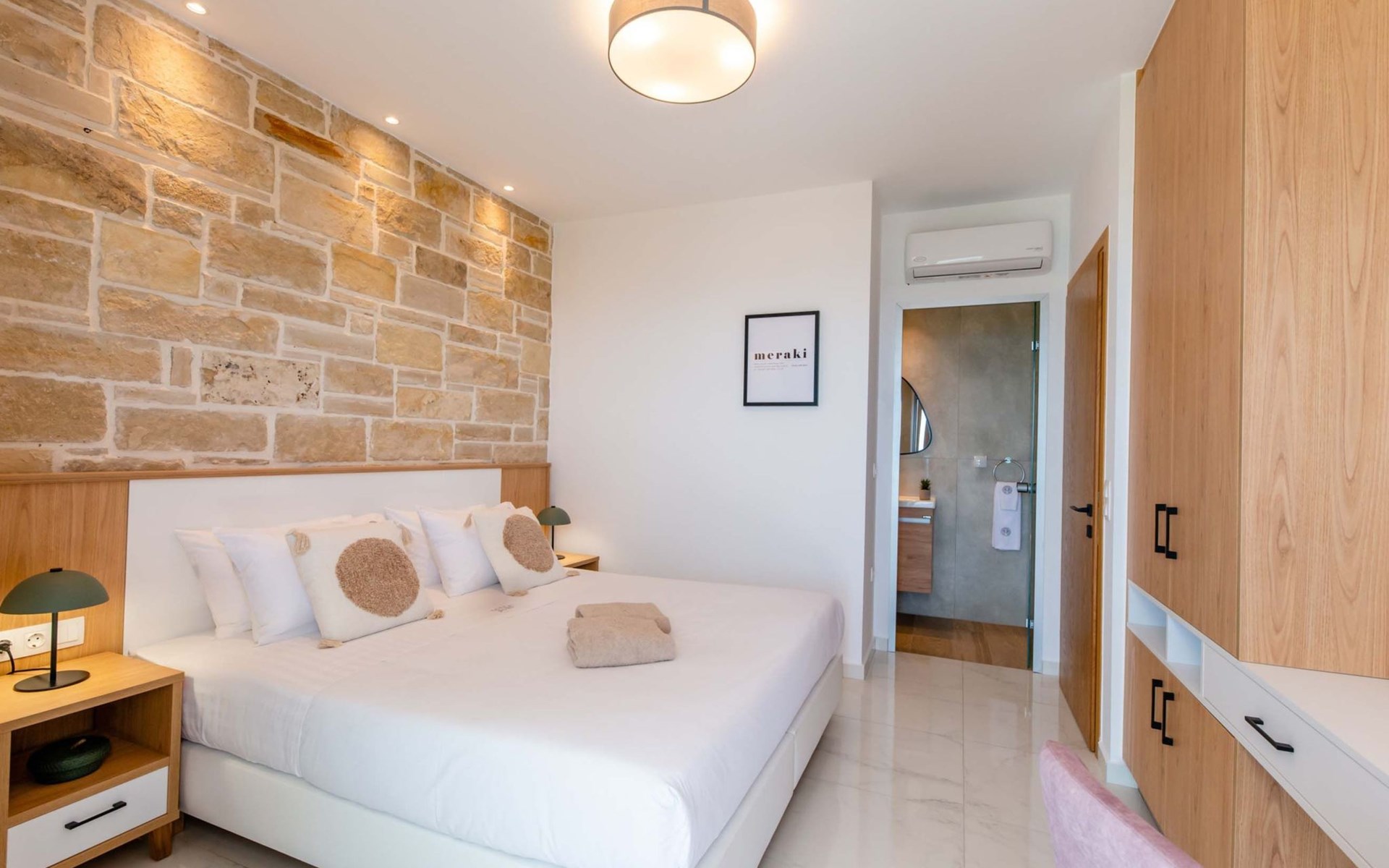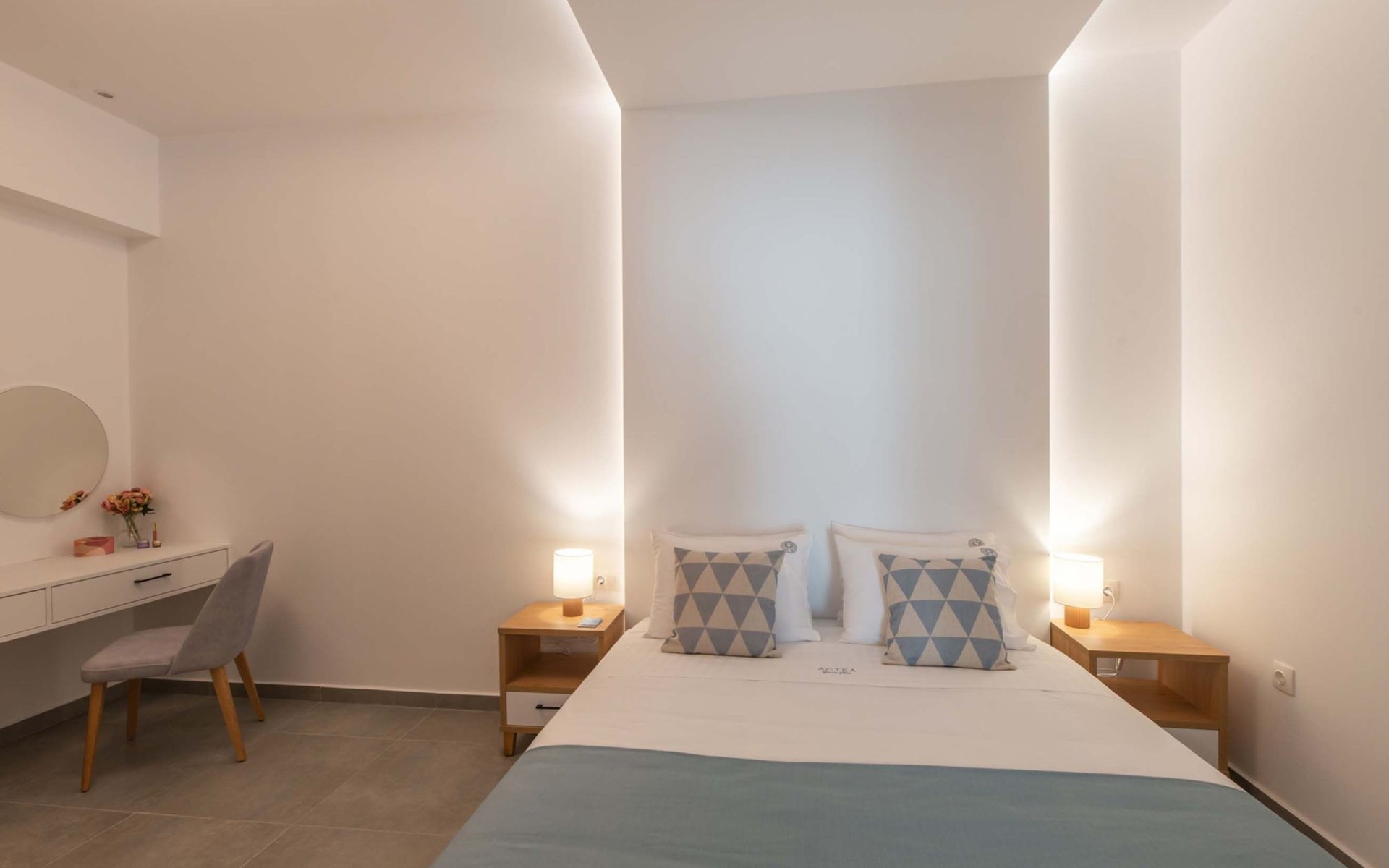 Bedroom 1: Queen-size bed (1.60x2.00), A/C, 32’’ Smart Satellite TV, ensuite bathroom with shower suitable for guests with mobility needs, hairdryer, pool access, sea view