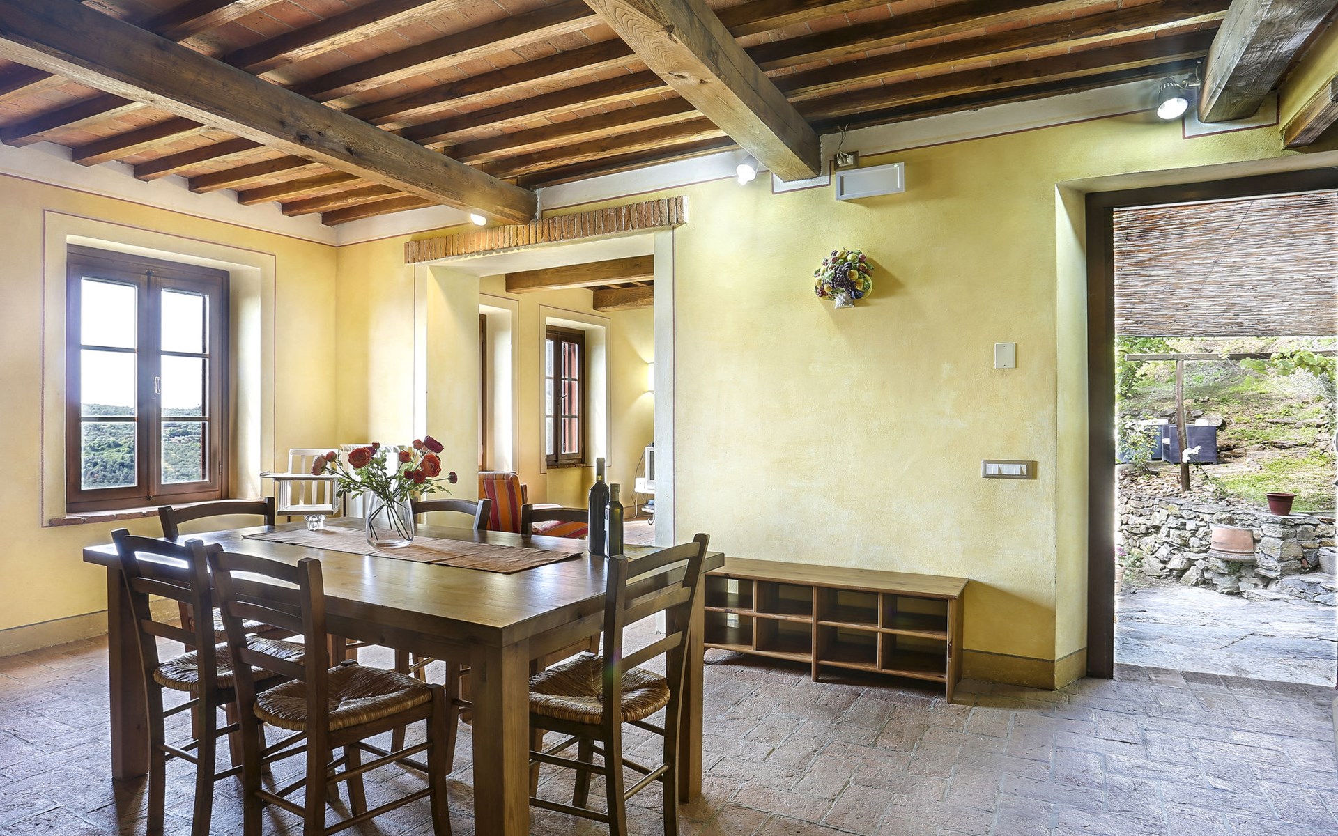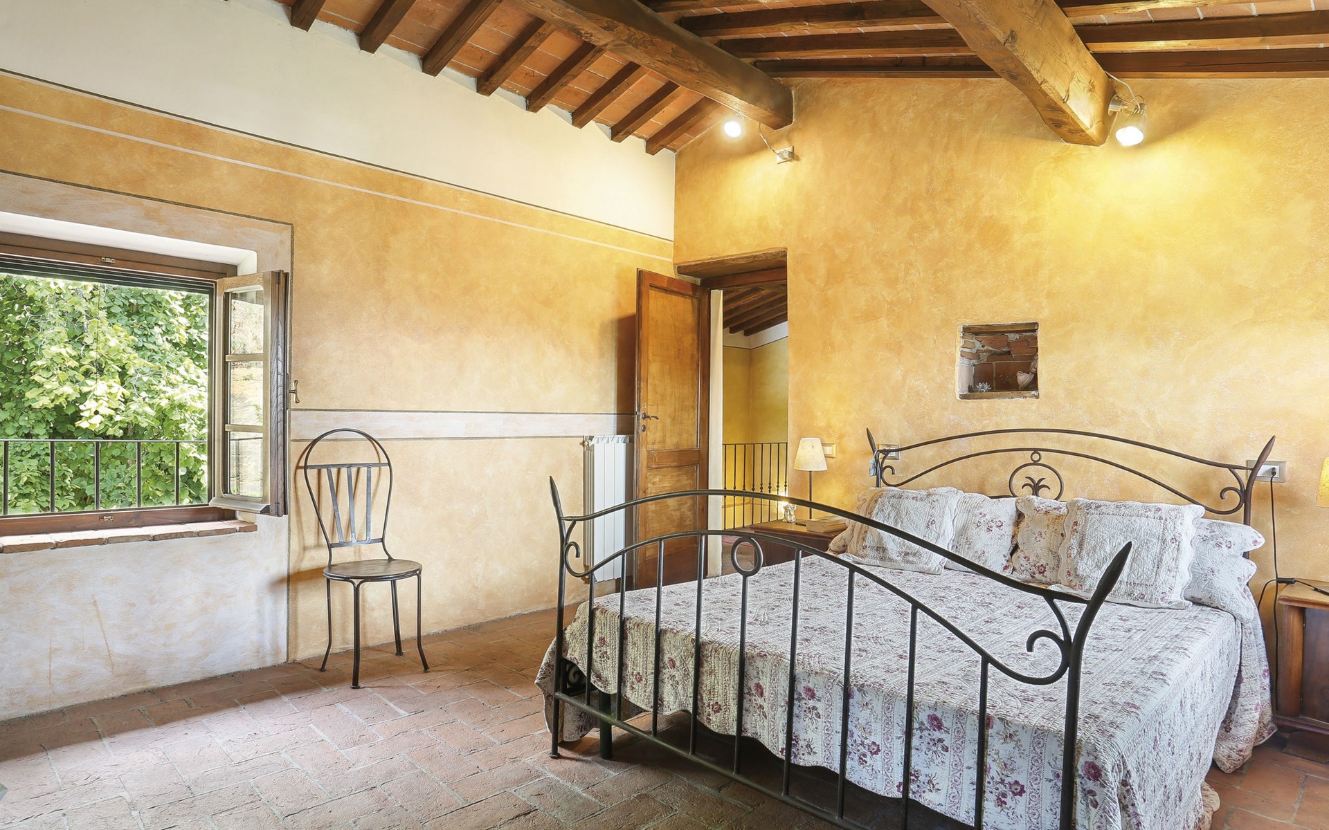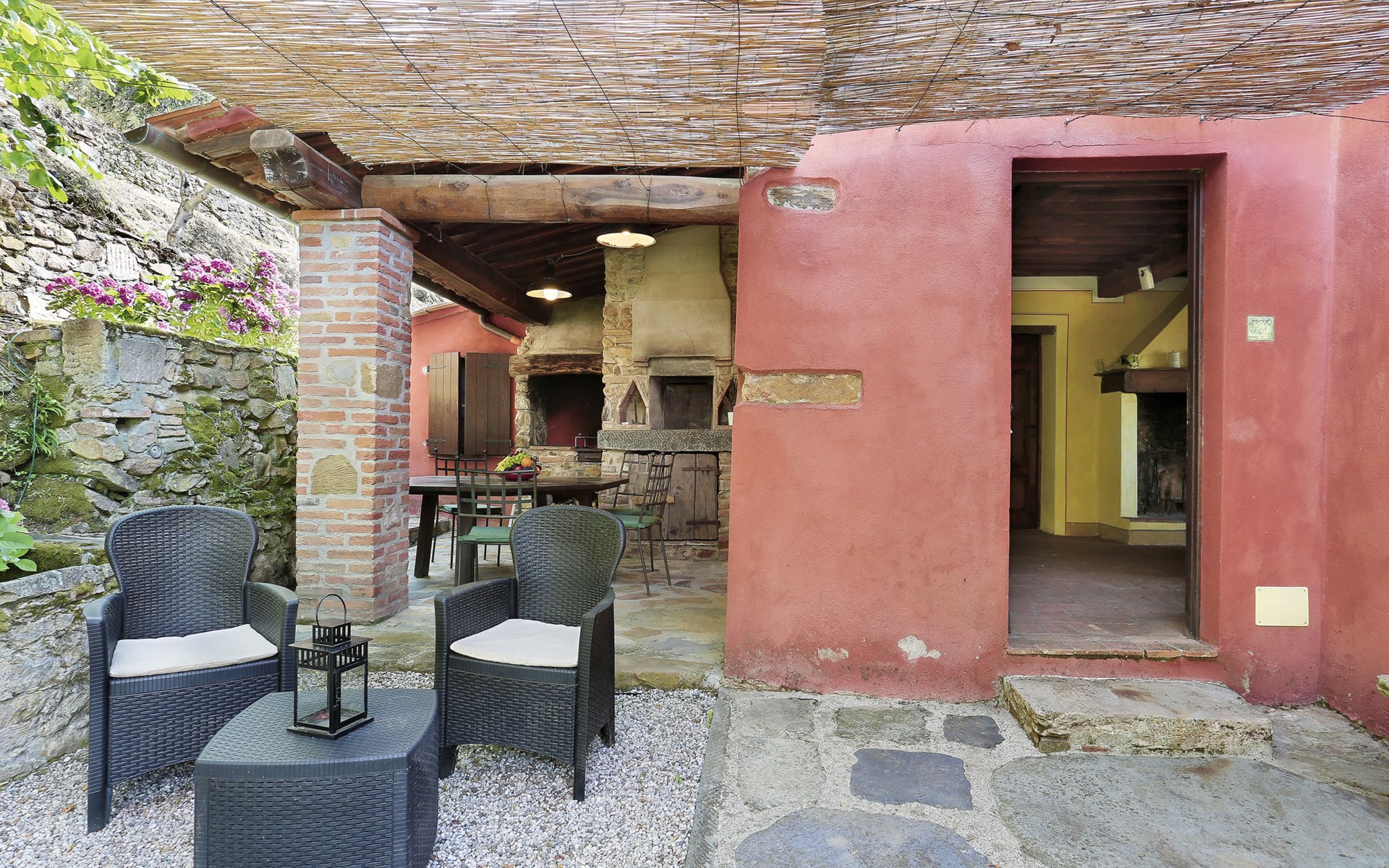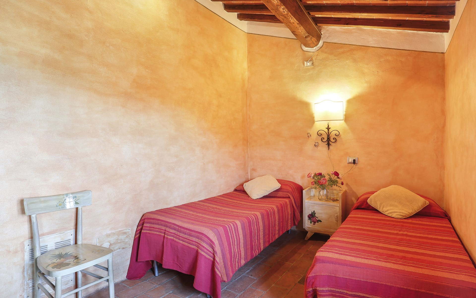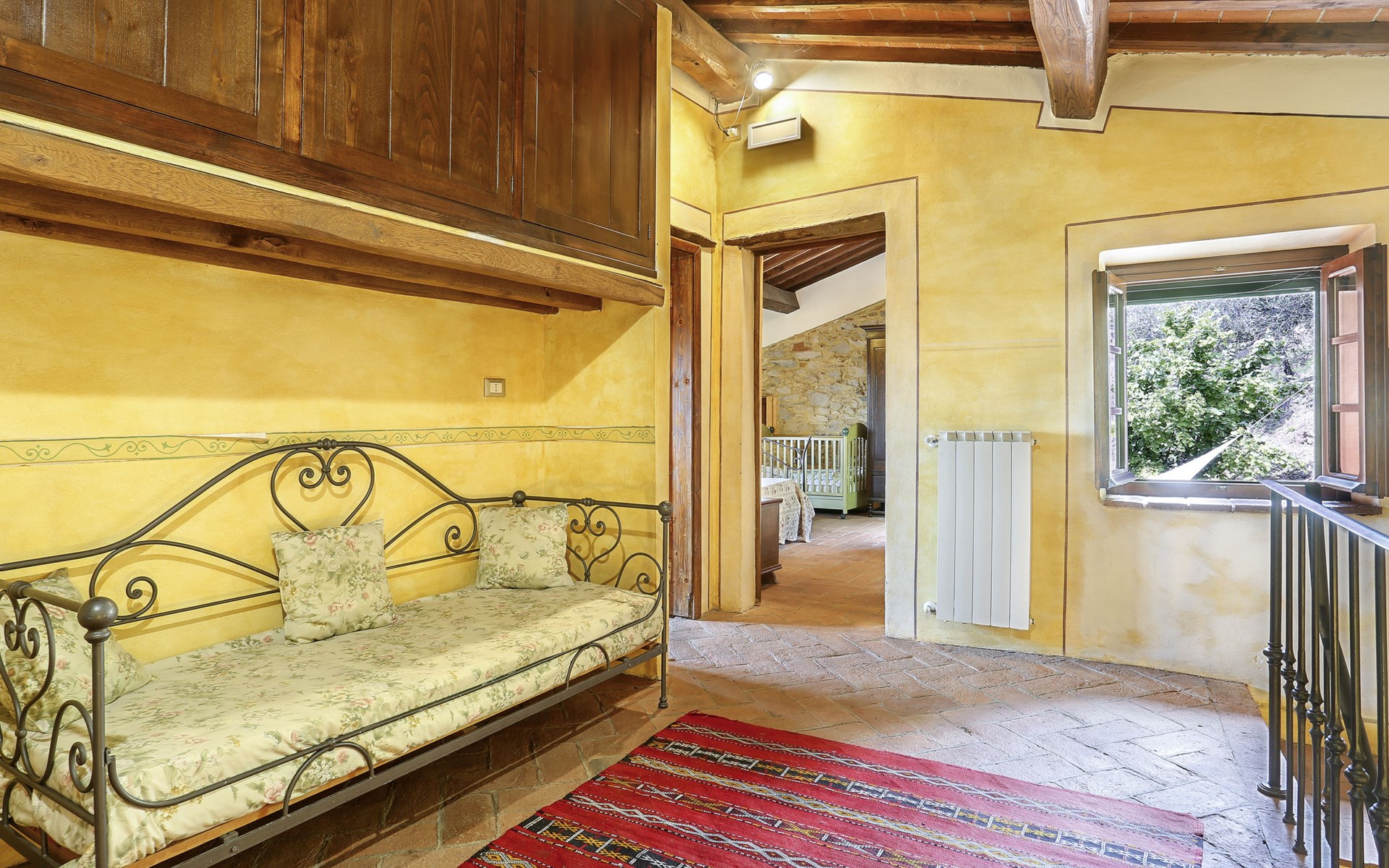 Farmhouse "San Bastiano", 160 m a.s.l., detached, renovated. 2 apartments in the property. 1 km from the centre of Buti, 24 km from the centre of Lucca, 25 km from the centre of Pisa, in a secluded position on a slope, 40 km from the sea. For shared use: property 10'000 m2 (fenced), terraced garden with trees, meadow, swimming pool (13 x 5 m, depth 116 - 240 cm, seasonal availability: 02.May. - 03.Oct.). Outdoor shower, children's playground. In the house: washing machine (for shared use). 2 km long narrow motor access (mountain road). Parking on the premises. Shop 1 km, supermarket 3.6 km, bus stop 900 m, park "Marina di Pisa" 40 km. Please note: the owner lives on the same property. Possibility of direct sale of oil on the spot.